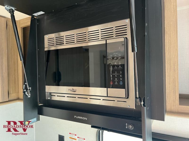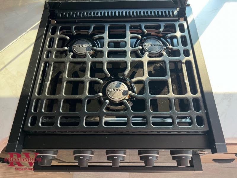 It won't be hard to find comfort in this spacious travel trailer for six! The rear U-shaped dinette includes storage space above and beside it for valuables, and the sofa within the slide out is right across from the fireplace for a cozy evening! There is also generous counter space in the full kitchen, plus an exterior camp kitchen the chef if sure to enjoy. The front master bedroom will have you feeling right at home with a custom king bed, dual wardrobes and nightstands, plus a closet for even more storage space!