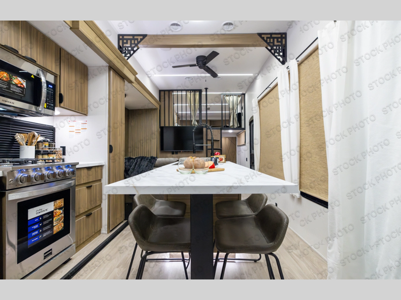 Escape to a life of luxury! The rear bathroom is a spa-like retreat for relaxing in the walk-in shower and storing linens in the closet. The Versa tilt custom King bed is perfect for sleeping like royalty, and the wardrobe/storage combo is great for organizing clothes. The kitchen allows you to keep drinks cold in the fridge, stash gear in the overhead cabinet, whip up quick bites in the microwave, and stock up in the pantry. Gather around the kitchen island for eats and hangs. The L-shaped sofa is a comfy spot to chill, and the entertainment center is perfect for fun nights in, and you can cozy up by the fireplace. A game-changing feature is that the second full bathroom is a refreshing oasis where you can enjoy the walk-in shower. Additionally, the front bedroom's a peaceful sanctuary where you can sleep comfortably on the Versa tilt custom king bed, store gear in the overhead cabinets, and enjoy entertainment on the entertainment center. The dresser is perfect for getting ready. Finally, the loft is a cozy retreat, perfect for sleeping tight on the queen mattress.