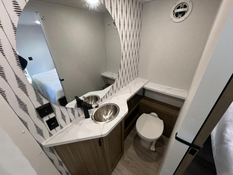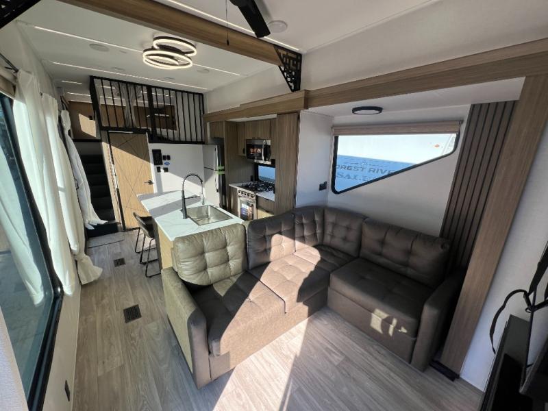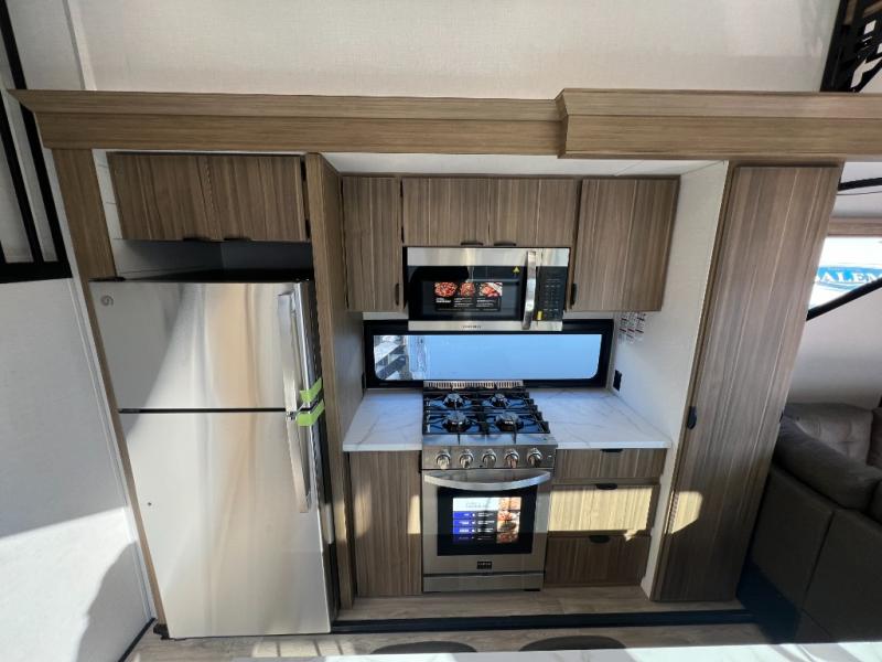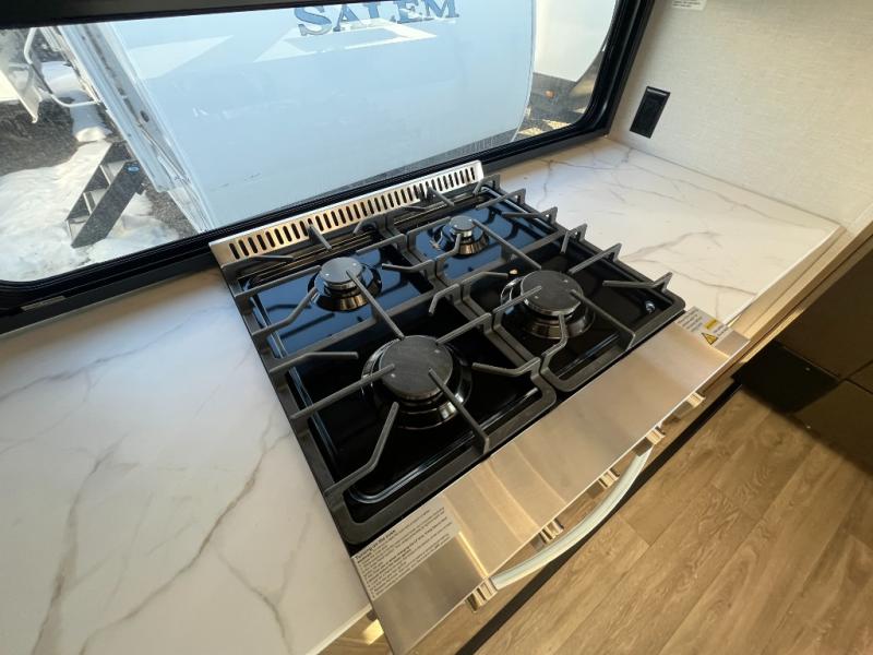 The Forest River Salem Villa Series destination trailer offers you an excellent space to relax in and rejuvenate your adventurous spirit! The 7' slide-out height is going to provide you with an open and spacious living area, and the heated and enclosed accessi-belly will protect your trailer from the elements. The Salem Villa Series comes loaded with upgraded designer furniture, a modern headboard redesign, stainless steel kitchen appliances, adjustable texture roller shades and enhanced floating shelves. There is also a few new features, including JBL speakers in the interior/exterior, a 4K blade lighting, a 60K tankless water heater, and more comforts!