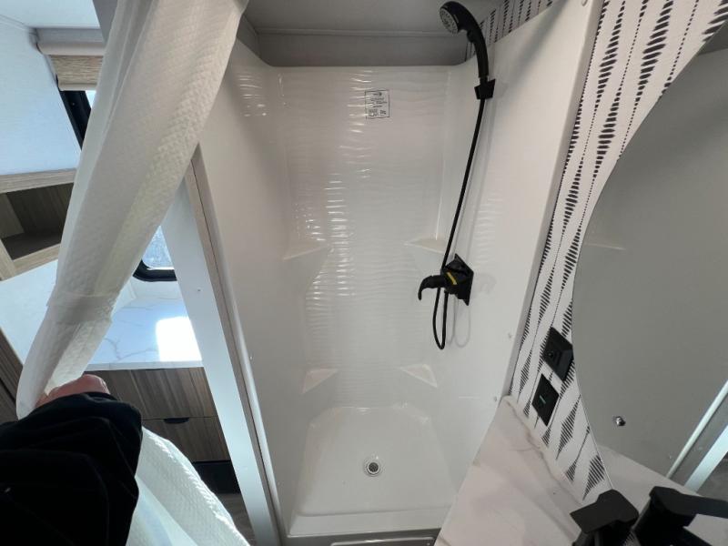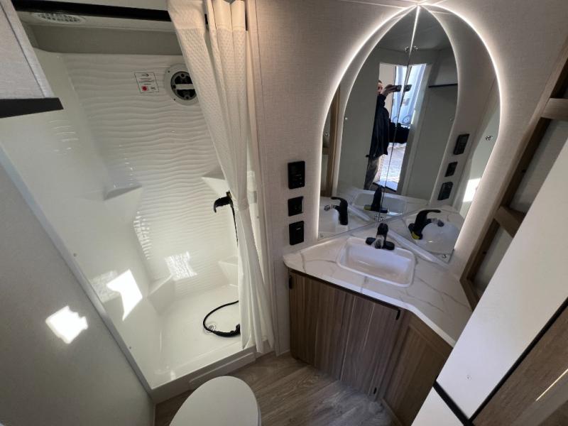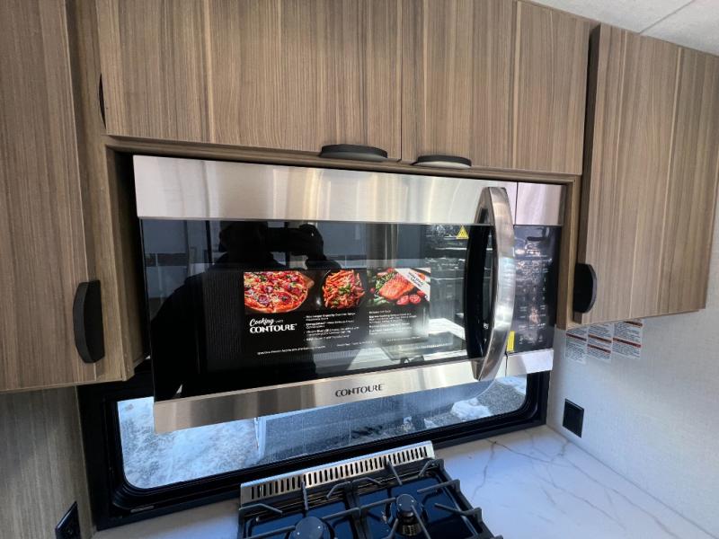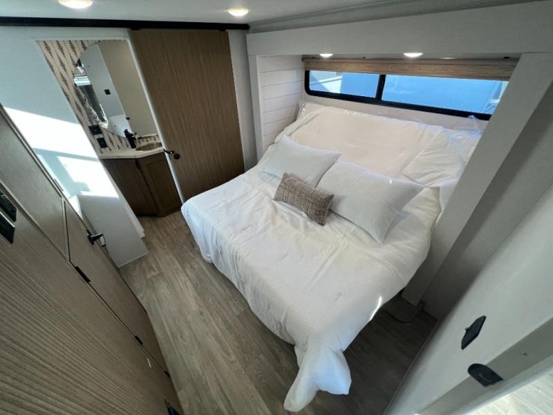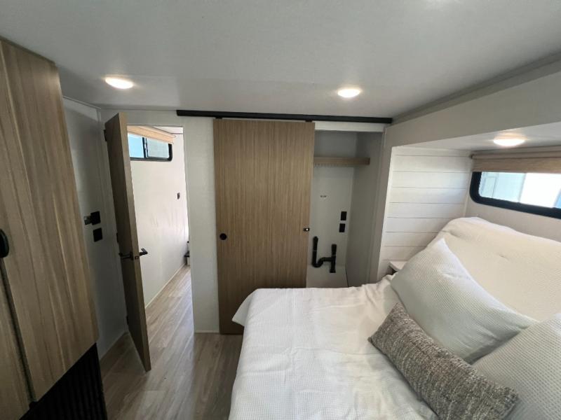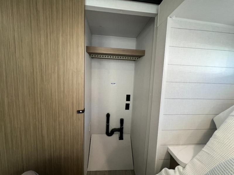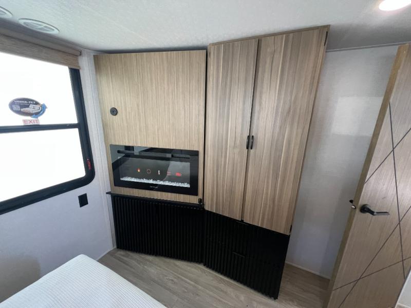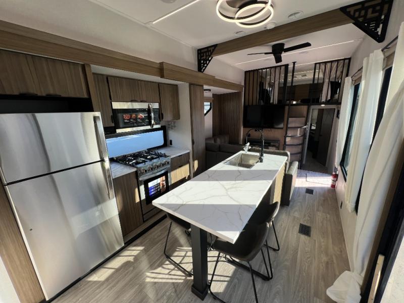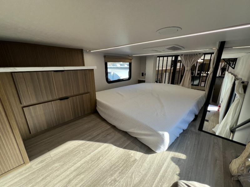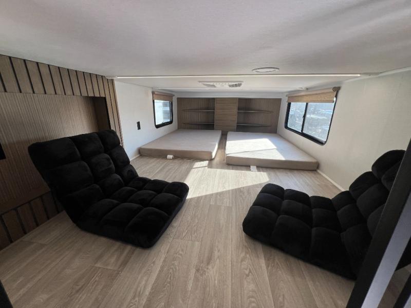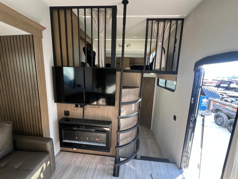 Escape to a life of luxury! The rear bathroom is a spa-like retreat for relaxing in the walk-in shower and storing linens in the closet. The Versa tilt custom King bed is perfect for sleeping like royalty, and the wardrobe/storage combo is great for organizing clothes. The kitchen allows you to keep drinks cold in the fridge, stash gear in the overhead cabinet, whip up quick bites in the microwave, and stock up in the pantry. Gather around the kitchen island for eats and hangs. The L-shaped sofa is a comfy spot to chill, and the entertainment center is perfect for fun nights in, and you can cozy up by the fireplace. A game-changing feature is that the second full bathroom is a refreshing oasis where you can enjoy the walk-in shower. Additionally, the front bedroom's a peaceful sanctuary where you can sleep comfortably on the Versa tilt custom king bed, store gear in the overhead cabinets, and enjoy entertainment on the entertainment center. The dresser is perfect for getting ready. Finally, the loft is a cozy retreat, perfect for sleeping tight on the queen mattress.