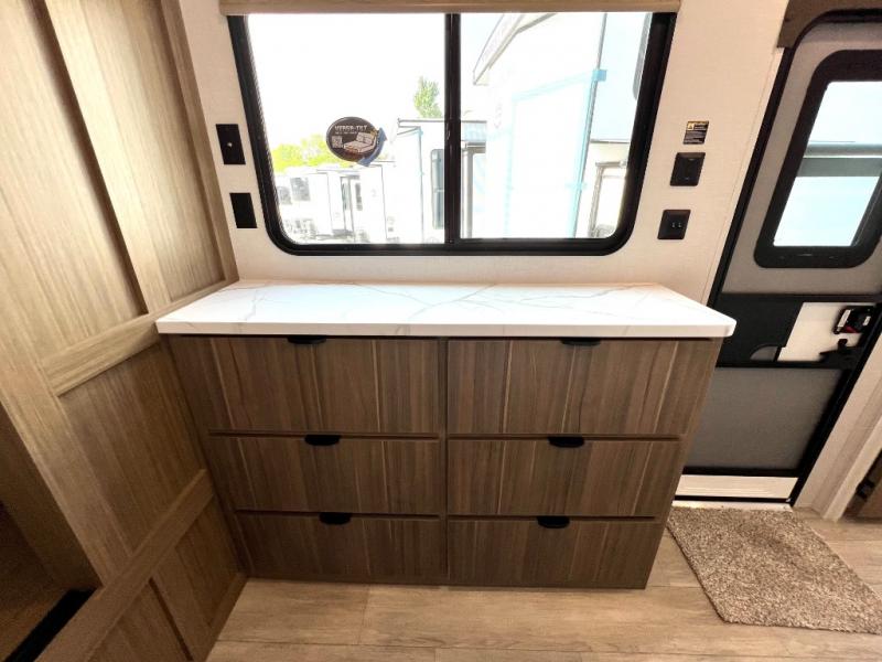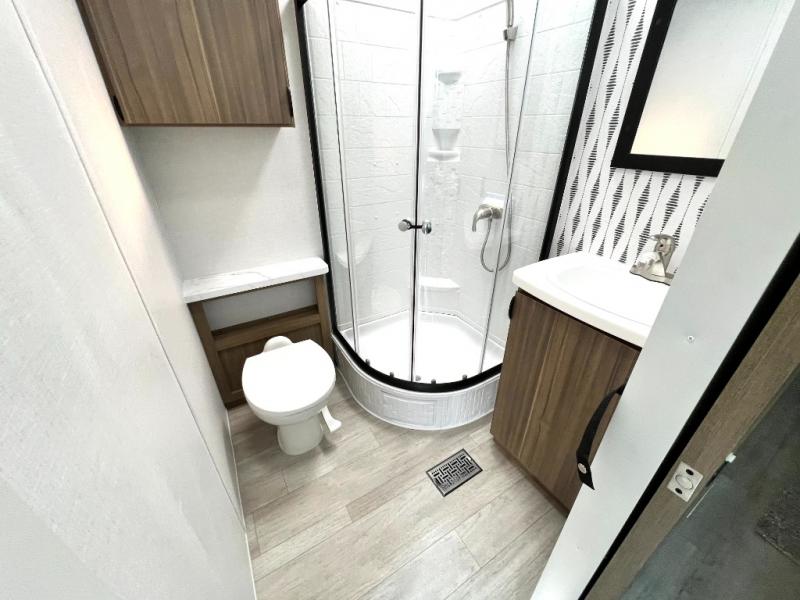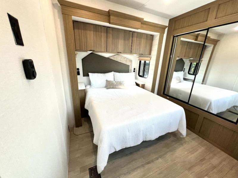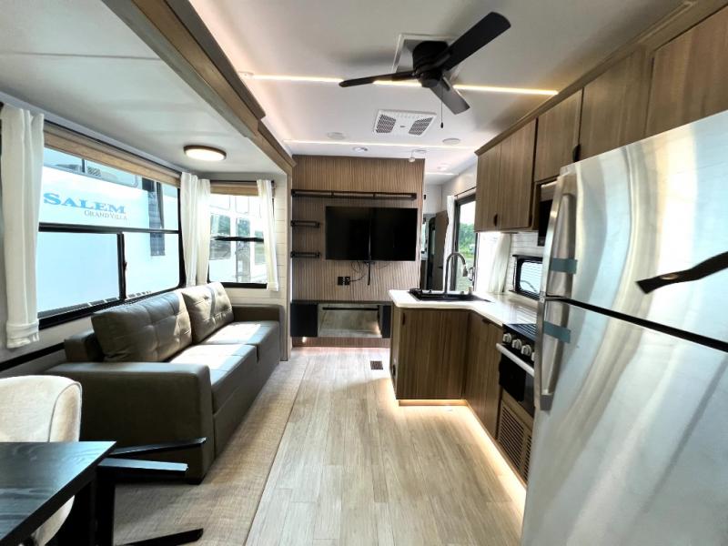 The Forest River Salem Villa Series destination trailer offers you an excellent space to relax in and rejuvenate your adventurous spirit! The 7' slide-out height is going to provide you with an open and spacious living area, and the heated and enclosed accessi-belly will protect your trailer from the elements. The Salem Villa Series comes loaded with upgraded designer furniture, a modern headboard redesign, stainless steel kitchen appliances, adjustable texture roller shades and enhanced floating shelves. There is also a few new features, including JBL speakers in the interior/exterior, a 4K blade lighting, a 60K tankless water heater, and more comforts!