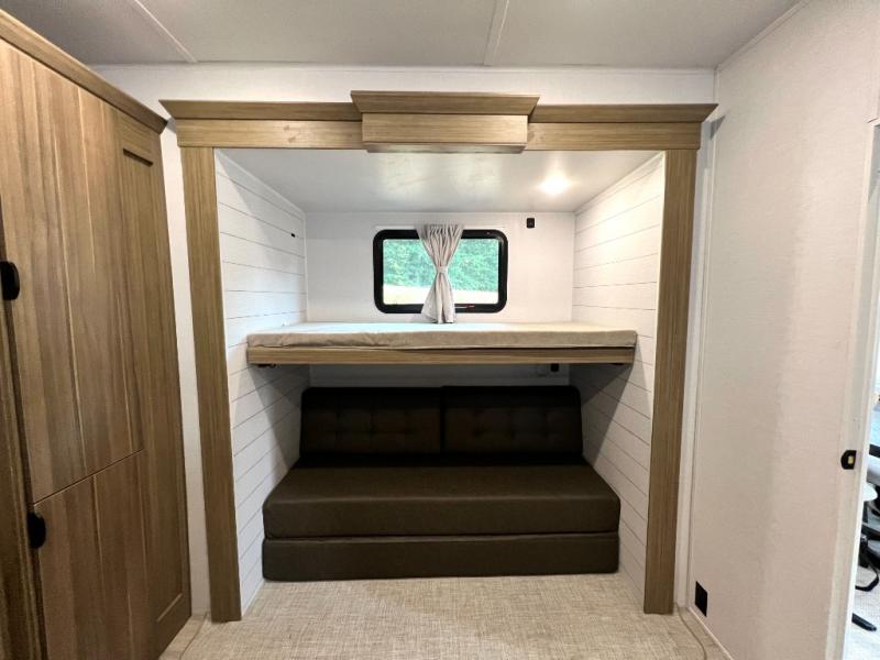Spend your weekends sleeping on your own queen-size bed in the private bedroom while your guests or children spend their time in their very own bunkhouse suite that has opposing bunk bed slides and its own half bathroom with a private exterior entry door. The kitchen provides the necessary amenities such as stainless steel appliances, a 1.6 cu. ft. oversized residential microwave, and a rainfall versa-sink. The residential refrigerator will store all your leftovers as well. You can dine and play games on the tri-fold sofa o even the table with chairs. On top of all of that, you will also be able to unwind in front of a cozy fireplace each night before you head to bed and drift off dreaming of the new day of adventure coming!