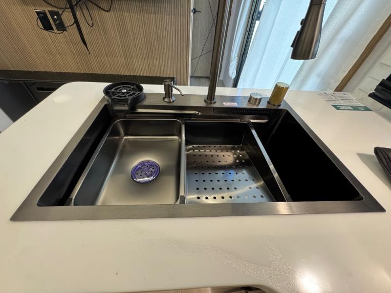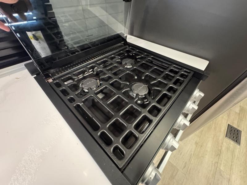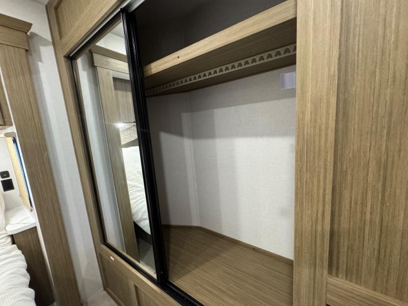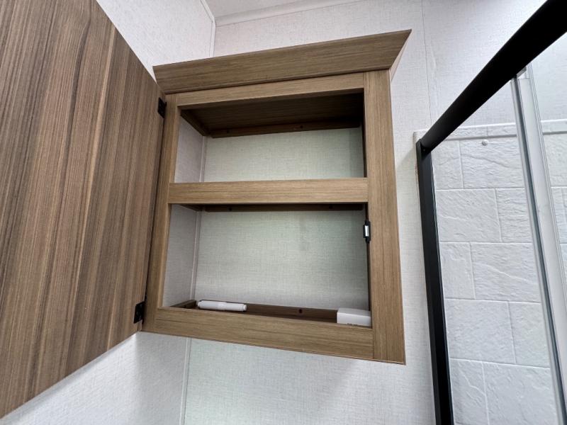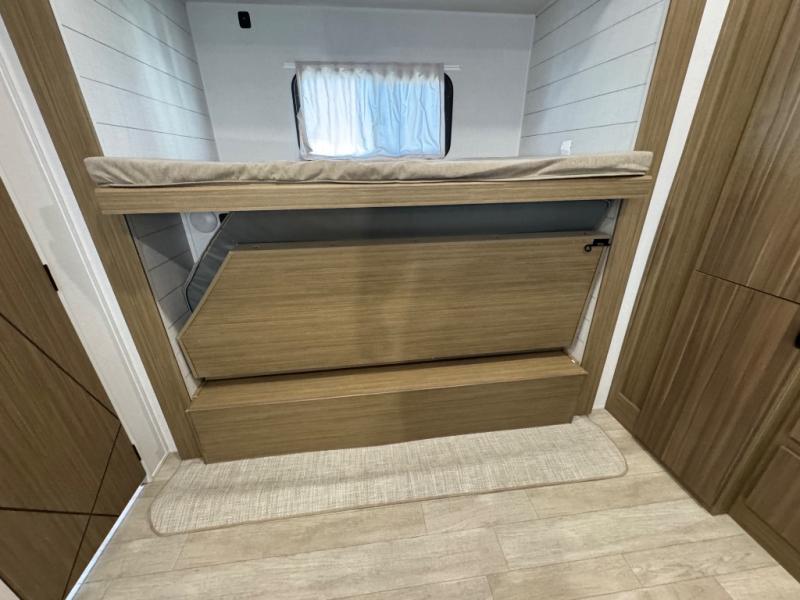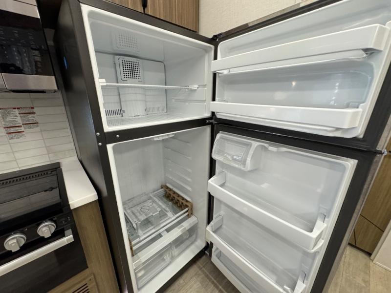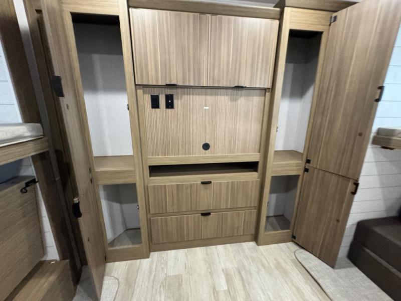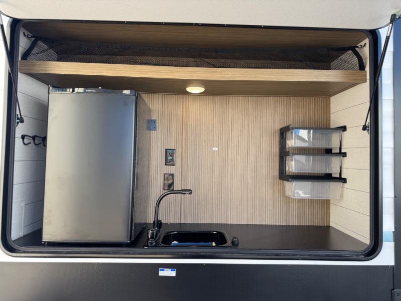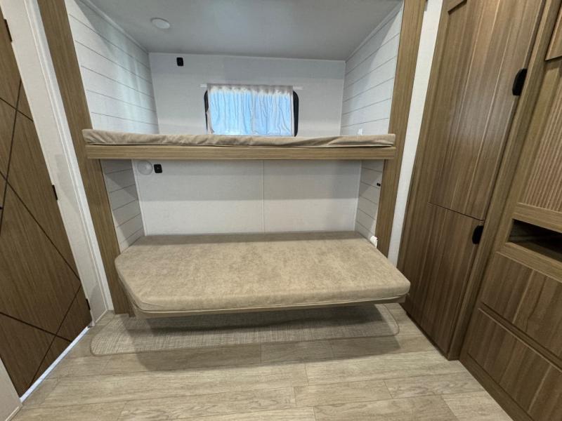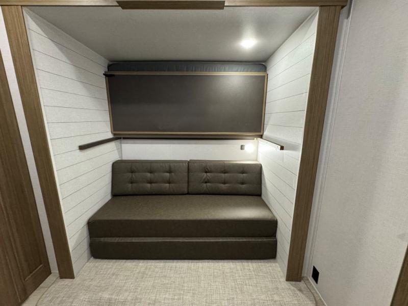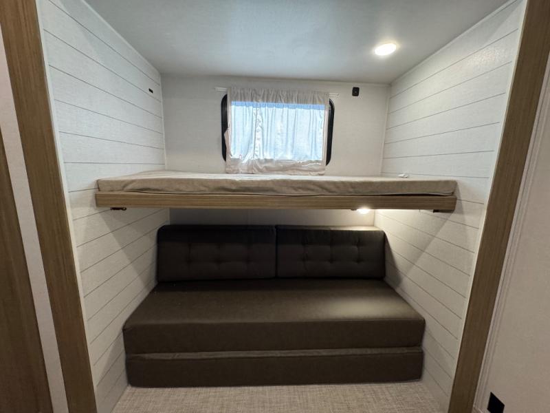 Spend your weekends sleeping on your own queen-size bed in the private bedroom while your guests or children spend their time in their very own bunkhouse suite that has opposing bunk bed slides and its own half bathroom with a private exterior entry door. The kitchen provides the necessary amenities such as stainless steel appliances, a 1.6 cu. ft. oversized residential microwave, and a rainfall versa-sink. The residential refrigerator will store all your leftovers as well. You can dine and play games on the tri-fold sofa o even the table with chairs. On top of all of that, you will also be able to unwind in front of a cozy fireplace each night before you head to bed and drift off dreaming of the new day of adventure coming!