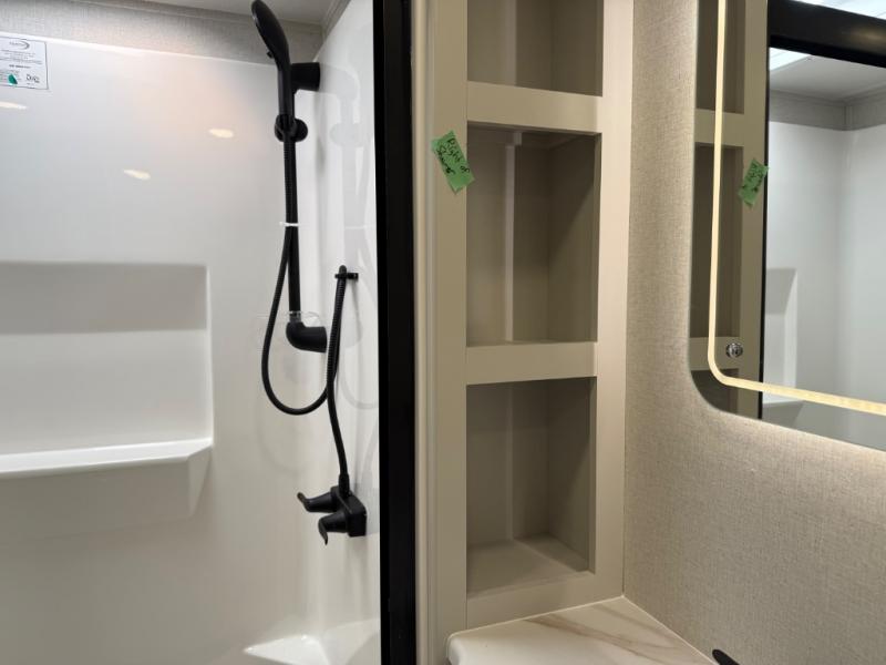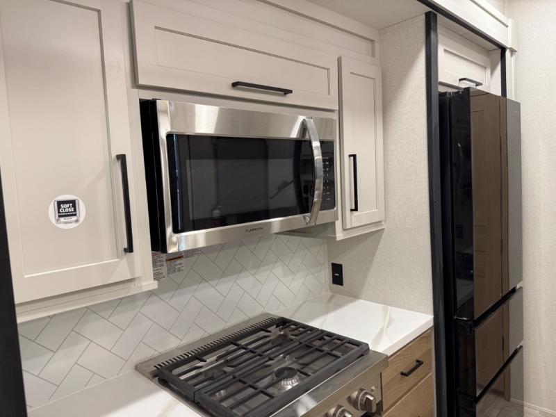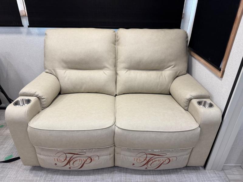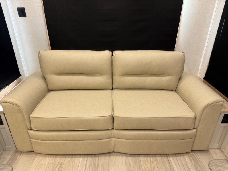 Weekend camping trips and full-time RV living is made complete in this triple slide out fifth wheel. Your crew can relax under the 16' electric awning while lunch is being made on the exterior flat top cooktop, or head inside to enjoy the rear living area. There is also a 50" flat screen TV here across from the theater seating, plus a tri-fold sofa and a free-standing dinette to dine at. And the chef will love the hidden pantry behind the entertainment center! The spacious full bath includes a walk-in shower with a seat for your comfort, and the front private bedroom will feel just like home with its king bed and large front wardrobe. There is even washer and dryer prep to make laundry day easier than ever.