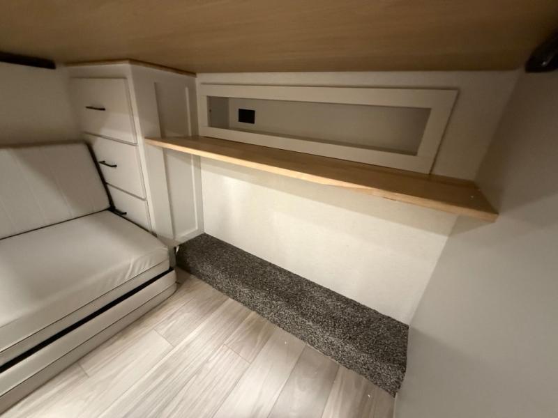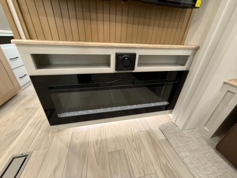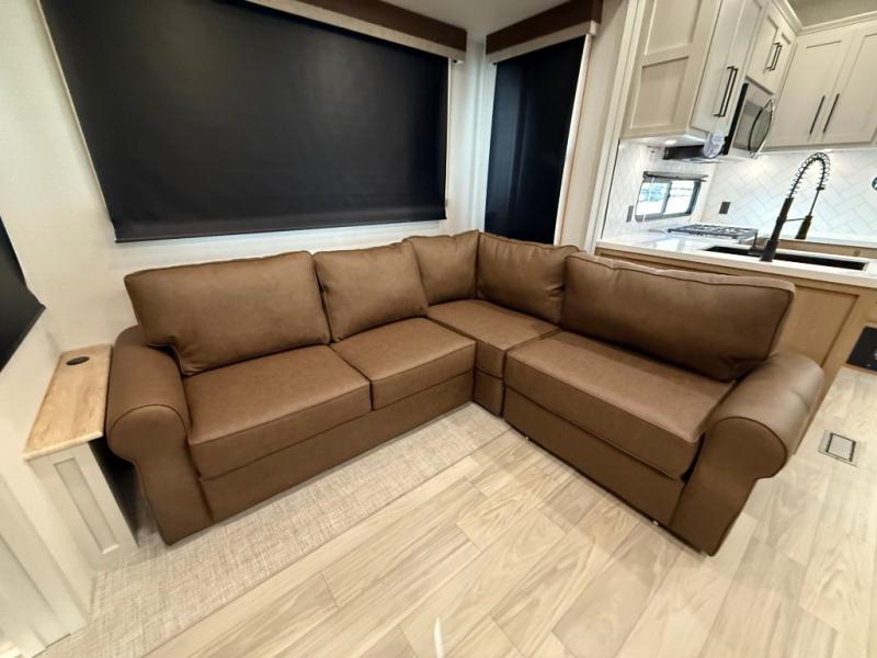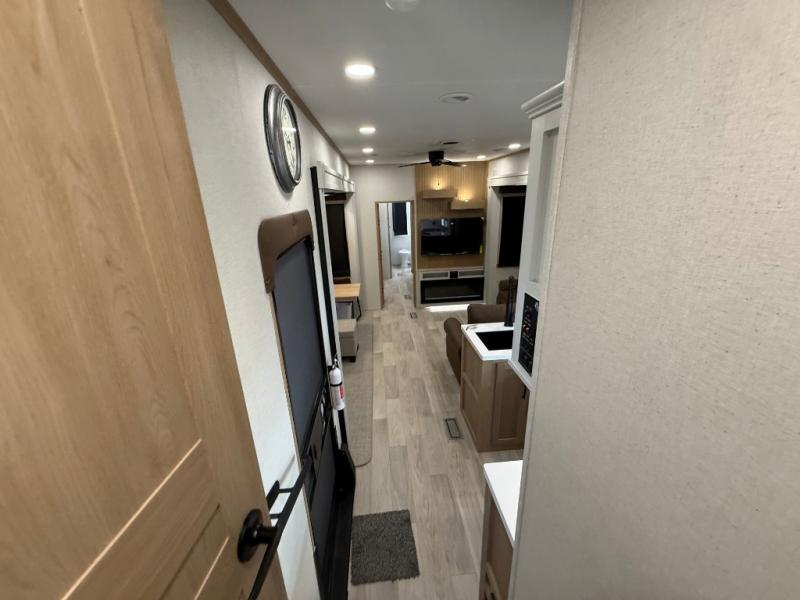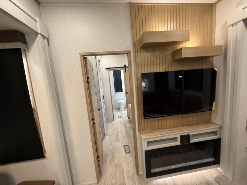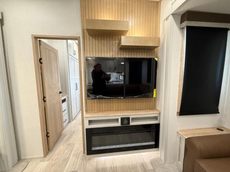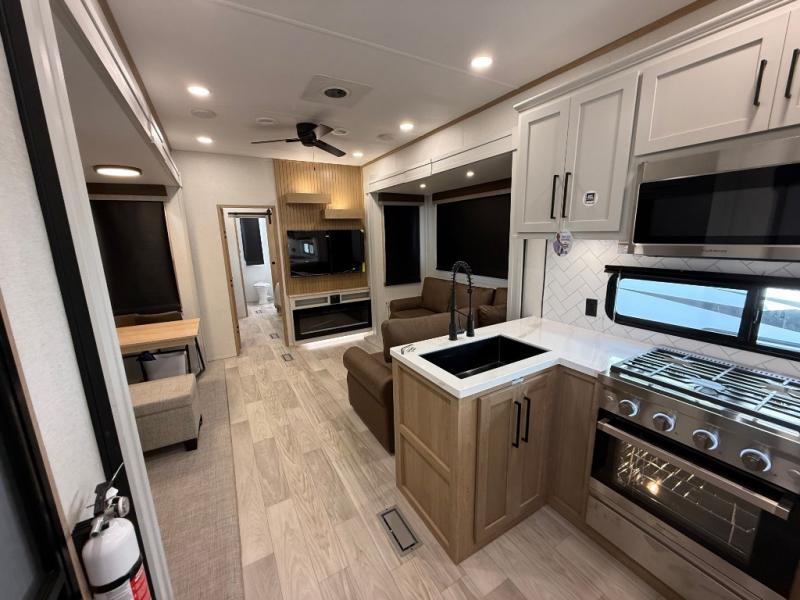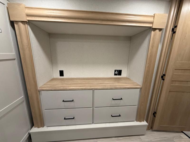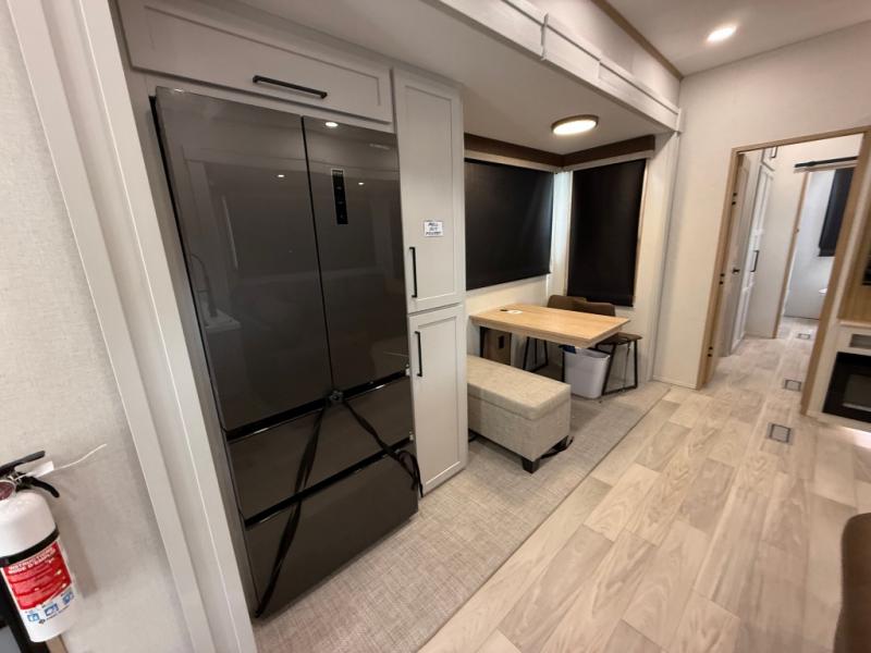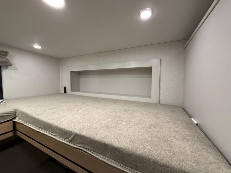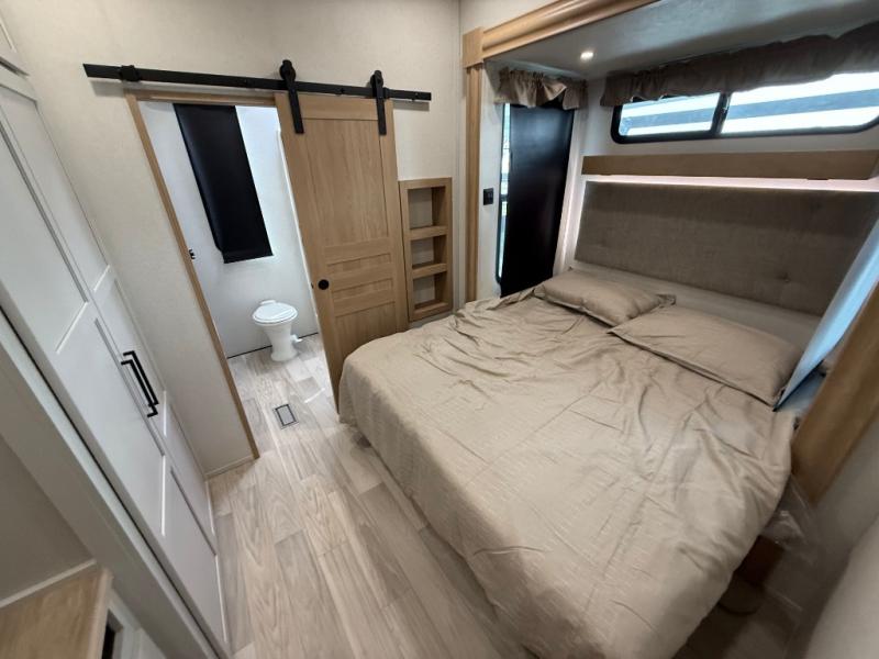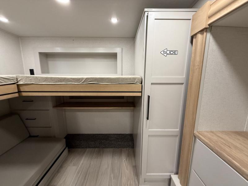 This fifth wheel is thoughtfully designed for comfort and convenience, starting with a spacious front bunkhouse perfect for accommodating guests. It features two flip-up bunks, 28" x 74" and 32" x 74" and a 60" x 74" fold-out lounge, along with a wardrobe, dresser, and additional storage to keep essentials organized. A nearby half bath adds easy access and extra convenience. At the center of the unit, the kitchen offers everything you need to prepare meals, including a stainless-steel sink, three-burner cooktop, and a generous 16 cu. ft. refrigerator. Meals can be enjoyed at the free-standing dinette, or you can unwind on the sectional sofa while enjoying the fireplace or entertainment center. At the rear, you'll find the private main bedroom with a roomy 66" x 80" RV king bed, plus its own wardrobe and dresser. Just steps away is the full bathroom featuring a one-piece fiberglass shower, sink with medicine cabinet, linen storage, and even washer/dryer prep for extended stays.