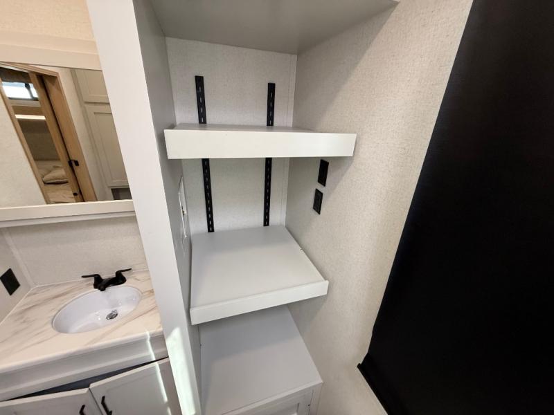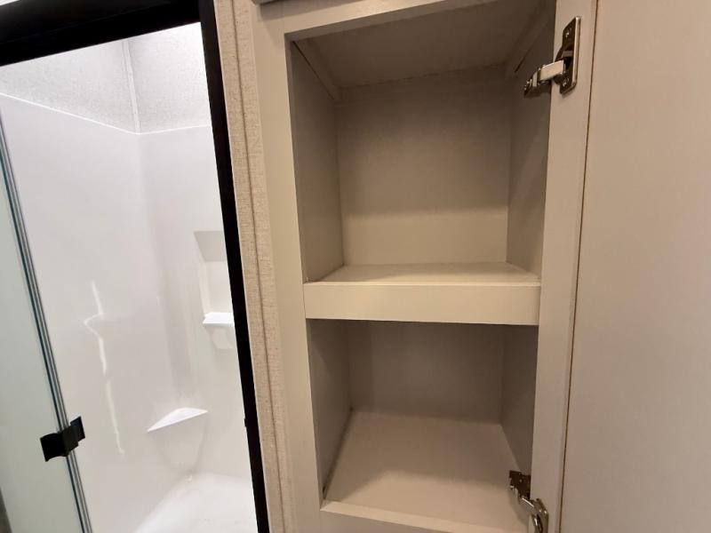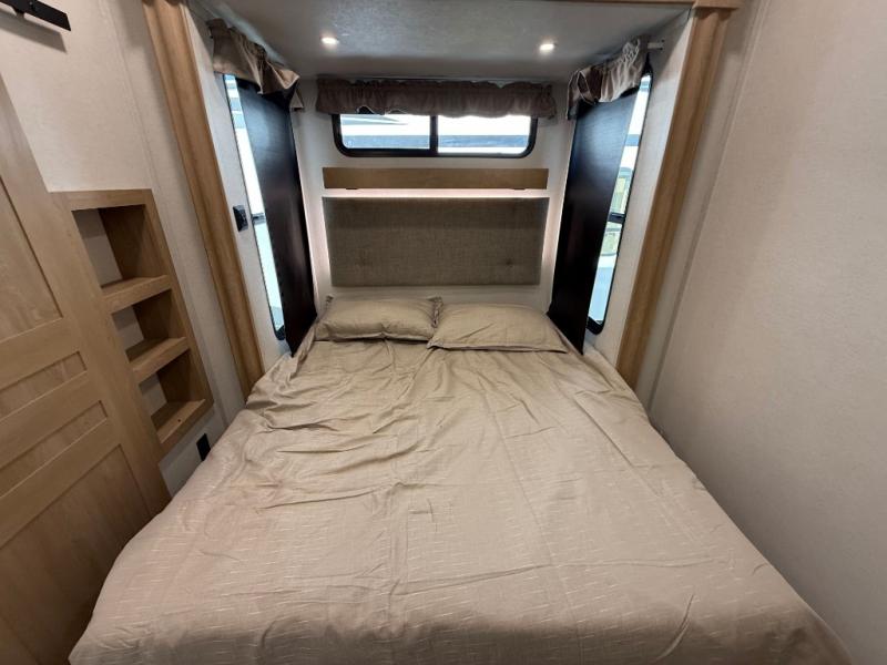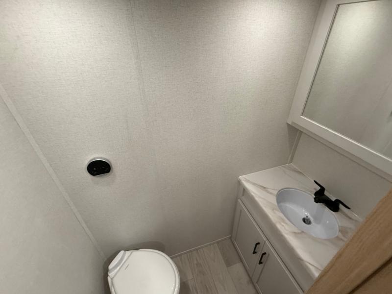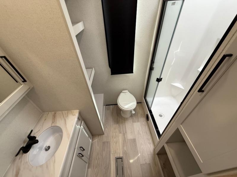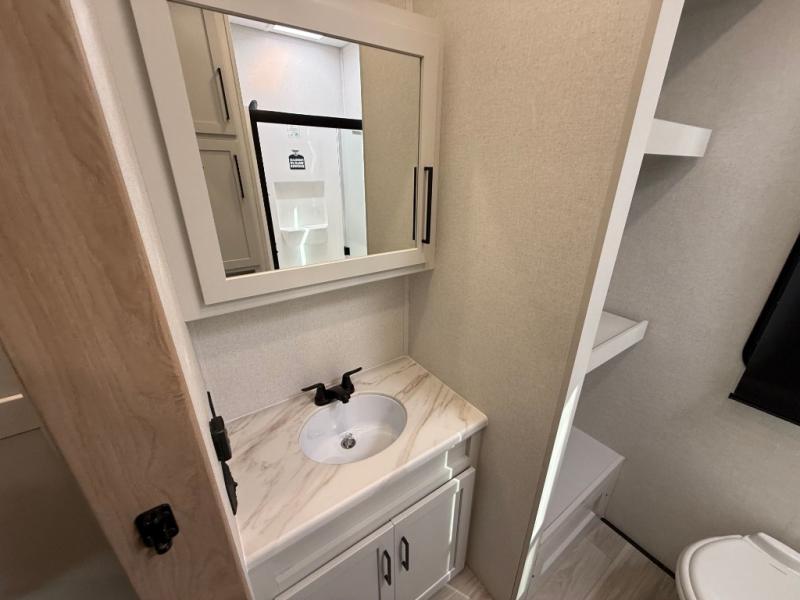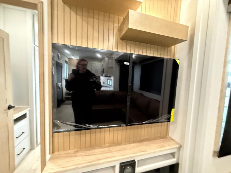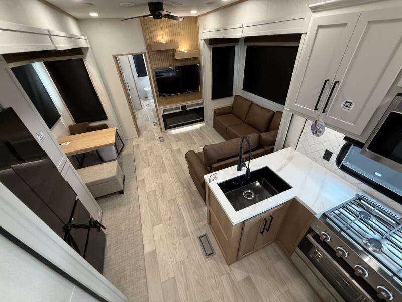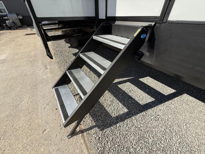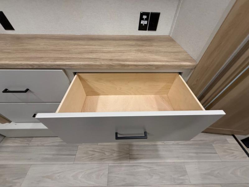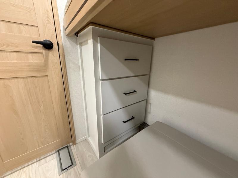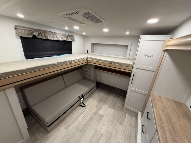 This fifth wheel is thoughtfully designed for comfort and convenience, starting with a spacious front bunkhouse perfect for accommodating guests. It features two flip-up bunks, 28" x 74" and 32" x 74" and a 60" x 74" fold-out lounge, along with a wardrobe, dresser, and additional storage to keep essentials organized. A nearby half bath adds easy access and extra convenience. At the center of the unit, the kitchen offers everything you need to prepare meals, including a stainless-steel sink, three-burner cooktop, and a generous 16 cu. ft. refrigerator. Meals can be enjoyed at the free-standing dinette, or you can unwind on the sectional sofa while enjoying the fireplace or entertainment center. At the rear, you'll find the private main bedroom with a roomy 66" x 80" RV king bed, plus its own wardrobe and dresser. Just steps away is the full bathroom featuring a one-piece fiberglass shower, sink with medicine cabinet, linen storage, and even washer/dryer prep for extended stays.