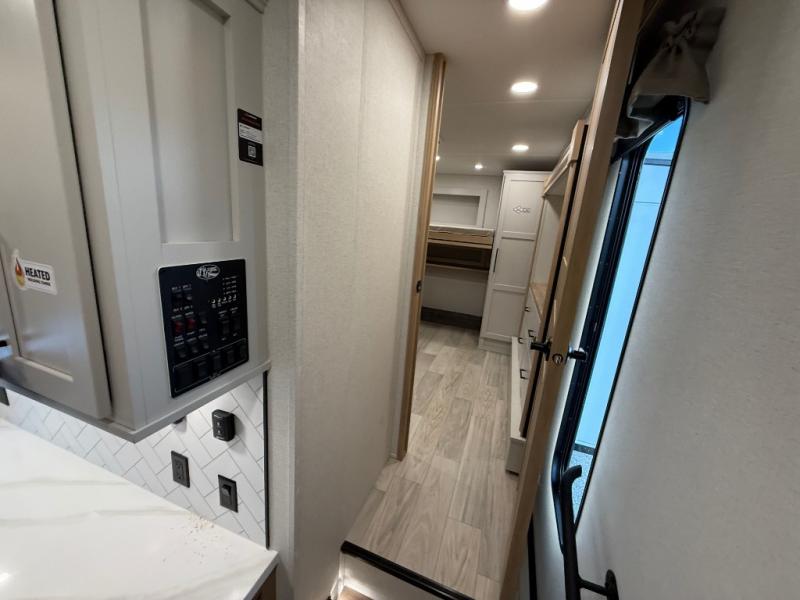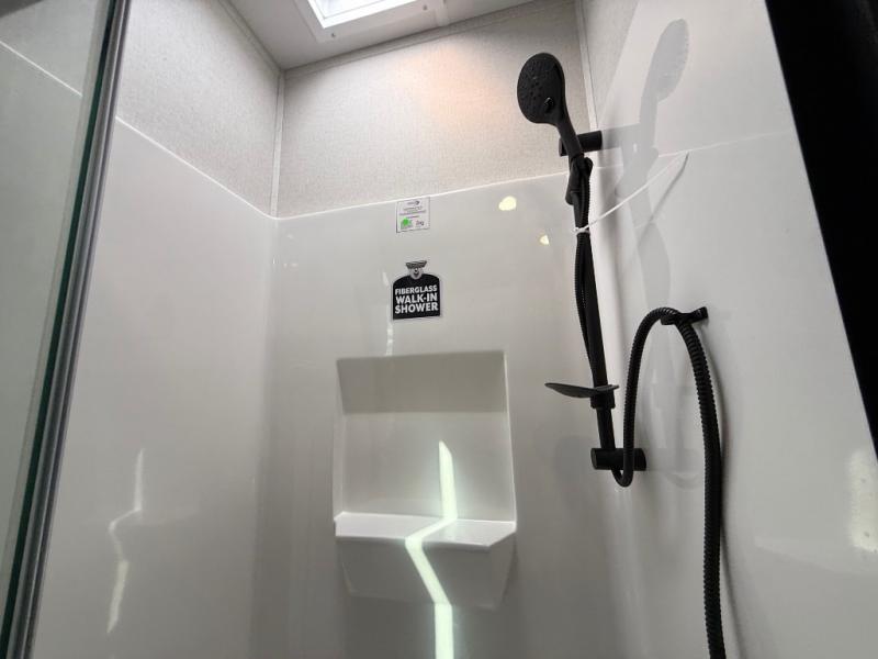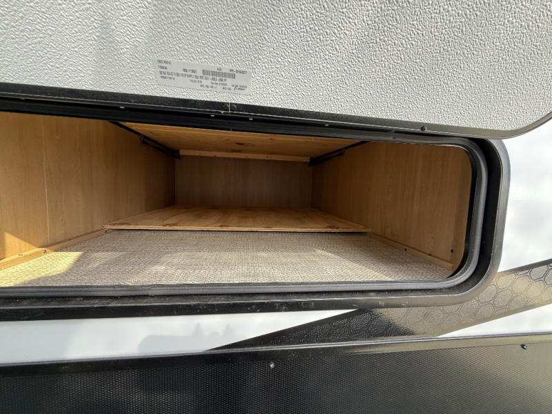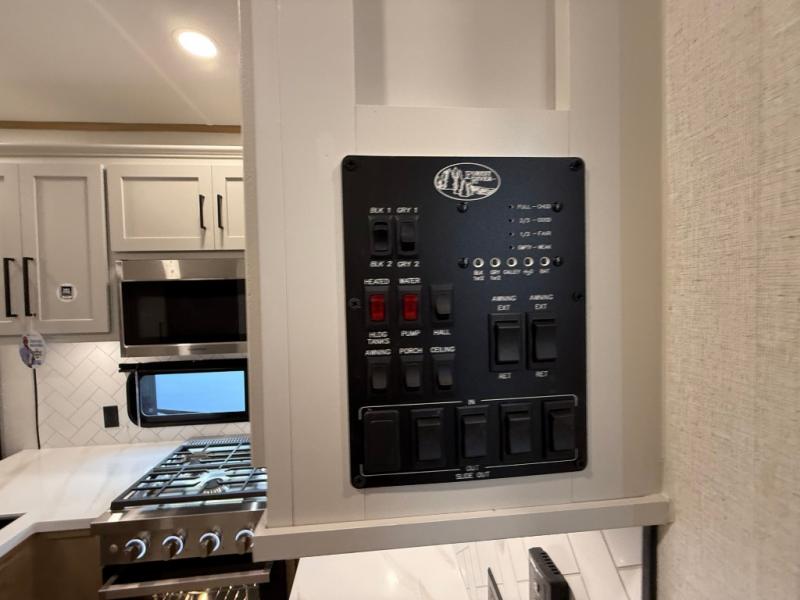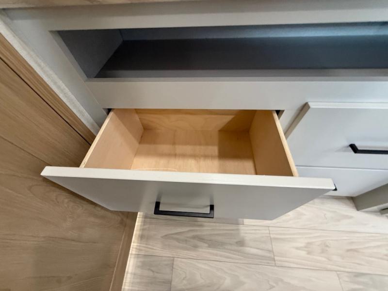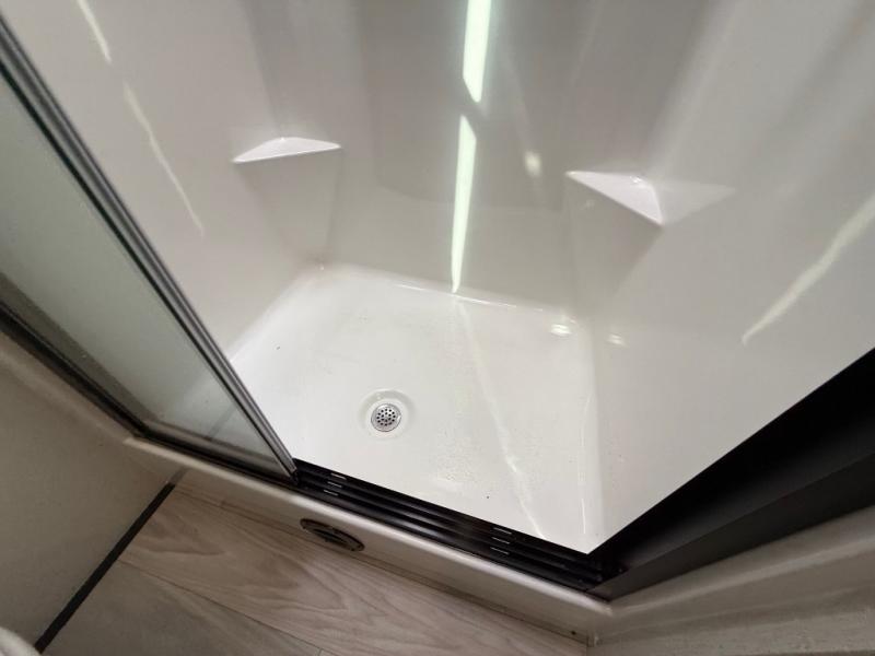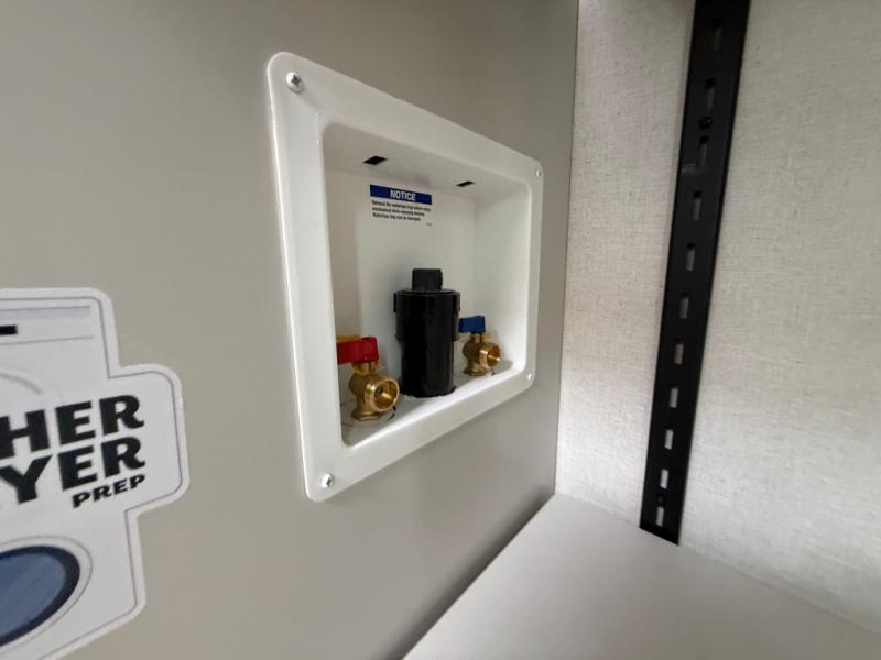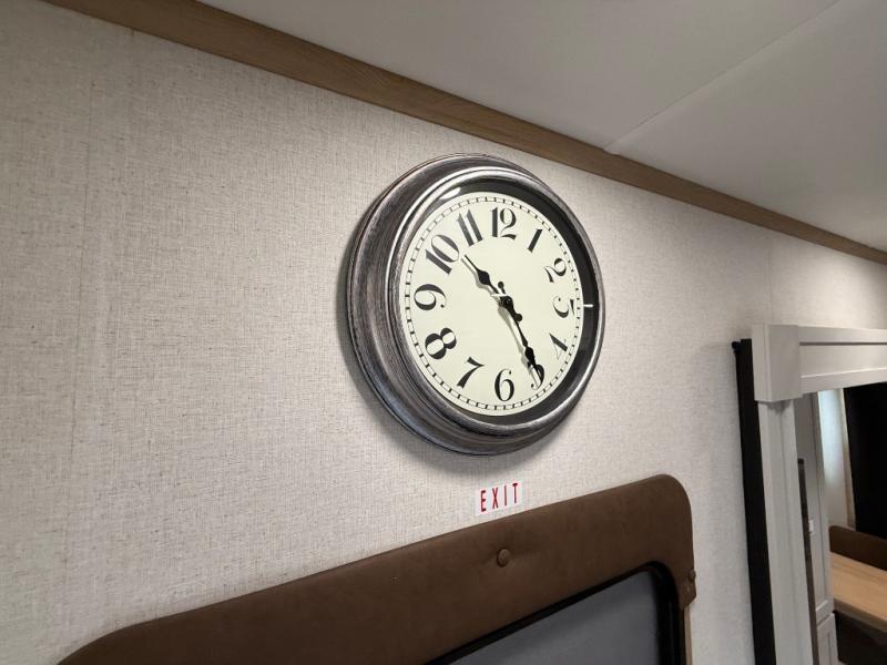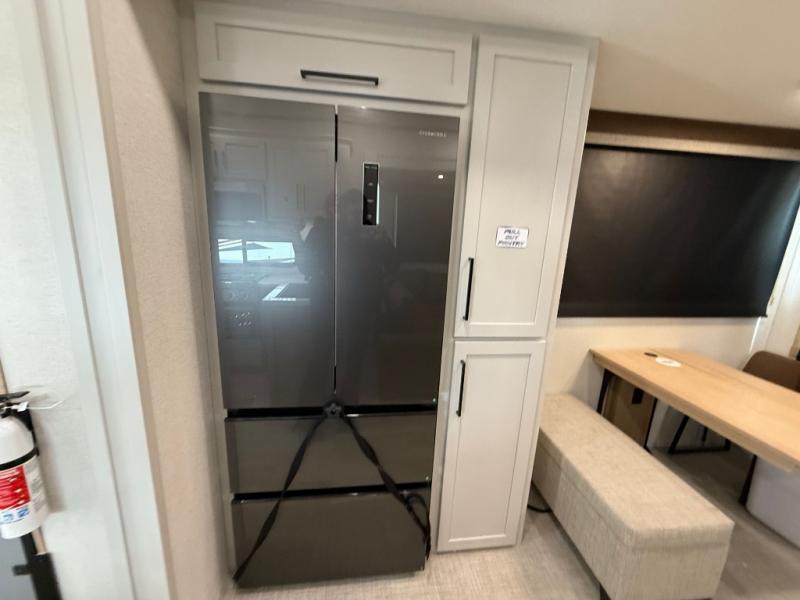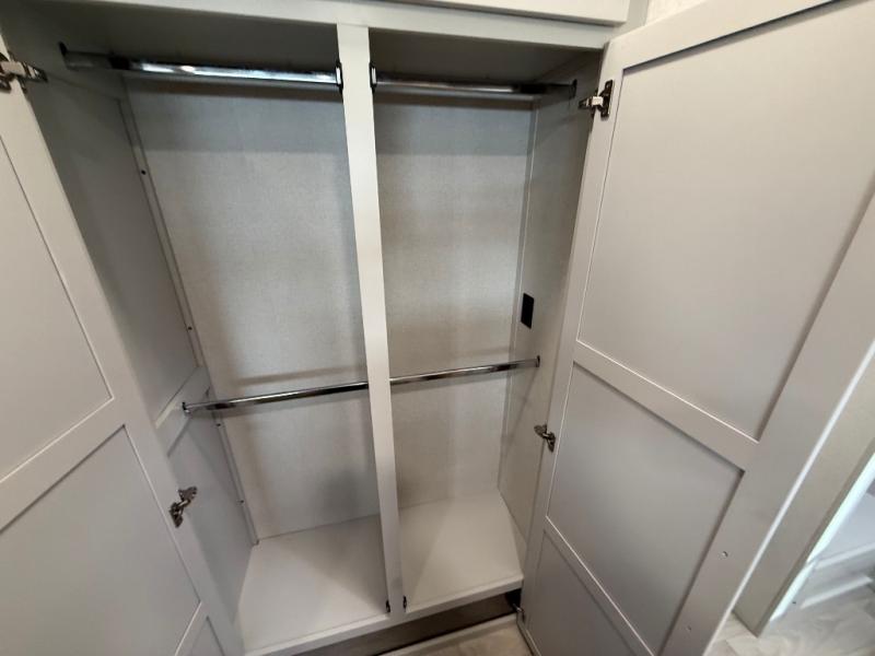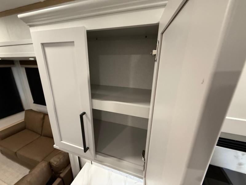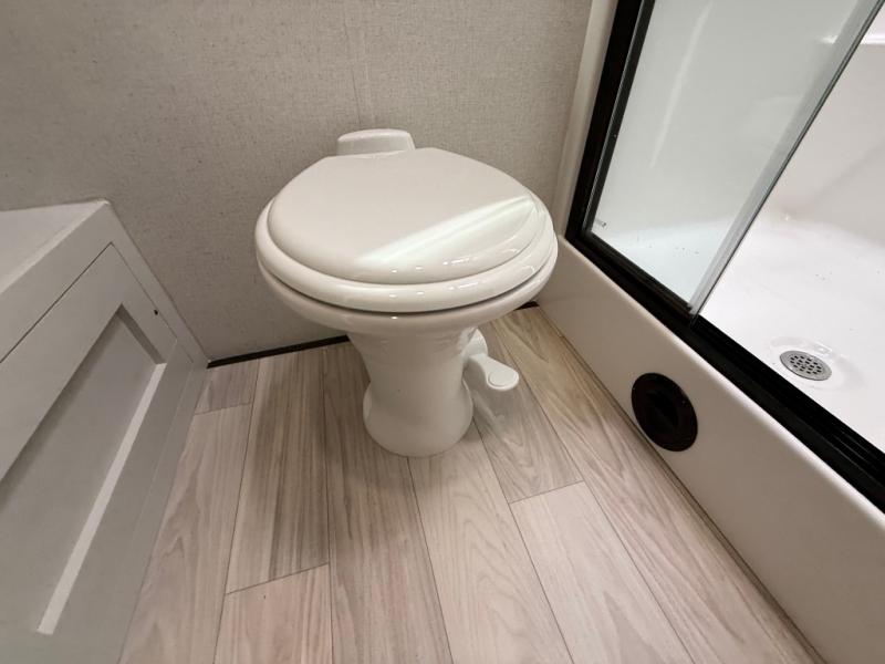 This fifth wheel is thoughtfully designed for comfort and convenience, starting with a spacious front bunkhouse perfect for accommodating guests. It features two flip-up bunks, 28" x 74" and 32" x 74" and a 60" x 74" fold-out lounge, along with a wardrobe, dresser, and additional storage to keep essentials organized. A nearby half bath adds easy access and extra convenience. At the center of the unit, the kitchen offers everything you need to prepare meals, including a stainless-steel sink, three-burner cooktop, and a generous 16 cu. ft. refrigerator. Meals can be enjoyed at the free-standing dinette, or you can unwind on the sectional sofa while enjoying the fireplace or entertainment center. At the rear, you'll find the private main bedroom with a roomy 66" x 80" RV king bed, plus its own wardrobe and dresser. Just steps away is the full bathroom featuring a one-piece fiberglass shower, sink with medicine cabinet, linen storage, and even washer/dryer prep for extended stays.