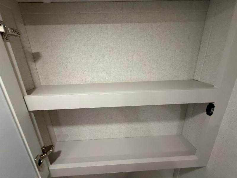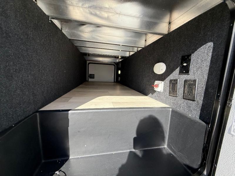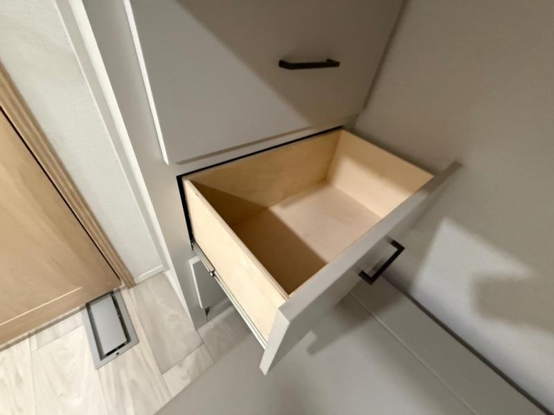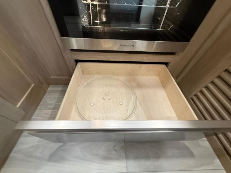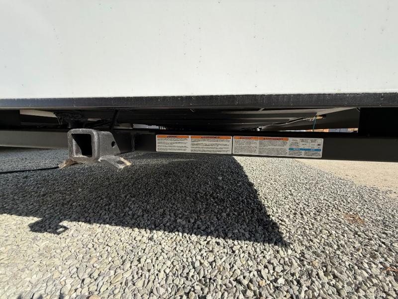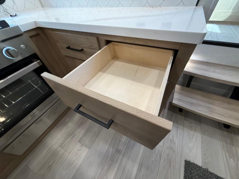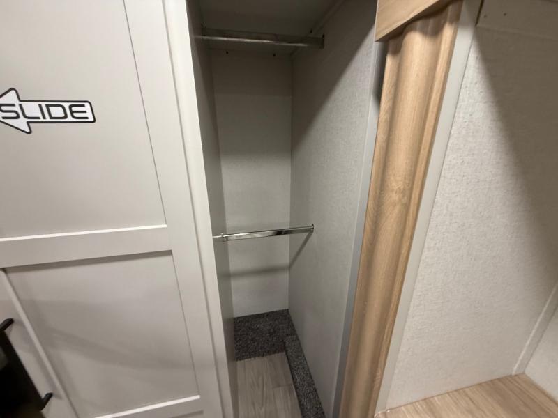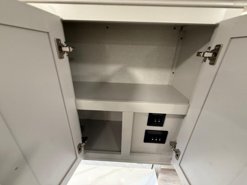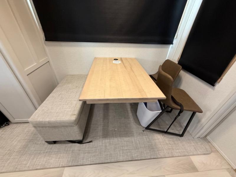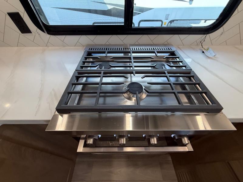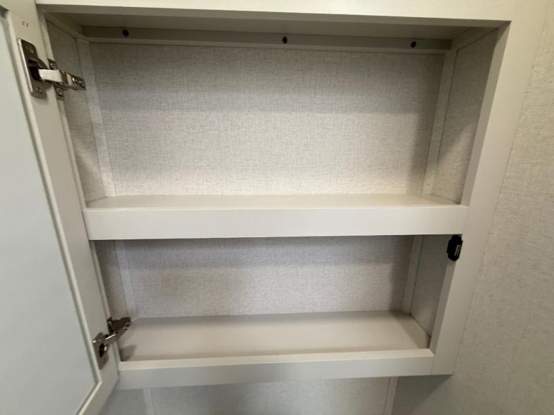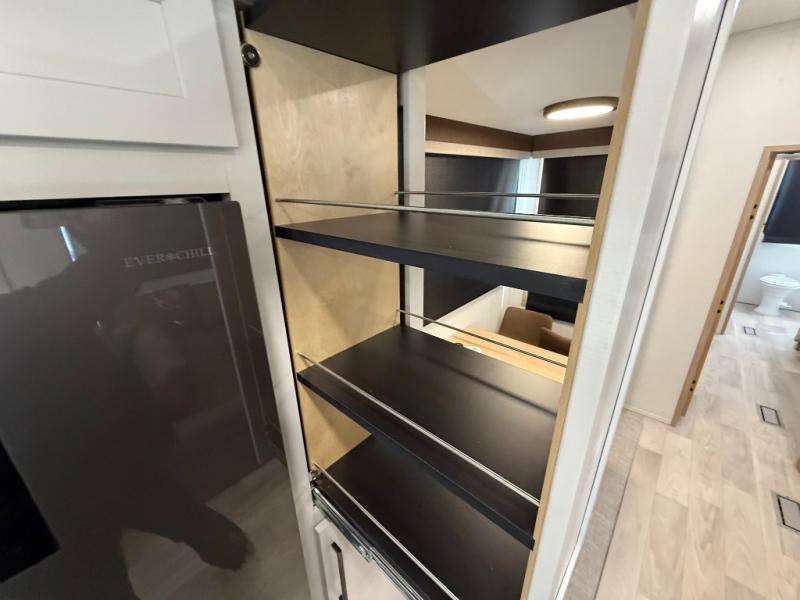 This fifth wheel is thoughtfully designed for comfort and convenience, starting with a spacious front bunkhouse perfect for accommodating guests. It features two flip-up bunks, 28" x 74" and 32" x 74" and a 60" x 74" fold-out lounge, along with a wardrobe, dresser, and additional storage to keep essentials organized. A nearby half bath adds easy access and extra convenience. At the center of the unit, the kitchen offers everything you need to prepare meals, including a stainless-steel sink, three-burner cooktop, and a generous 16 cu. ft. refrigerator. Meals can be enjoyed at the free-standing dinette, or you can unwind on the sectional sofa while enjoying the fireplace or entertainment center. At the rear, you'll find the private main bedroom with a roomy 66" x 80" RV king bed, plus its own wardrobe and dresser. Just steps away is the full bathroom featuring a one-piece fiberglass shower, sink with medicine cabinet, linen storage, and even washer/dryer prep for extended stays.