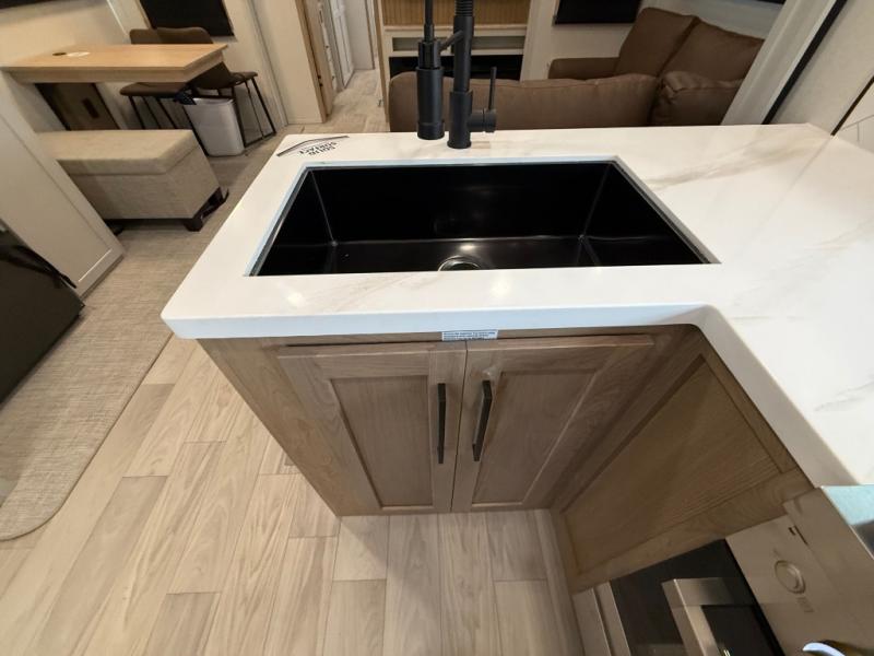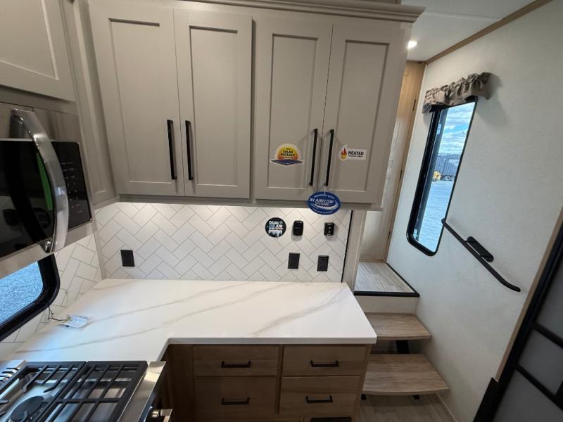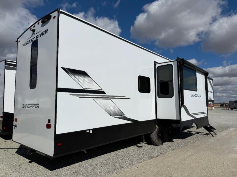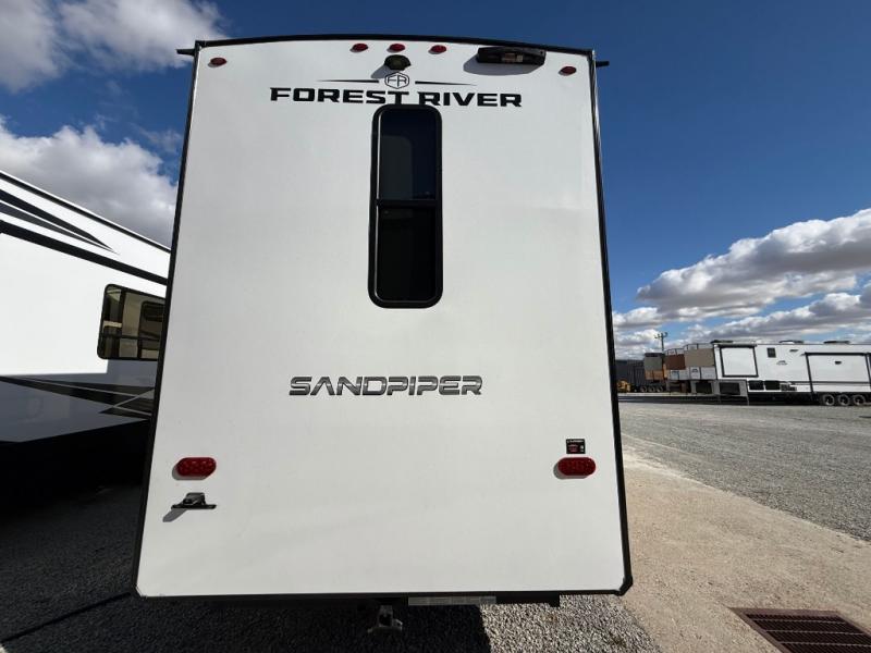 You will find the perfect balance of size, space, features, and luxury with any one of these Forest River Sandpiper fifth wheels! They have a cambered powder coated frame with rust prohibitor, and a fully enclosed underbelly for added protection against the elements. Also, the power front jacks with spring-loaded pins enhance the convenience, speed, and safety. The large, tinted windows come with a 80/20 UV prohibitors. Some hassle-free amenities include a 60k BTU on-demand water heater, porcelain foot flush toilet(s), tire pressure monitor system, and an electric leveling system! Inside, you'll enjoy stainless steel kitchen package, solid surface kitchen countertops, Beachside Sundance Congoleum linoleum, recessed residential lighting, and many more comforts!