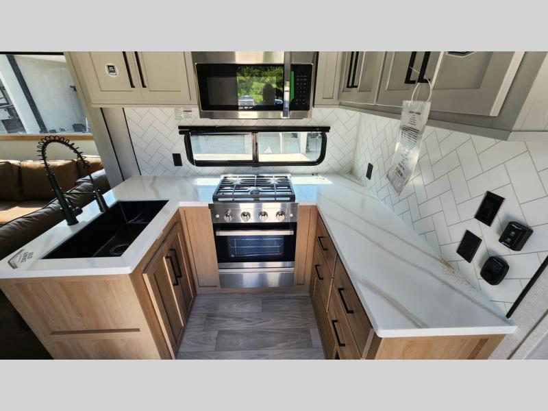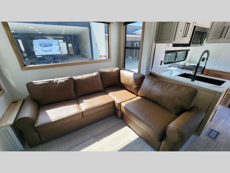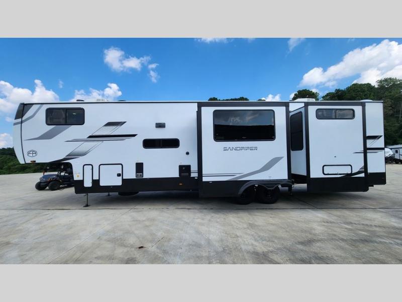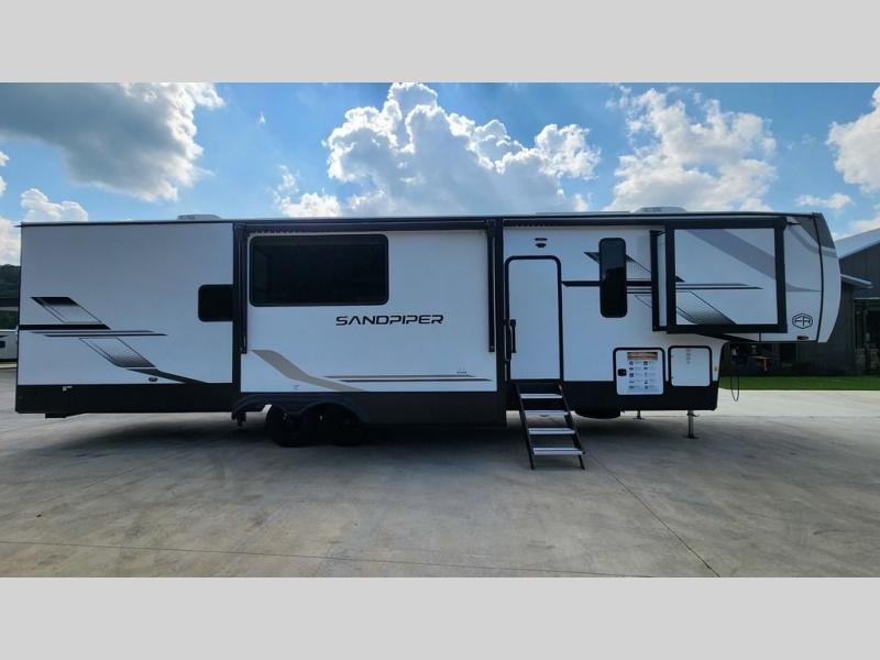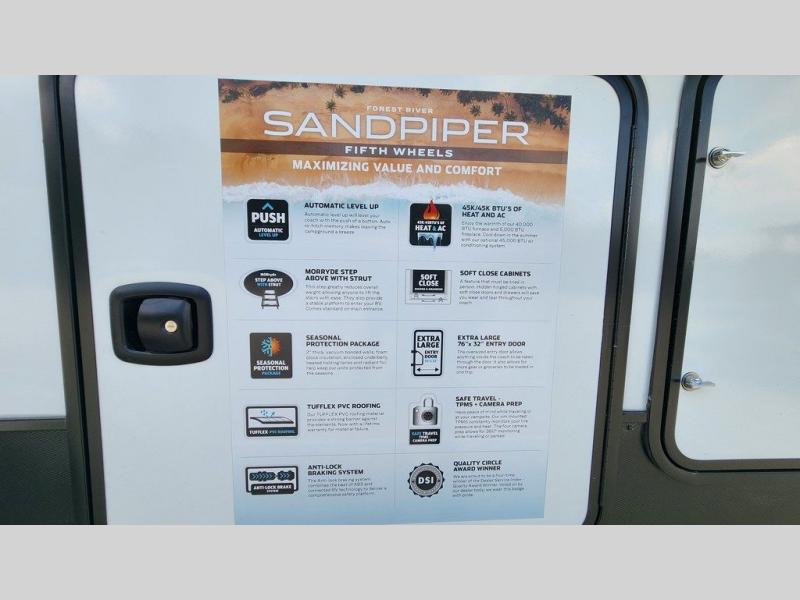 You will find the perfect balance of size, space, features, and luxury with any one of these Forest River Sandpiper fifth wheels! They have a cambered powder coated frame with rust prohibitor, and a fully enclosed underbelly for added protection against the elements. Also, the power front jacks with spring-loaded pins enhance the convenience, speed, and safety. The large, tinted windows come with a 80/20 UV prohibitors. Some hassle-free amenities include a 60k BTU on-demand water heater, porcelain foot flush toilet(s), tire pressure monitor system, and an electric leveling system! Inside, you'll enjoy stainless steel kitchen package, solid surface kitchen countertops, Beachside Sundance Congoleum linoleum, recessed residential lighting, and many more comforts!