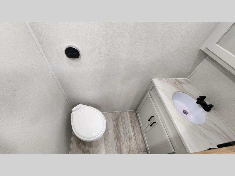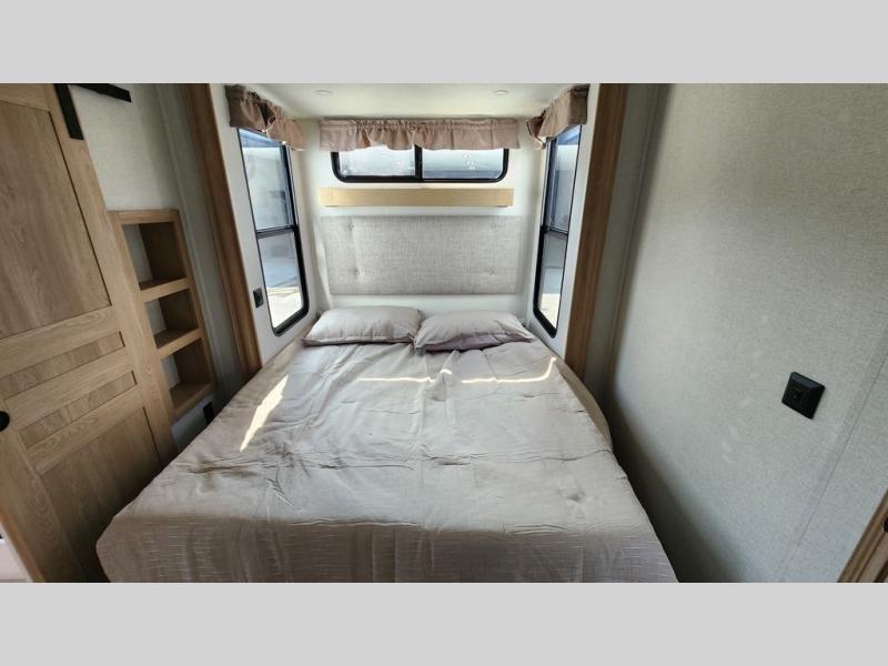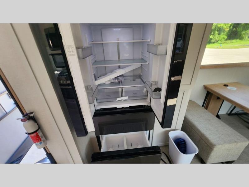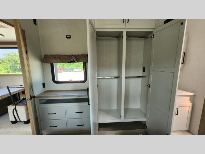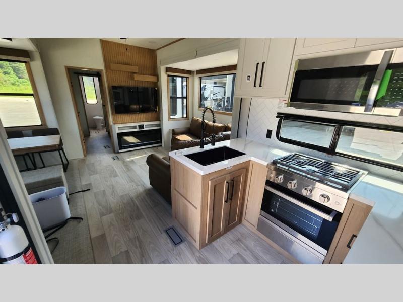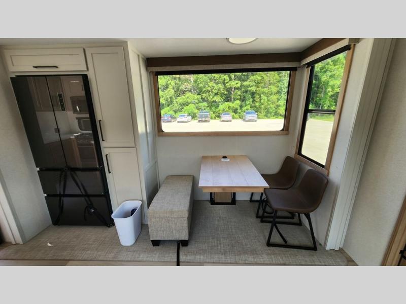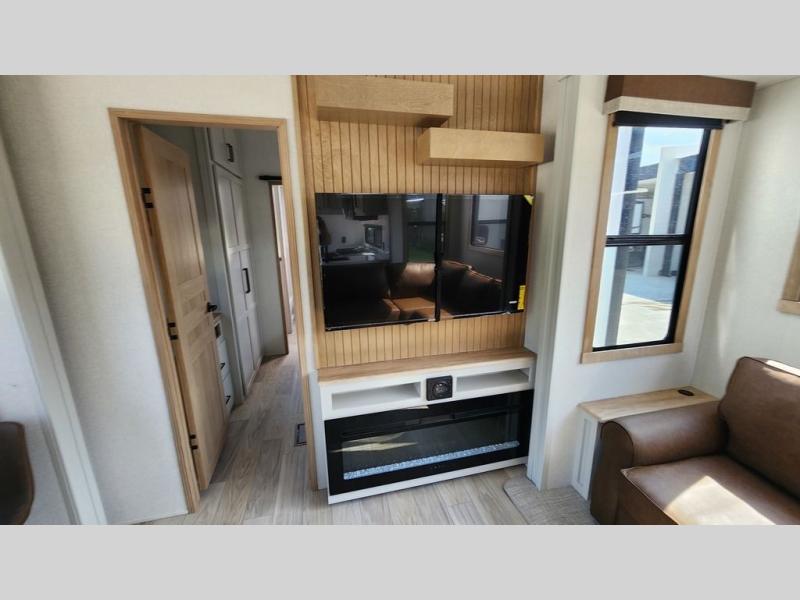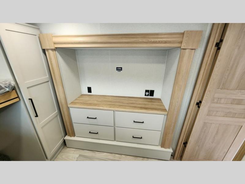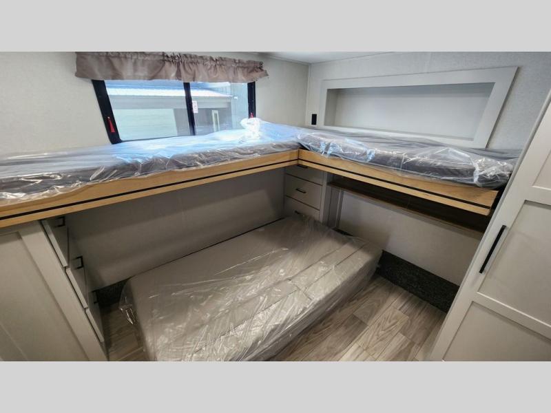 This fifth wheel is thoughtfully designed for comfort and convenience, starting with a spacious front bunkhouse perfect for accommodating guests. It features two flip-up bunks, 28" x 74" and 32" x 74" and a 60" x 74" fold-out lounge, along with a wardrobe, dresser, and additional storage to keep essentials organized. A nearby half bath adds easy access and extra convenience. At the center of the unit, the kitchen offers everything you need to prepare meals, including a stainless-steel sink, three-burner cooktop, and a generous 16 cu. ft. refrigerator. Meals can be enjoyed at the free-standing dinette, or you can unwind on the sectional sofa while enjoying the fireplace or entertainment center. At the rear, you'll find the private main bedroom with a roomy 66" x 80" RV king bed, plus its own wardrobe and dresser. Just steps away is the full bathroom featuring a one-piece fiberglass shower, sink with medicine cabinet, linen storage, and even washer/dryer prep for extended stays.