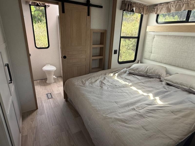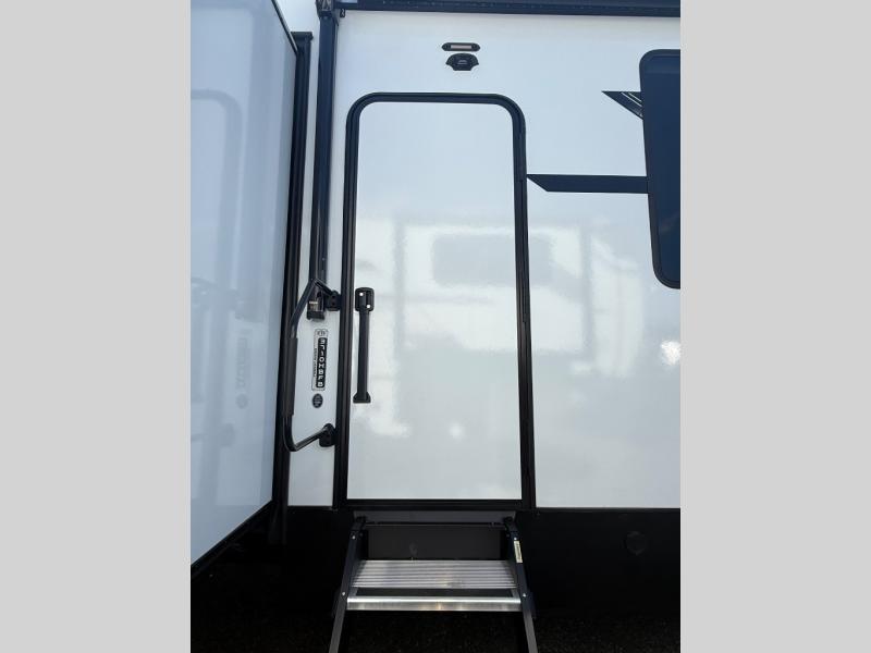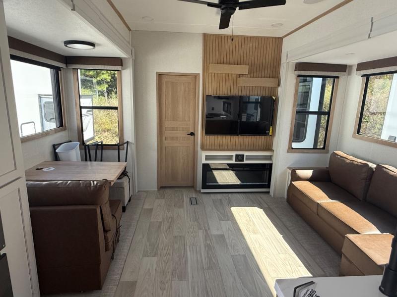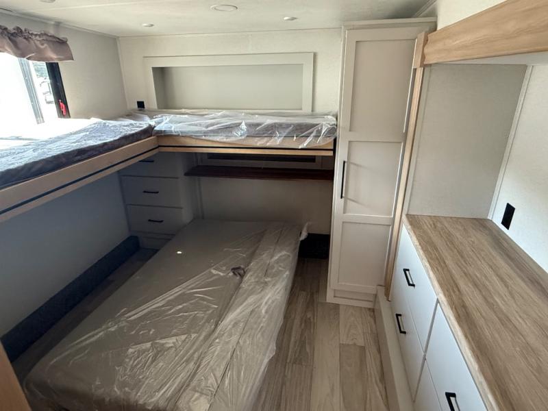 This fifth wheel is thoughtfully designed for comfort and convenience, starting with a spacious front bunkhouse perfect for accommodating guests. It features two flip-up bunks, 28" x 74" and 32" x 74" and a 60" x 74" fold-out lounge, along with a wardrobe, dresser, and additional storage to keep essentials organized. A nearby half bath adds easy access and extra convenience. At the center of the unit, the kitchen offers everything you need to prepare meals, including a stainless-steel sink, three-burner cooktop, and a generous 16 cu. ft. refrigerator. Meals can be enjoyed at the free-standing dinette, or you can unwind on the sectional sofa while enjoying the fireplace or entertainment center. At the rear, you'll find the private main bedroom with a roomy 66" x 80" RV king bed, plus its own wardrobe and dresser. Just steps away is the full bathroom featuring a one-piece fiberglass shower, sink with medicine cabinet, linen storage, and even washer/dryer prep for extended stays.