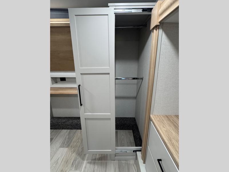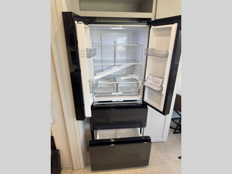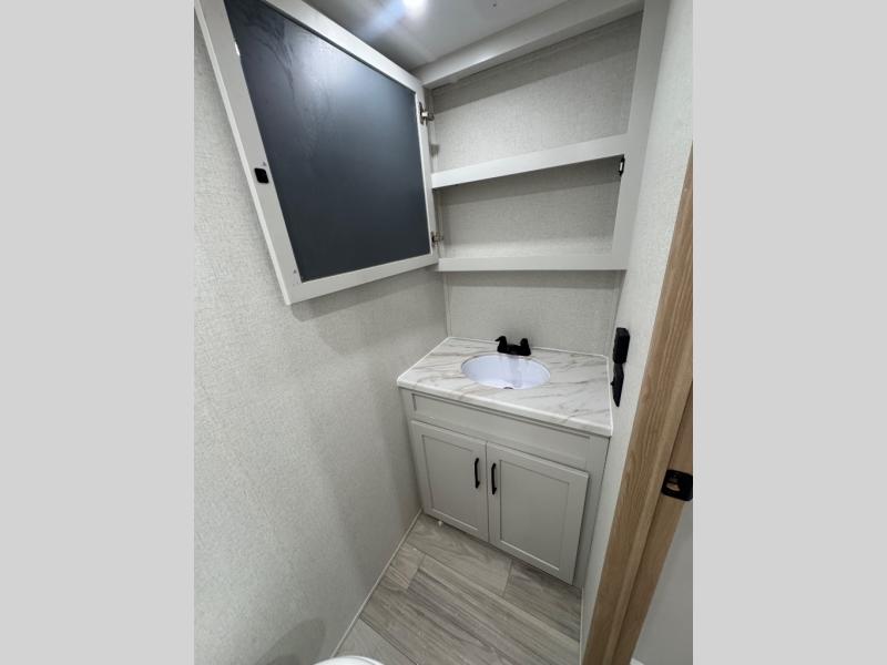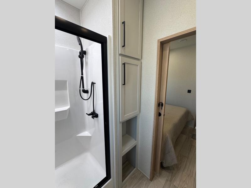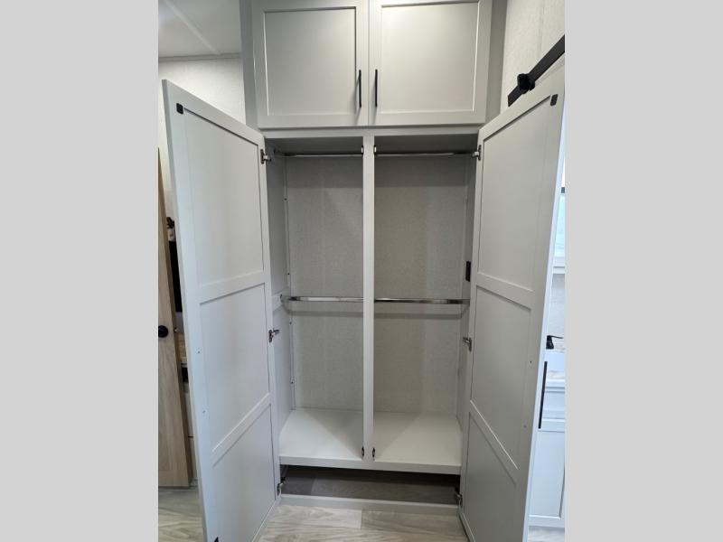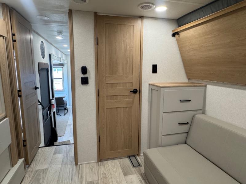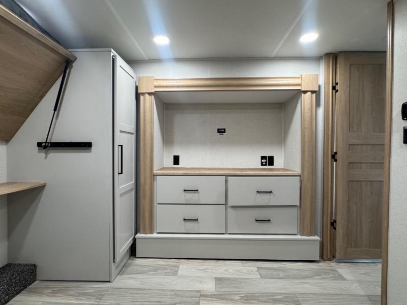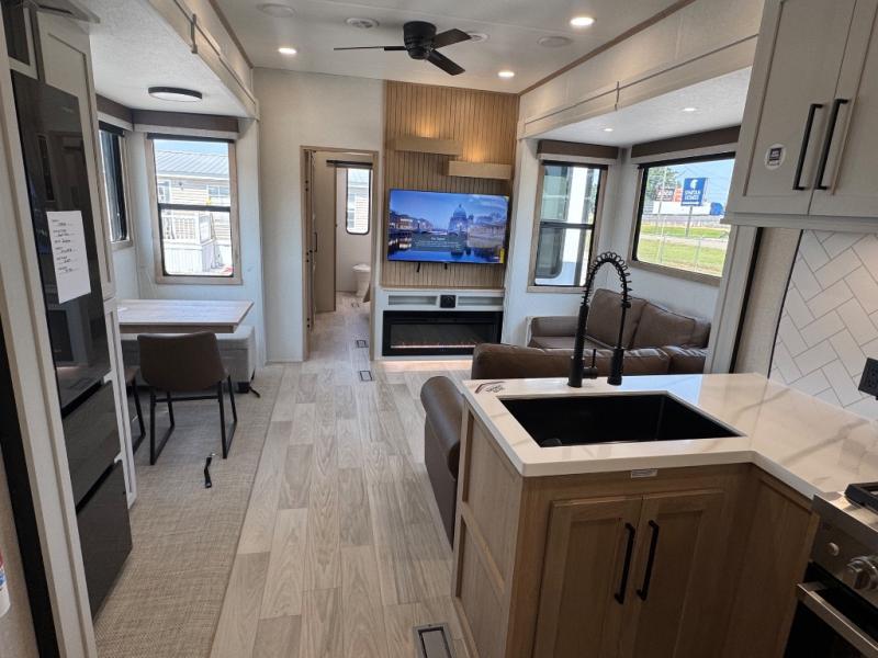 This fifth wheel is thoughtfully designed for comfort and convenience, starting with a spacious front bunkhouse perfect for accommodating guests. It features two flip-up bunks, 28" x 74" and 32" x 74" and a 60" x 74" fold-out lounge, along with a wardrobe, dresser, and additional storage to keep essentials organized. A nearby half bath adds easy access and extra convenience. At the center of the unit, the kitchen offers everything you need to prepare meals, including a stainless-steel sink, three-burner cooktop, and a generous 16 cu. ft. refrigerator. Meals can be enjoyed at the free-standing dinette, or you can unwind on the sectional sofa while enjoying the fireplace or entertainment center. At the rear, you'll find the private main bedroom with a roomy 66" x 80" RV king bed, plus its own wardrobe and dresser. Just steps away is the full bathroom featuring a one-piece fiberglass shower, sink with medicine cabinet, linen storage, and even washer/dryer prep for extended stays.