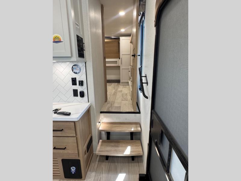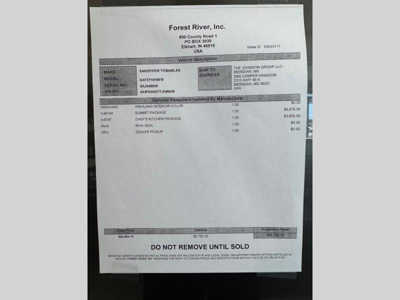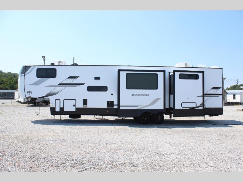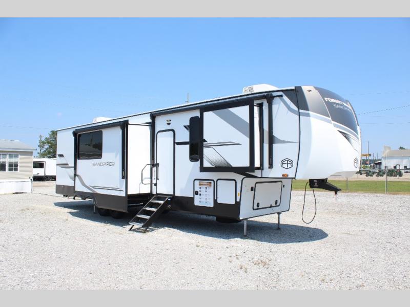 You will find the perfect balance of size, space, features, and luxury with any one of these Forest River Sandpiper fifth wheels! They have a cambered powder coated frame with rust prohibitor, and a fully enclosed underbelly for added protection against the elements. Also, the power front jacks with spring-loaded pins enhance the convenience, speed, and safety. The large, tinted windows come with a 80/20 UV prohibitors. Some hassle-free amenities include a 60k BTU on-demand water heater, porcelain foot flush toilet(s), tire pressure monitor system, and an electric leveling system! Inside, you'll enjoy stainless steel kitchen package, solid surface kitchen countertops, Beachside Sundance Congoleum linoleum, recessed residential lighting, and many more comforts!