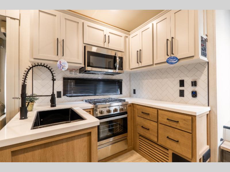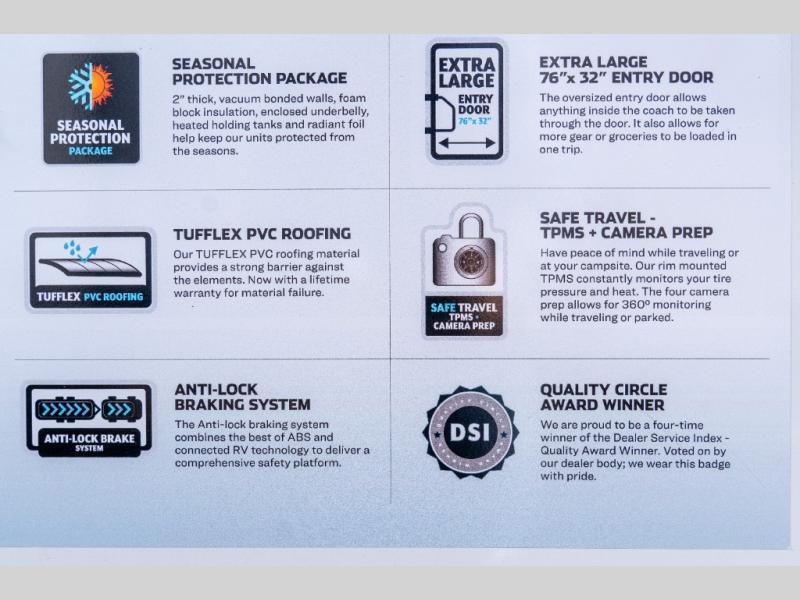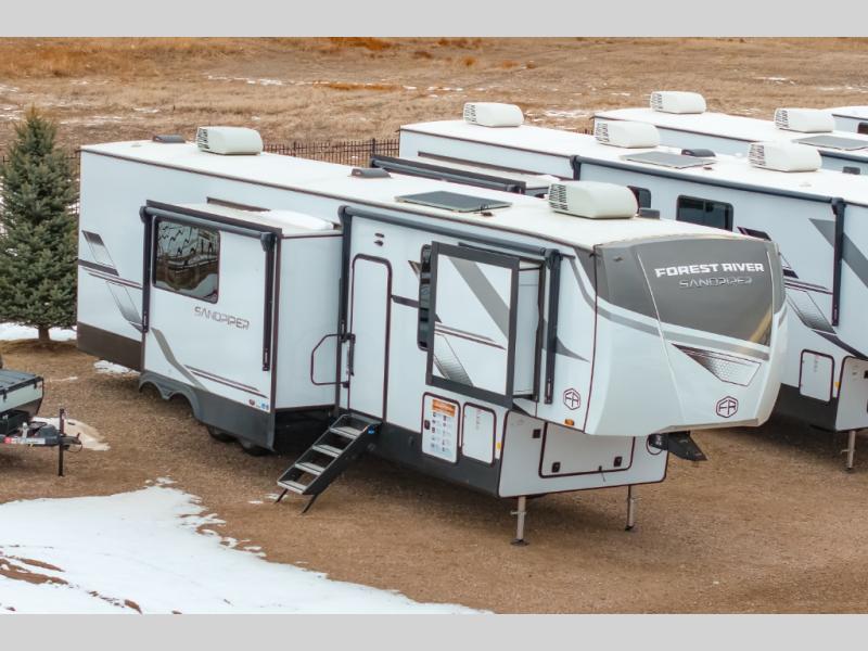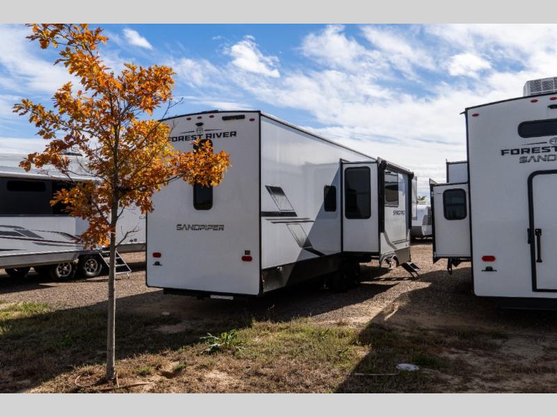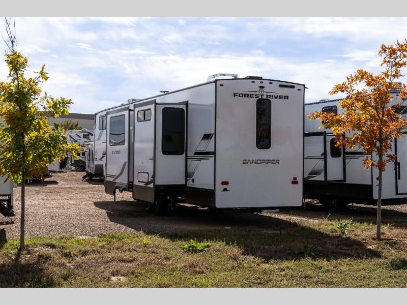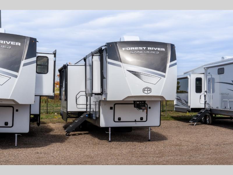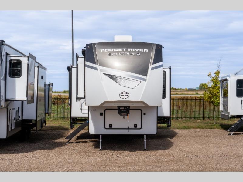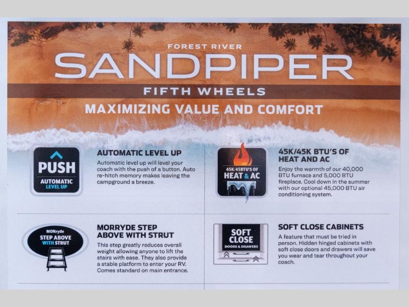 You will find the perfect balance of size, space, features, and luxury with any one of these Forest River Sandpiper fifth wheels! They have a cambered powder coated frame with rust prohibitor, and a fully enclosed underbelly for added protection against the elements. Also, the power front jacks with spring-loaded pins enhance the convenience, speed, and safety. The large, tinted windows come with a 80/20 UV prohibitors. Some hassle-free amenities include a 60k BTU on-demand water heater, porcelain foot flush toilet(s), tire pressure monitor system, and an electric leveling system! Inside, you'll enjoy stainless steel kitchen package, solid surface kitchen countertops, Beachside Sundance Congoleum linoleum, recessed residential lighting, and many more comforts!