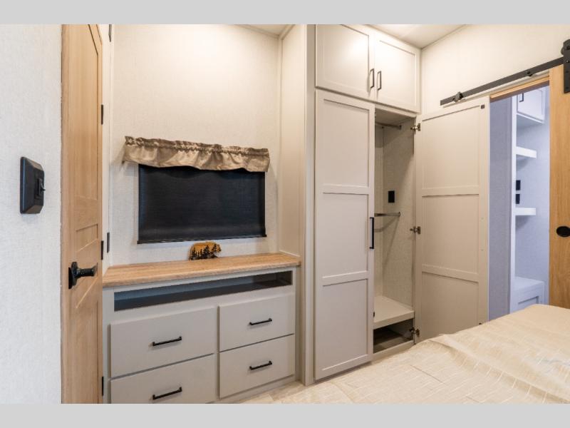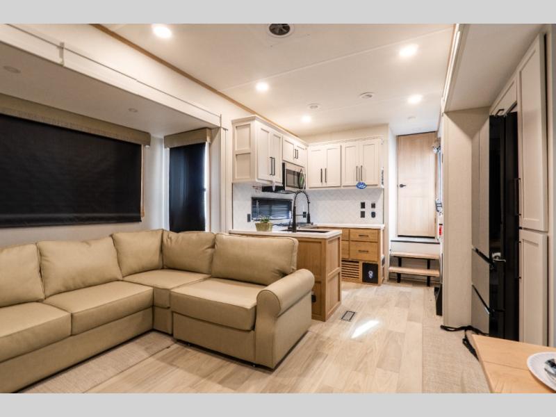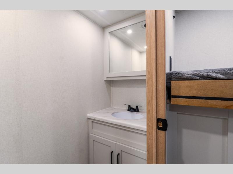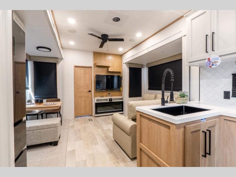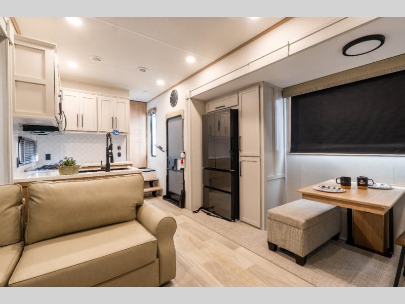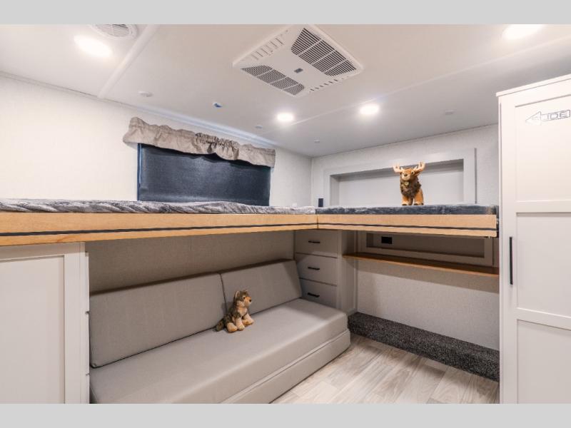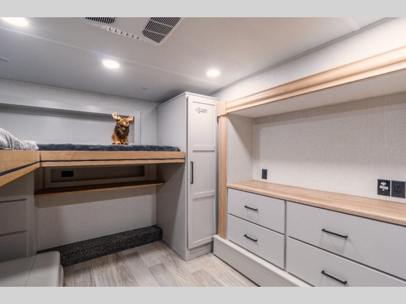 This fifth wheel is thoughtfully designed for comfort and convenience, starting with a spacious front bunkhouse perfect for accommodating guests. It features two flip-up bunks, 28" x 74" and 32" x 74" and a 60" x 74" fold-out lounge, along with a wardrobe, dresser, and additional storage to keep essentials organized. A nearby half bath adds easy access and extra convenience. At the center of the unit, the kitchen offers everything you need to prepare meals, including a stainless-steel sink, three-burner cooktop, and a generous 16 cu. ft. refrigerator. Meals can be enjoyed at the free-standing dinette, or you can unwind on the sectional sofa while enjoying the fireplace or entertainment center. At the rear, you'll find the private main bedroom with a roomy 66" x 80" RV king bed, plus its own wardrobe and dresser. Just steps away is the full bathroom featuring a one-piece fiberglass shower, sink with medicine cabinet, linen storage, and even washer/dryer prep for extended stays.