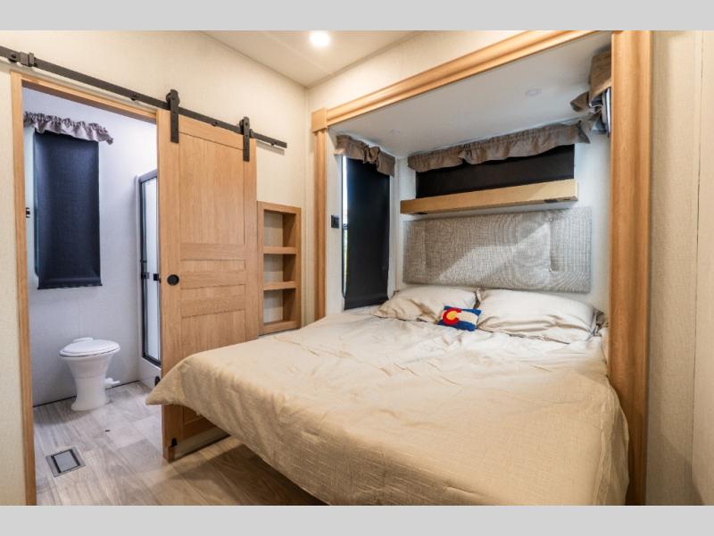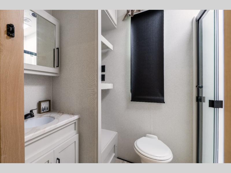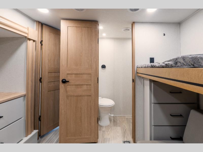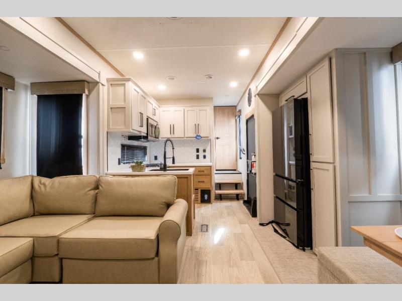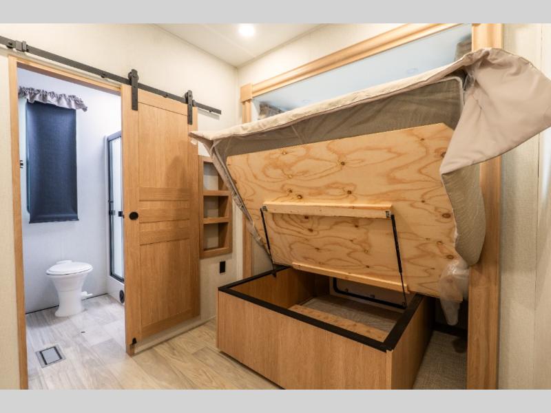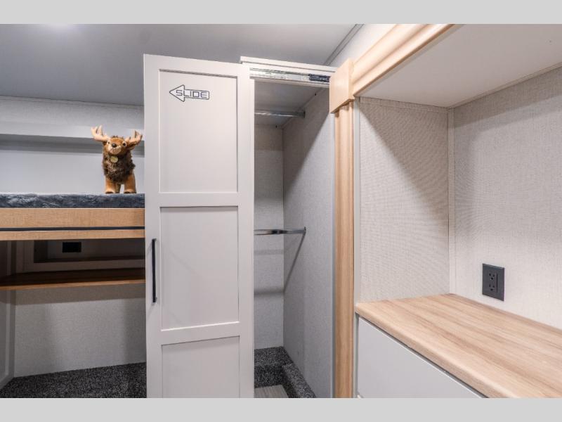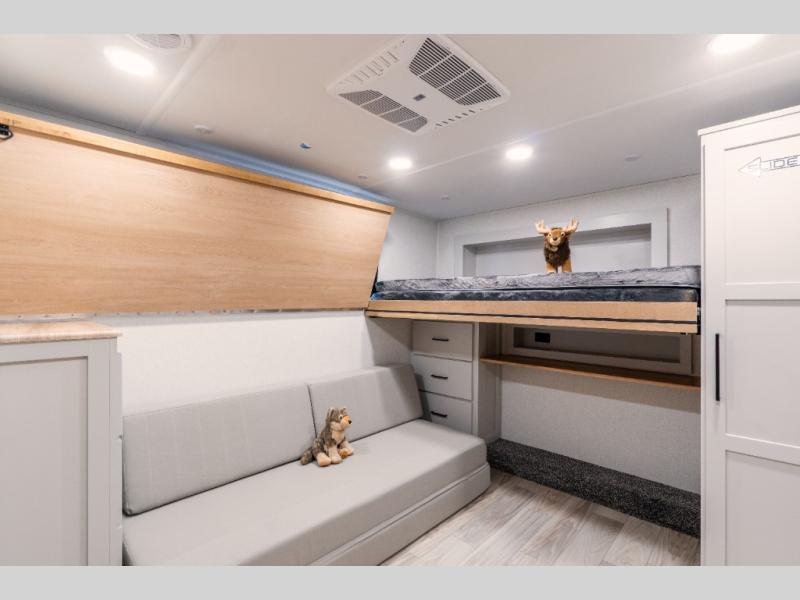 This fifth wheel is thoughtfully designed for comfort and convenience, starting with a spacious front bunkhouse perfect for accommodating guests. It features two flip-up bunks, 28" x 74" and 32" x 74" and a 60" x 74" fold-out lounge, along with a wardrobe, dresser, and additional storage to keep essentials organized. A nearby half bath adds easy access and extra convenience. At the center of the unit, the kitchen offers everything you need to prepare meals, including a stainless-steel sink, three-burner cooktop, and a generous 16 cu. ft. refrigerator. Meals can be enjoyed at the free-standing dinette, or you can unwind on the sectional sofa while enjoying the fireplace or entertainment center. At the rear, you'll find the private main bedroom with a roomy 66" x 80" RV king bed, plus its own wardrobe and dresser. Just steps away is the full bathroom featuring a one-piece fiberglass shower, sink with medicine cabinet, linen storage, and even washer/dryer prep for extended stays.