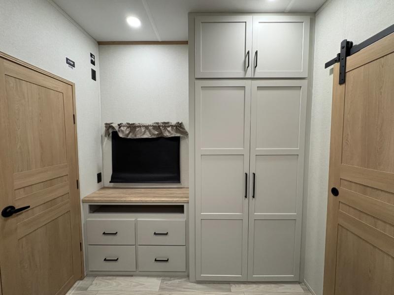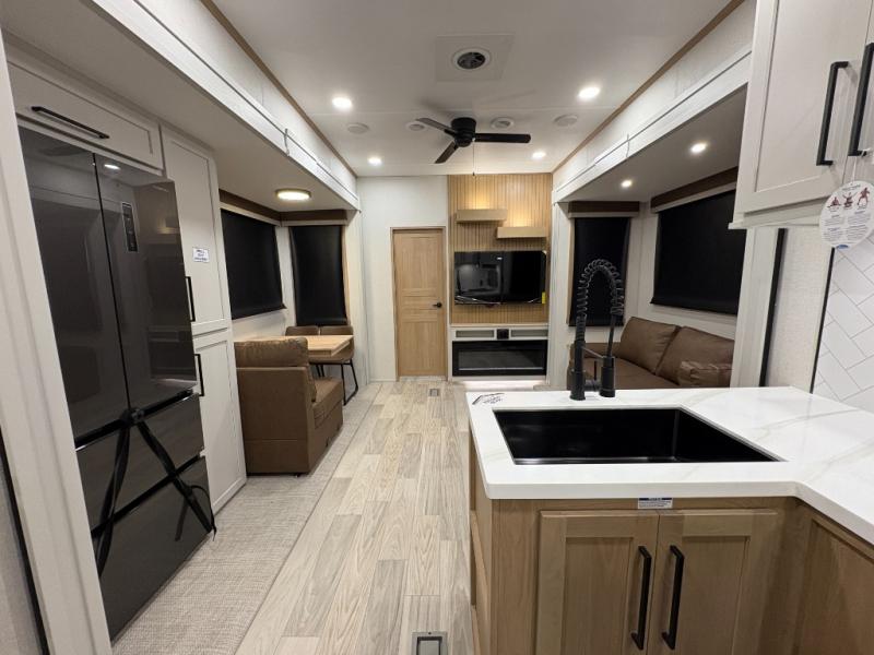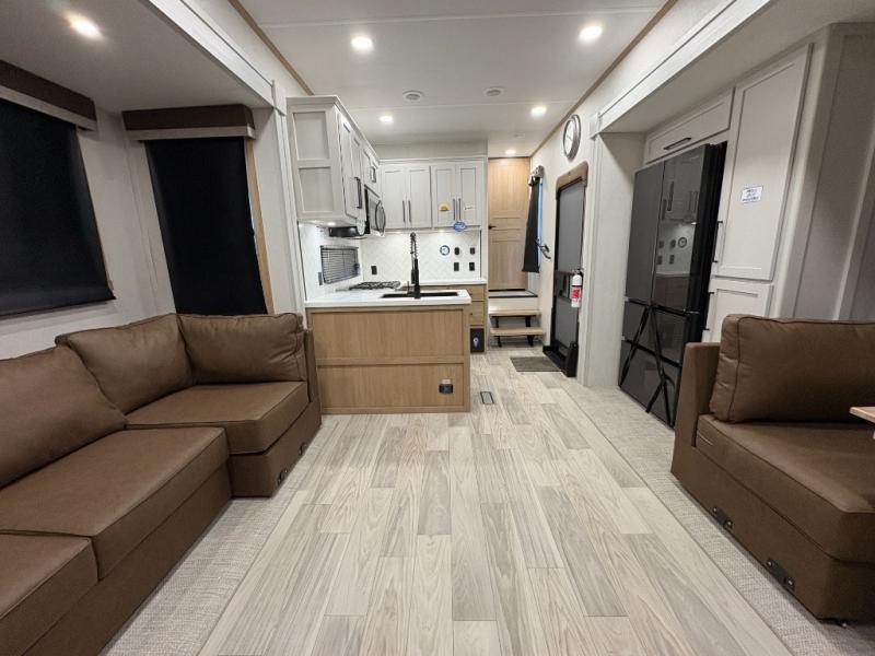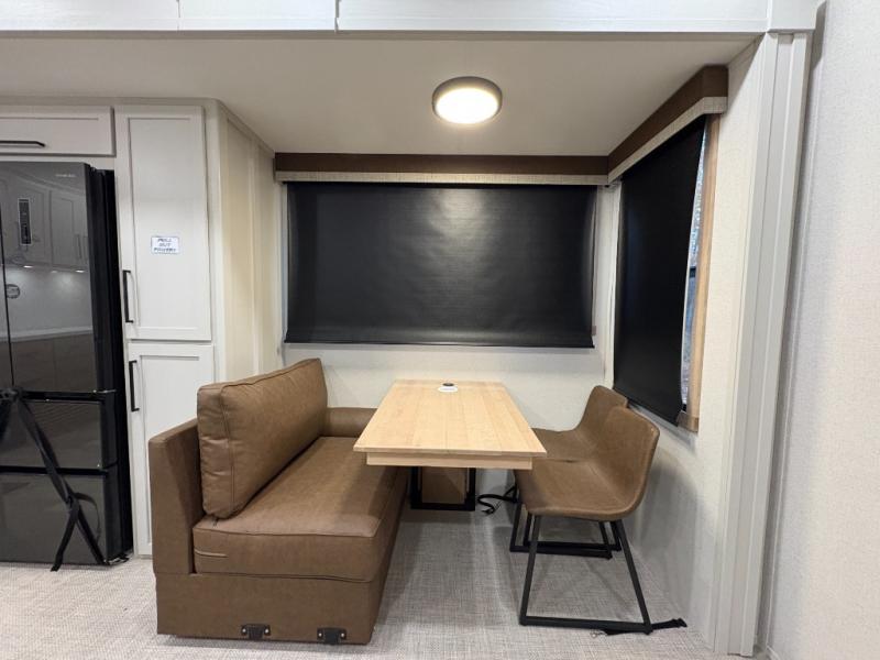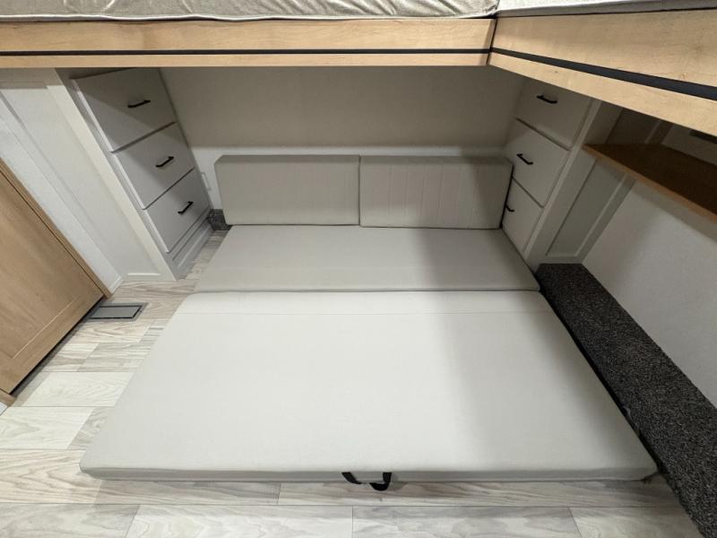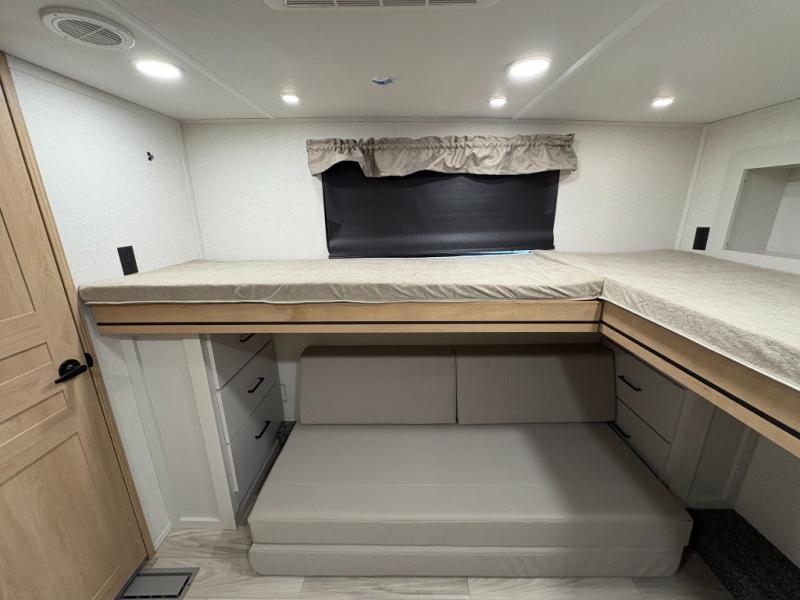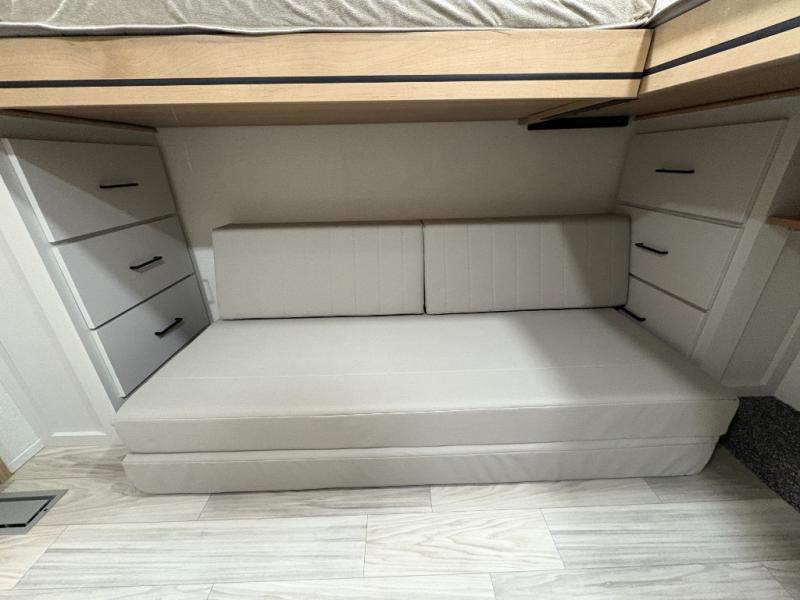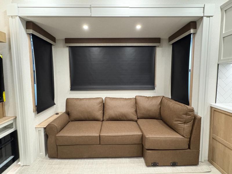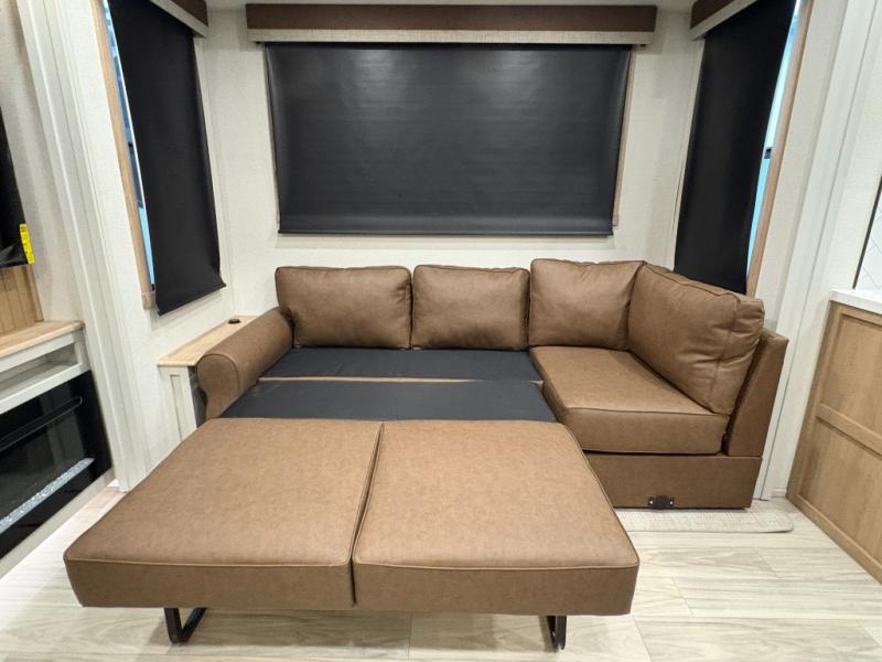 This fifth wheel is thoughtfully designed for comfort and convenience, starting with a spacious front bunkhouse perfect for accommodating guests. It features two flip-up bunks, 28" x 74" and 32" x 74" and a 60" x 74" fold-out lounge, along with a wardrobe, dresser, and additional storage to keep essentials organized. A nearby half bath adds easy access and extra convenience. At the center of the unit, the kitchen offers everything you need to prepare meals, including a stainless-steel sink, three-burner cooktop, and a generous 16 cu. ft. refrigerator. Meals can be enjoyed at the free-standing dinette, or you can unwind on the sectional sofa while enjoying the fireplace or entertainment center. At the rear, you'll find the private main bedroom with a roomy 66" x 80" RV king bed, plus its own wardrobe and dresser. Just steps away is the full bathroom featuring a one-piece fiberglass shower, sink with medicine cabinet, linen storage, and even washer/dryer prep for extended stays.