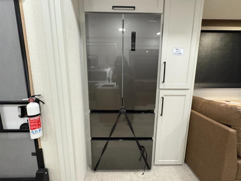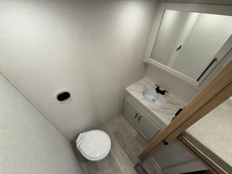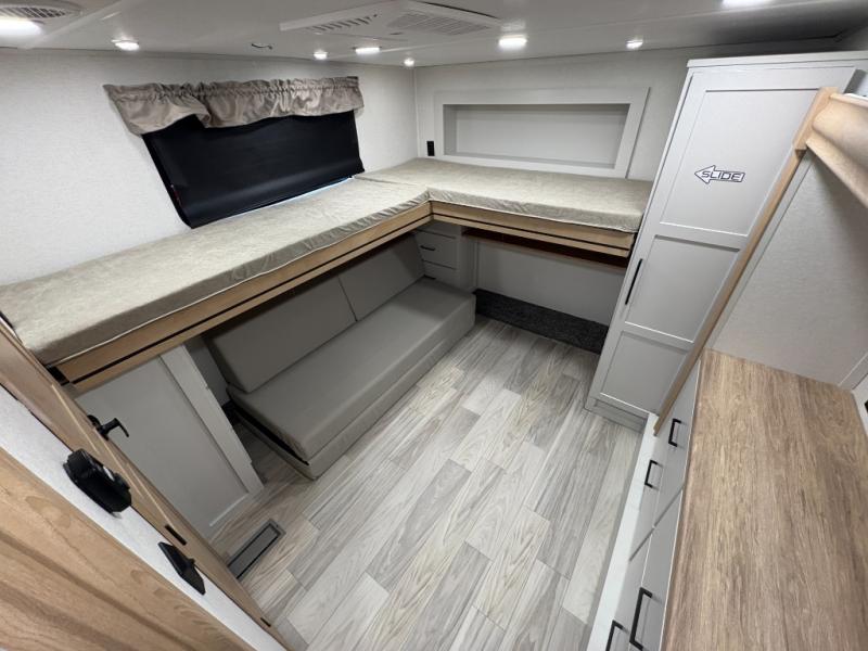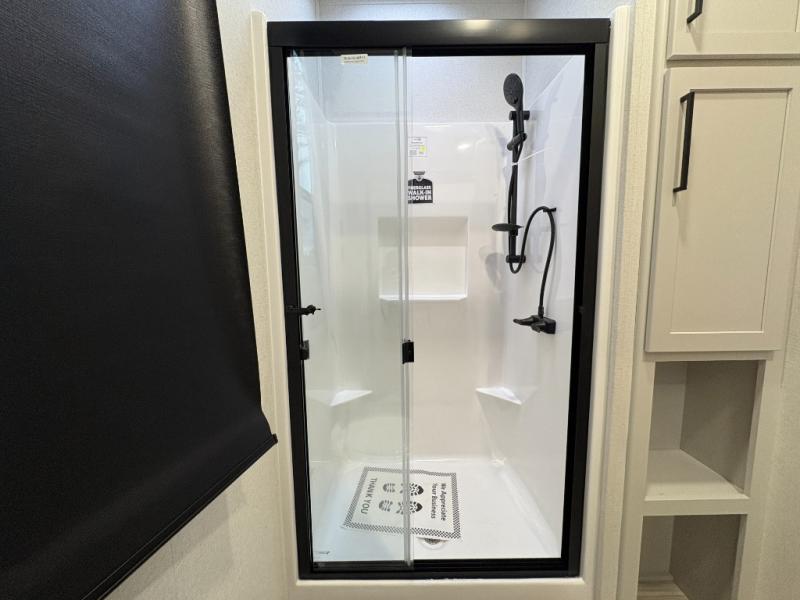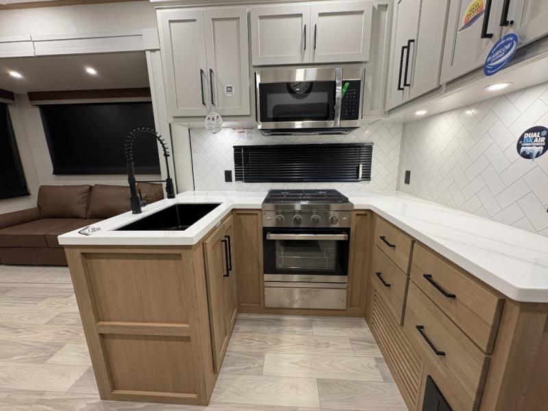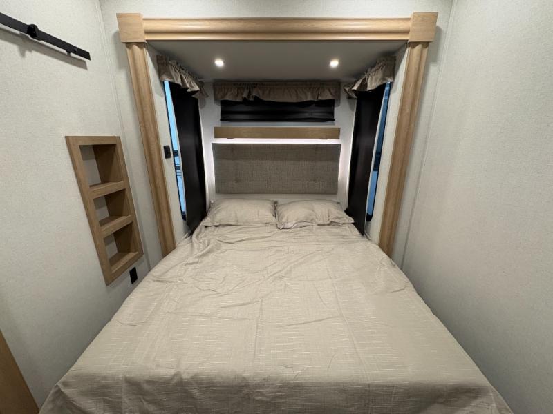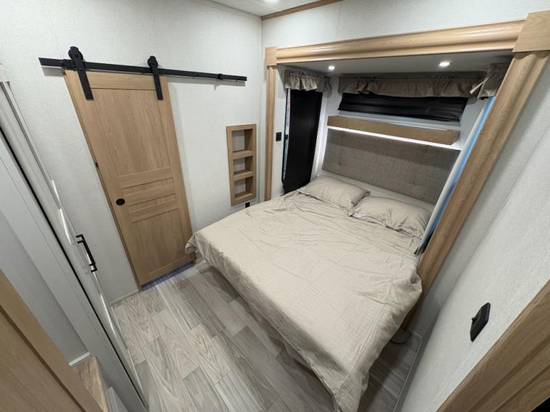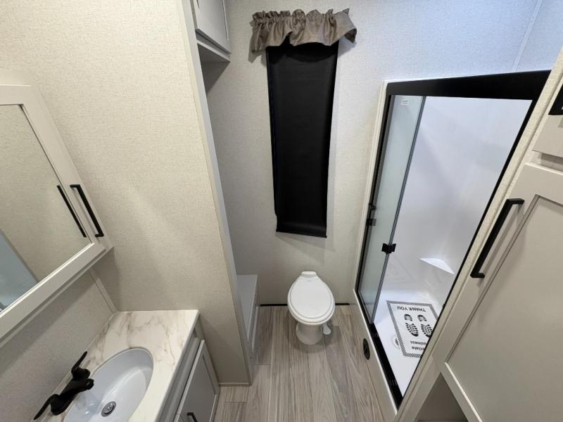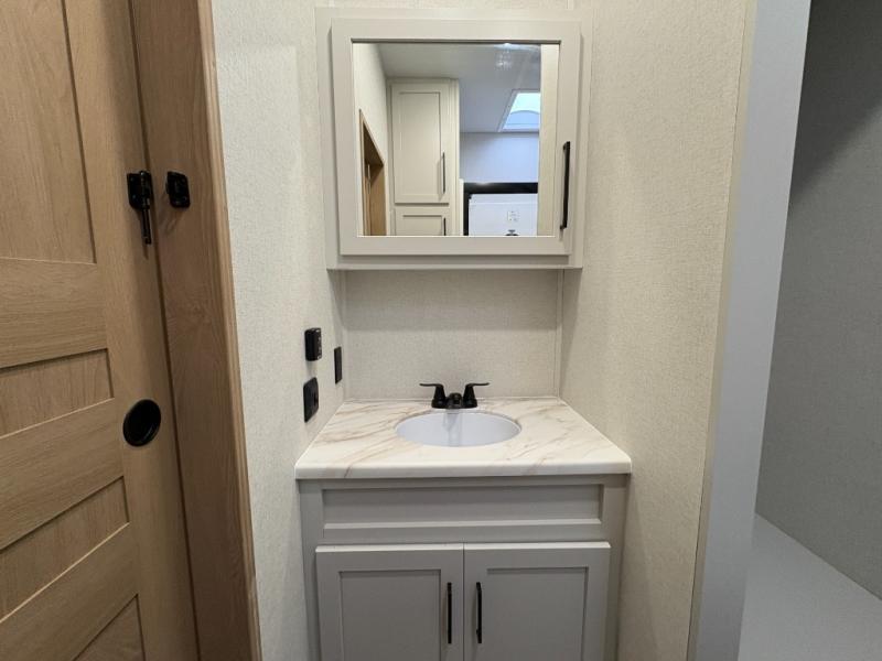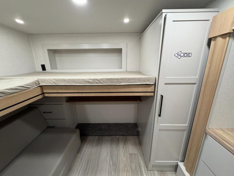 This fifth wheel is thoughtfully designed for comfort and convenience, starting with a spacious front bunkhouse perfect for accommodating guests. It features two flip-up bunks, 28" x 74" and 32" x 74" and a 60" x 74" fold-out lounge, along with a wardrobe, dresser, and additional storage to keep essentials organized. A nearby half bath adds easy access and extra convenience. At the center of the unit, the kitchen offers everything you need to prepare meals, including a stainless-steel sink, three-burner cooktop, and a generous 16 cu. ft. refrigerator. Meals can be enjoyed at the free-standing dinette, or you can unwind on the sectional sofa while enjoying the fireplace or entertainment center. At the rear, you'll find the private main bedroom with a roomy 66" x 80" RV king bed, plus its own wardrobe and dresser. Just steps away is the full bathroom featuring a one-piece fiberglass shower, sink with medicine cabinet, linen storage, and even washer/dryer prep for extended stays.