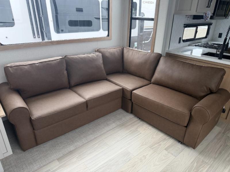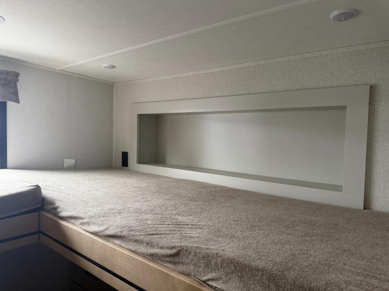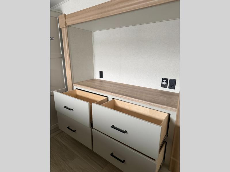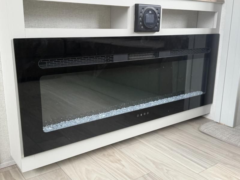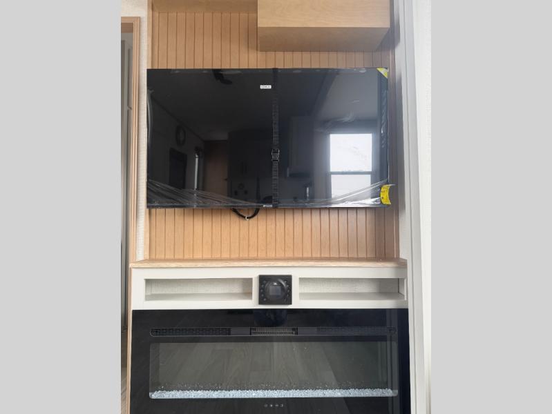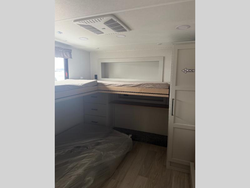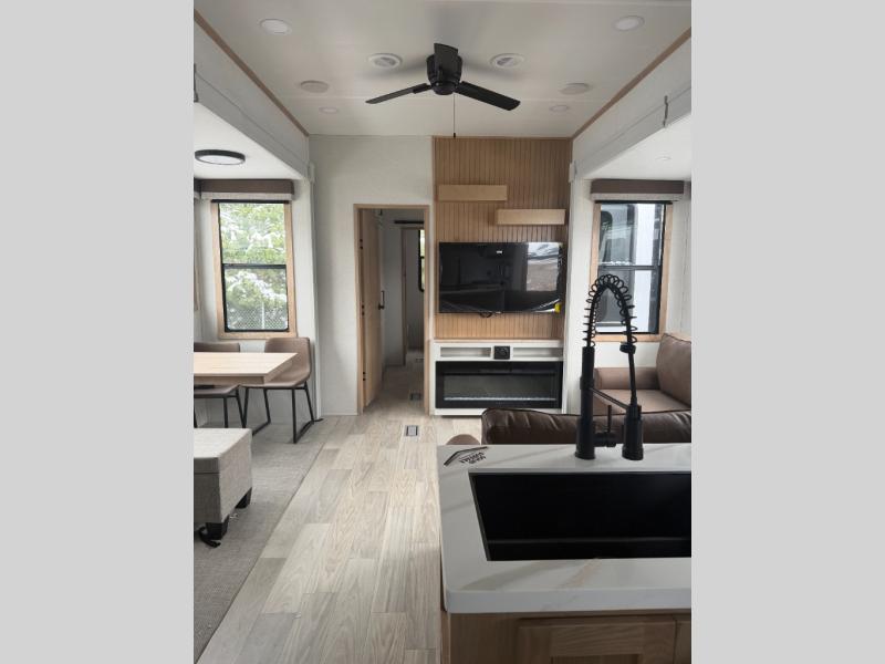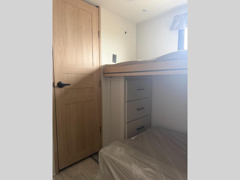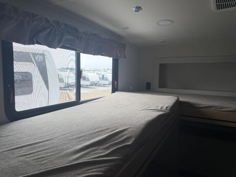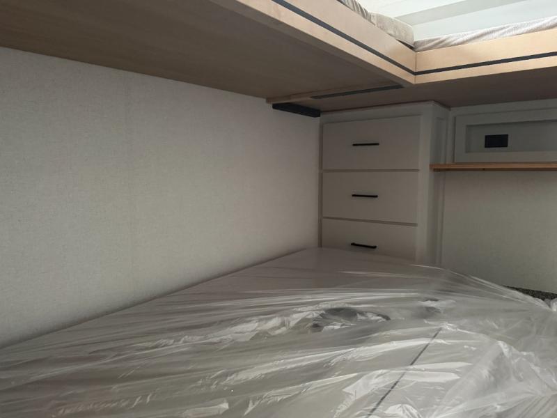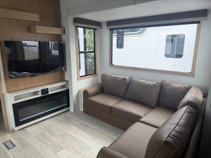 This fifth wheel is thoughtfully designed for comfort and convenience, starting with a spacious front bunkhouse perfect for accommodating guests. It features two flip-up bunks, 28" x 74" and 32" x 74" and a 60" x 74" fold-out lounge, along with a wardrobe, dresser, and additional storage to keep essentials organized. A nearby half bath adds easy access and extra convenience. At the center of the unit, the kitchen offers everything you need to prepare meals, including a stainless-steel sink, three-burner cooktop, and a generous 16 cu. ft. refrigerator. Meals can be enjoyed at the free-standing dinette, or you can unwind on the sectional sofa while enjoying the fireplace or entertainment center. At the rear, you'll find the private main bedroom with a roomy 66" x 80" RV king bed, plus its own wardrobe and dresser. Just steps away is the full bathroom featuring a one-piece fiberglass shower, sink with medicine cabinet, linen storage, and even washer/dryer prep for extended stays.