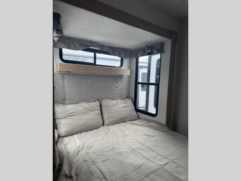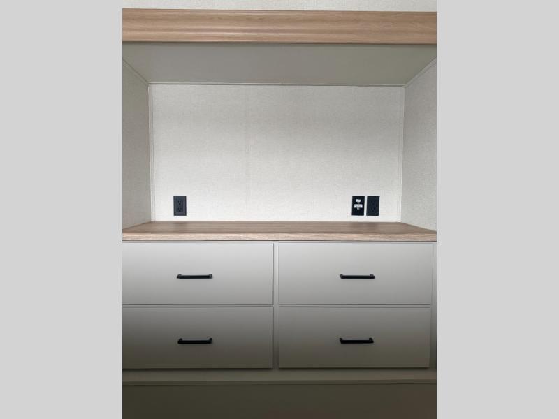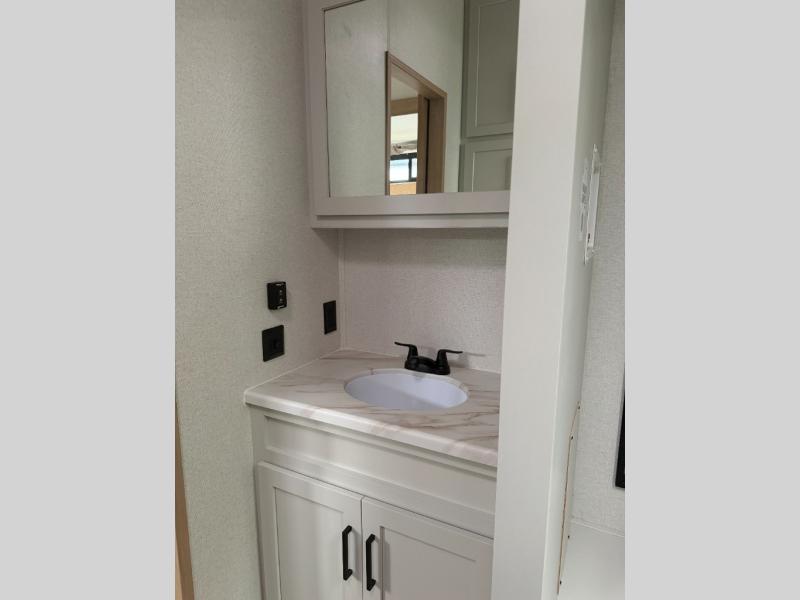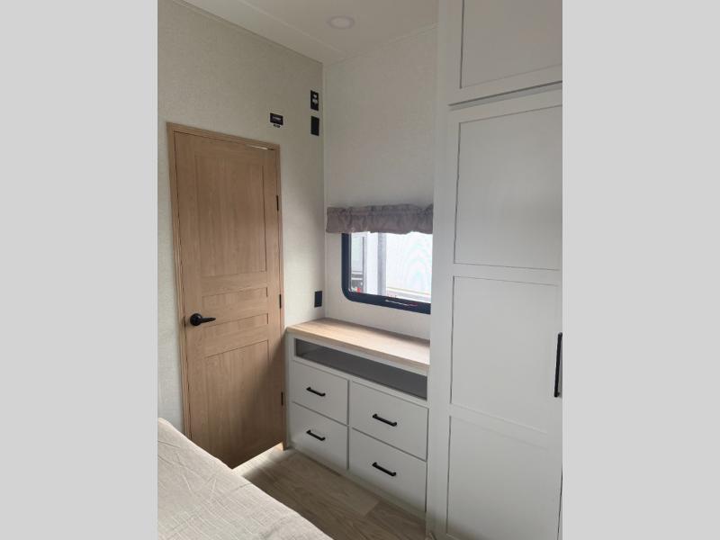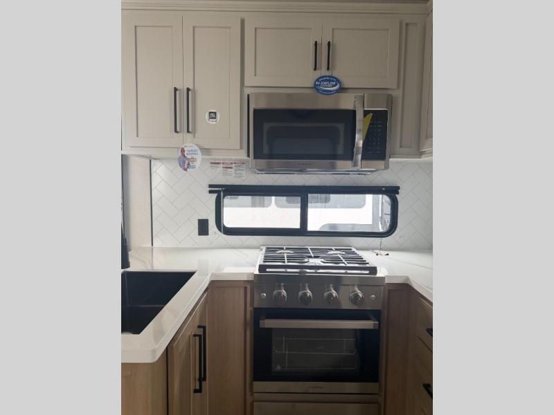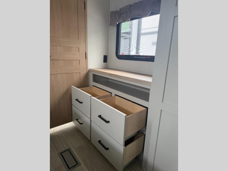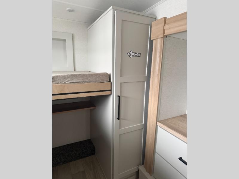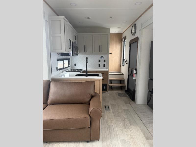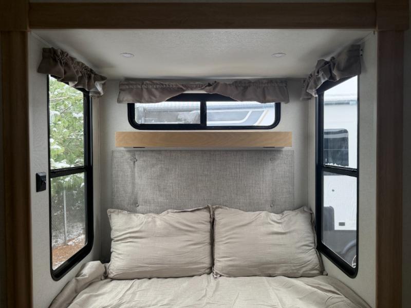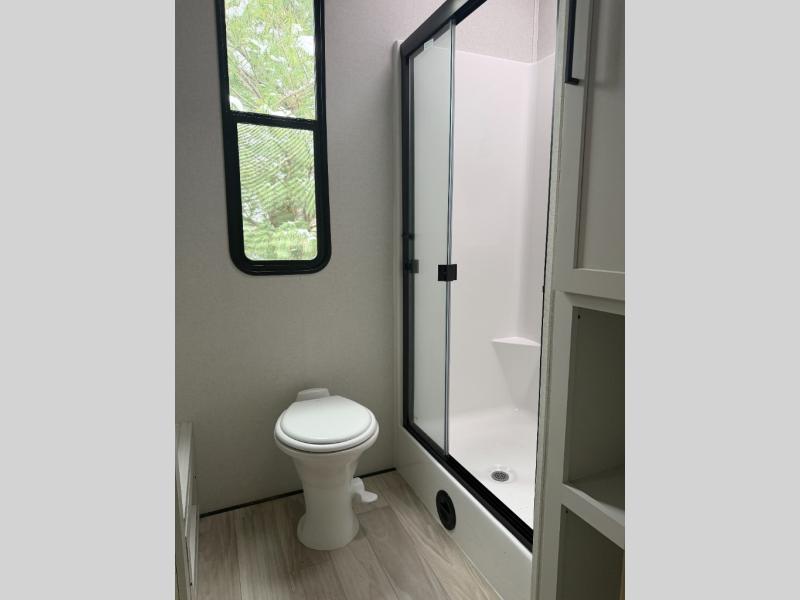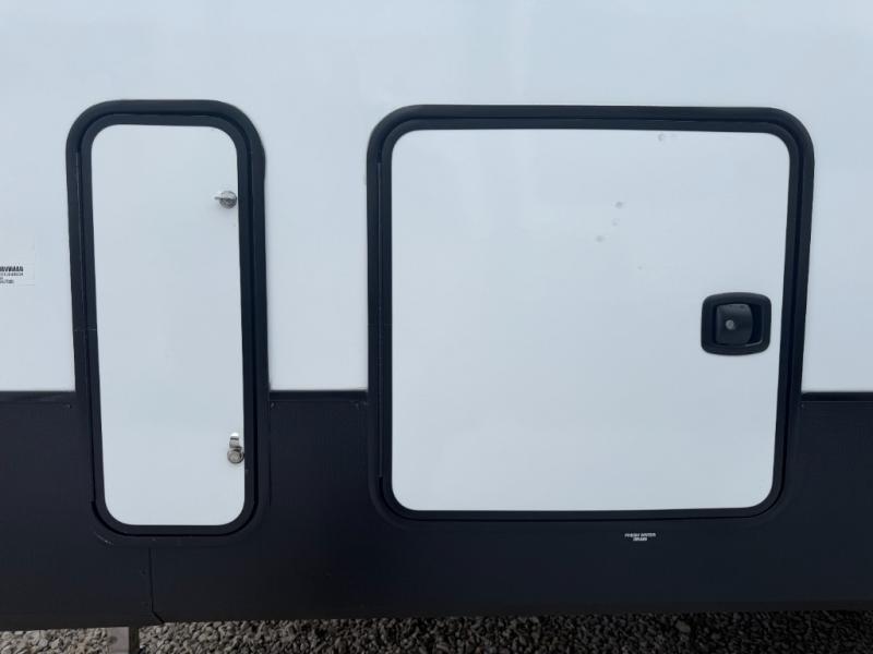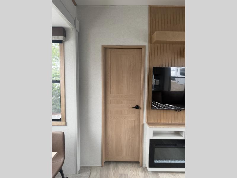 This fifth wheel is thoughtfully designed for comfort and convenience, starting with a spacious front bunkhouse perfect for accommodating guests. It features two flip-up bunks, 28" x 74" and 32" x 74" and a 60" x 74" fold-out lounge, along with a wardrobe, dresser, and additional storage to keep essentials organized. A nearby half bath adds easy access and extra convenience. At the center of the unit, the kitchen offers everything you need to prepare meals, including a stainless-steel sink, three-burner cooktop, and a generous 16 cu. ft. refrigerator. Meals can be enjoyed at the free-standing dinette, or you can unwind on the sectional sofa while enjoying the fireplace or entertainment center. At the rear, you'll find the private main bedroom with a roomy 66" x 80" RV king bed, plus its own wardrobe and dresser. Just steps away is the full bathroom featuring a one-piece fiberglass shower, sink with medicine cabinet, linen storage, and even washer/dryer prep for extended stays.