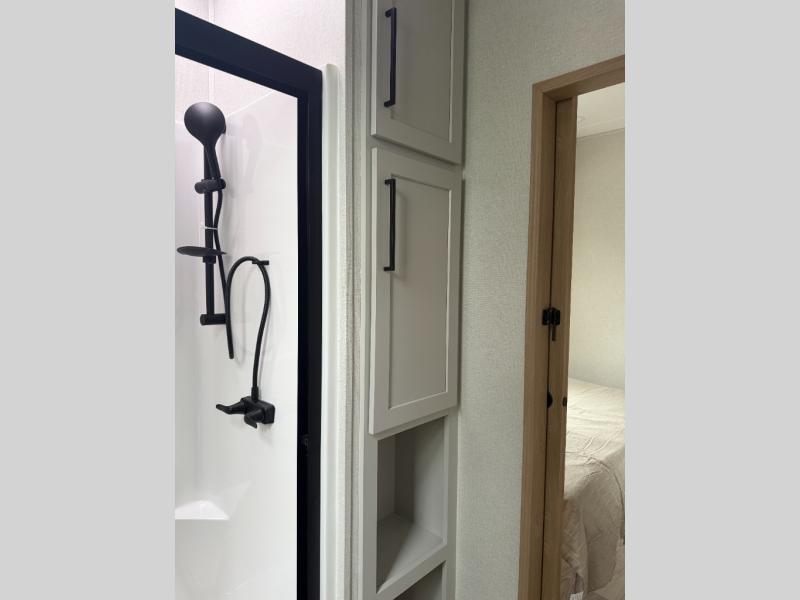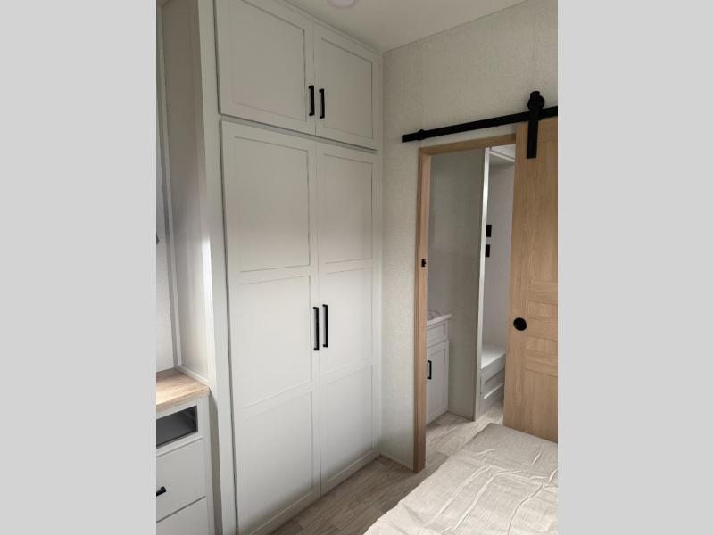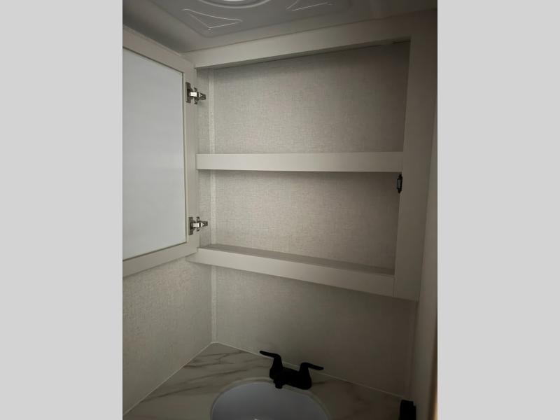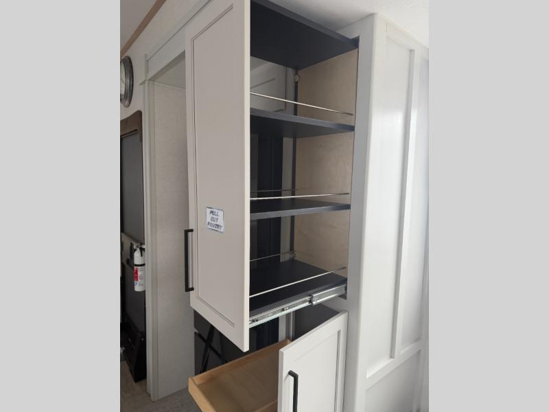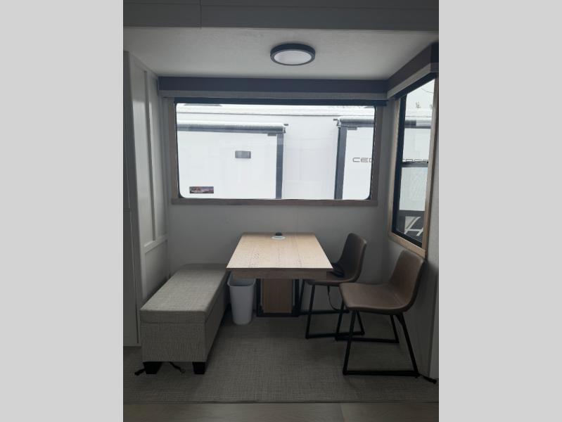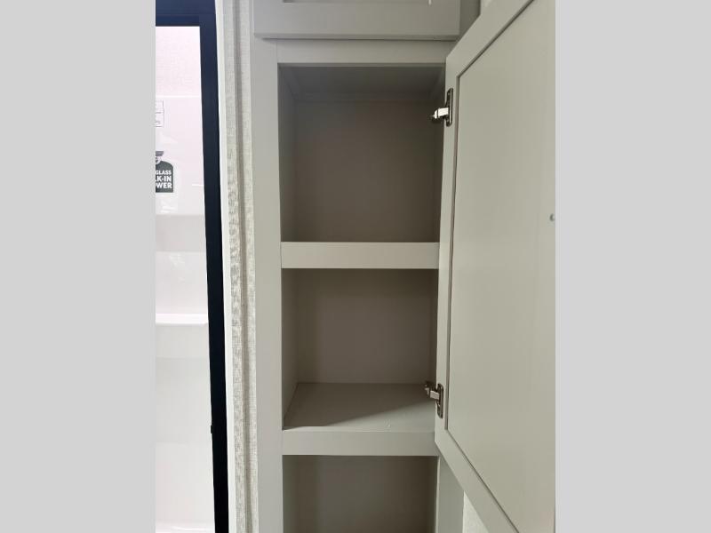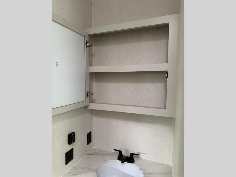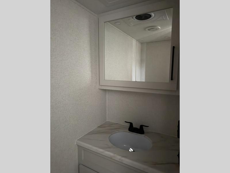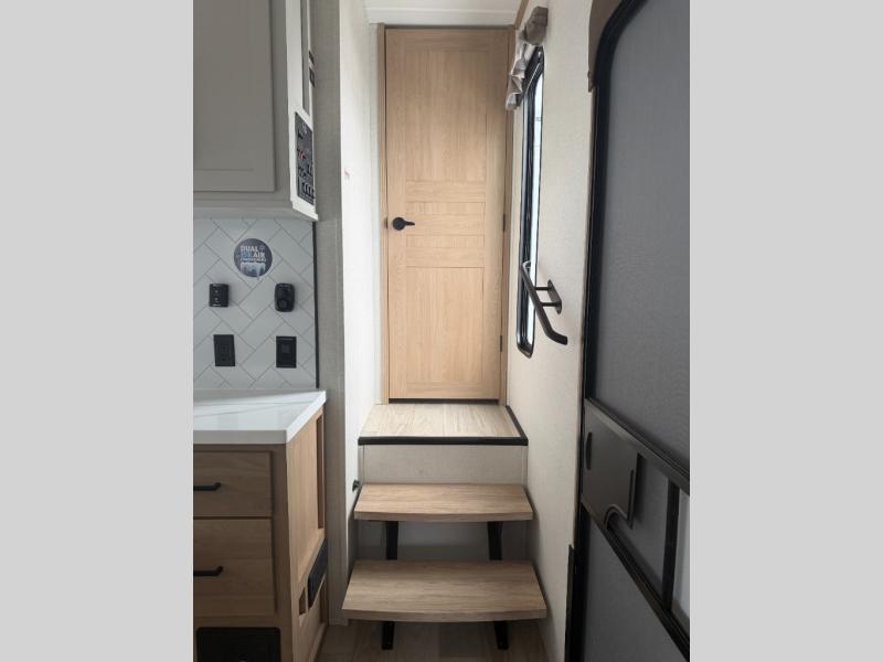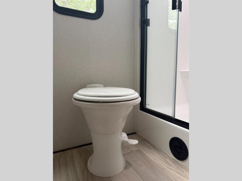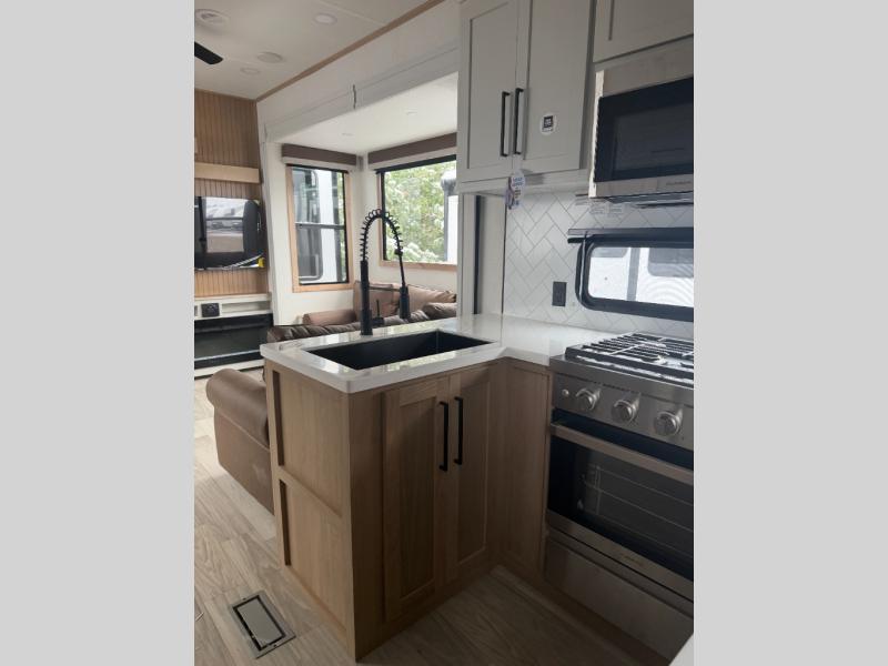 This fifth wheel is thoughtfully designed for comfort and convenience, starting with a spacious front bunkhouse perfect for accommodating guests. It features two flip-up bunks, 28" x 74" and 32" x 74" and a 60" x 74" fold-out lounge, along with a wardrobe, dresser, and additional storage to keep essentials organized. A nearby half bath adds easy access and extra convenience. At the center of the unit, the kitchen offers everything you need to prepare meals, including a stainless-steel sink, three-burner cooktop, and a generous 16 cu. ft. refrigerator. Meals can be enjoyed at the free-standing dinette, or you can unwind on the sectional sofa while enjoying the fireplace or entertainment center. At the rear, you'll find the private main bedroom with a roomy 66" x 80" RV king bed, plus its own wardrobe and dresser. Just steps away is the full bathroom featuring a one-piece fiberglass shower, sink with medicine cabinet, linen storage, and even washer/dryer prep for extended stays.