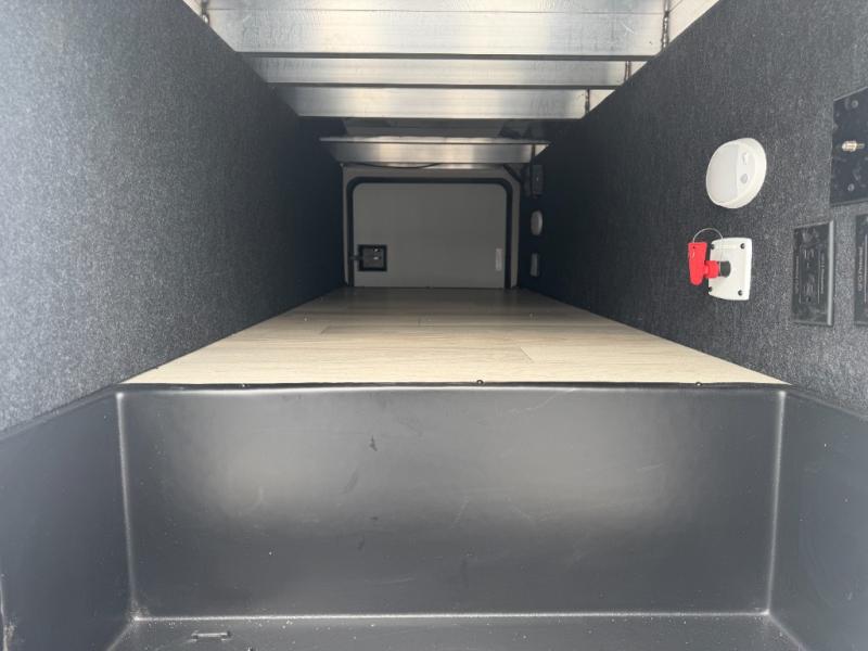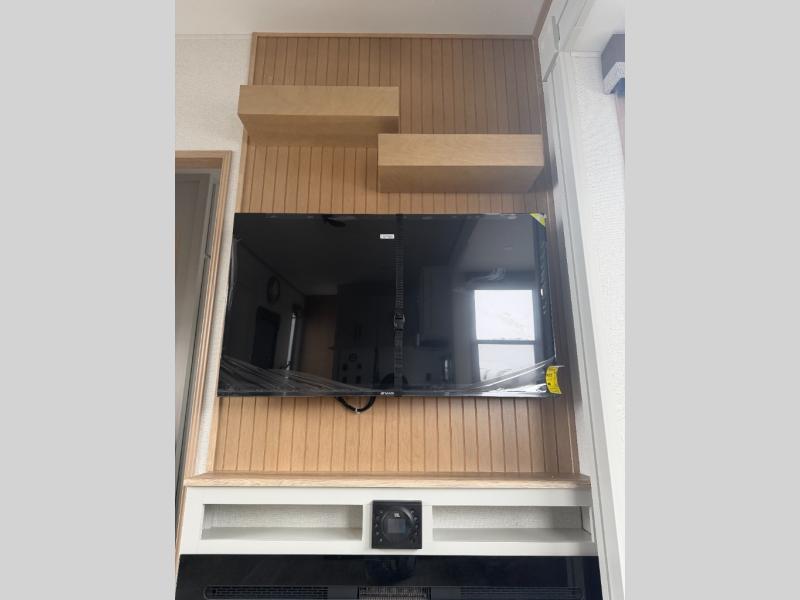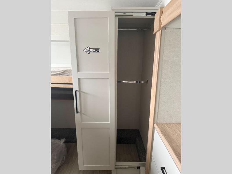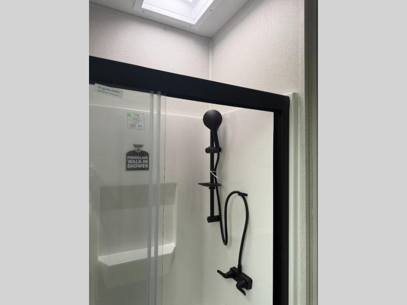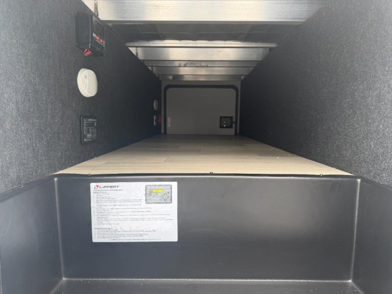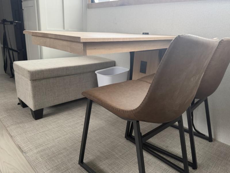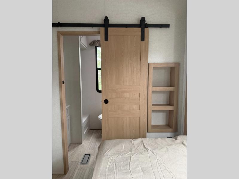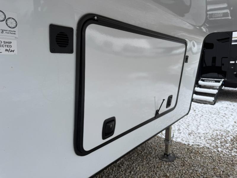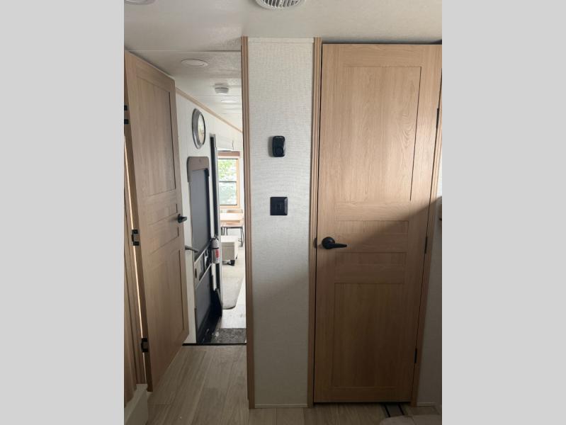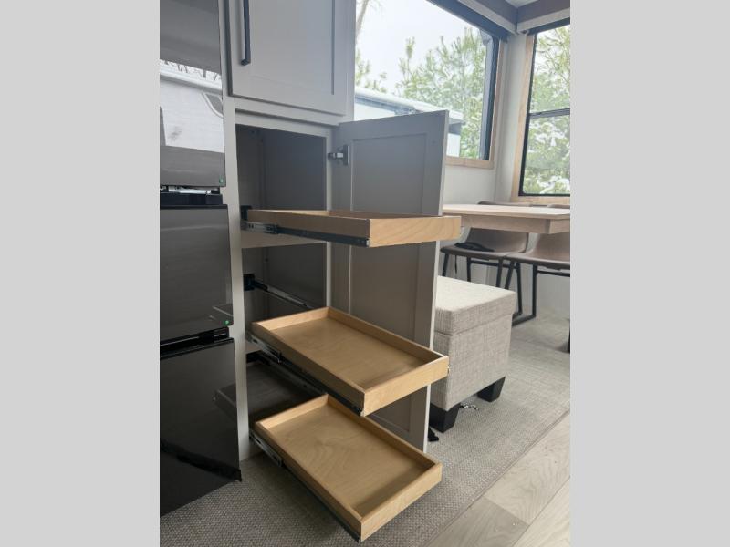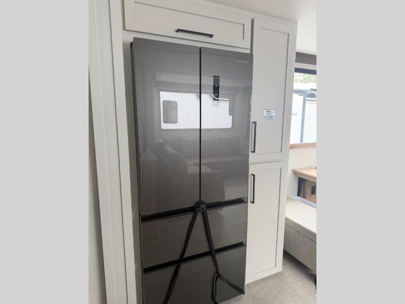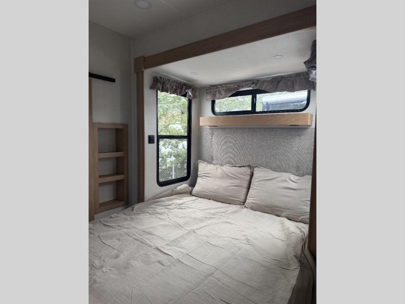 This fifth wheel is thoughtfully designed for comfort and convenience, starting with a spacious front bunkhouse perfect for accommodating guests. It features two flip-up bunks, 28" x 74" and 32" x 74" and a 60" x 74" fold-out lounge, along with a wardrobe, dresser, and additional storage to keep essentials organized. A nearby half bath adds easy access and extra convenience. At the center of the unit, the kitchen offers everything you need to prepare meals, including a stainless-steel sink, three-burner cooktop, and a generous 16 cu. ft. refrigerator. Meals can be enjoyed at the free-standing dinette, or you can unwind on the sectional sofa while enjoying the fireplace or entertainment center. At the rear, you'll find the private main bedroom with a roomy 66" x 80" RV king bed, plus its own wardrobe and dresser. Just steps away is the full bathroom featuring a one-piece fiberglass shower, sink with medicine cabinet, linen storage, and even washer/dryer prep for extended stays.
