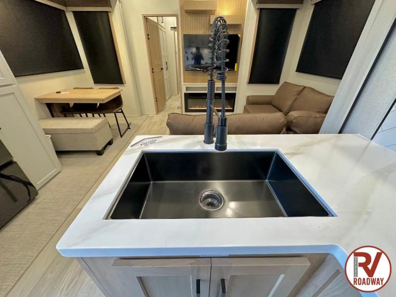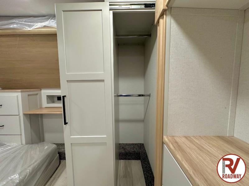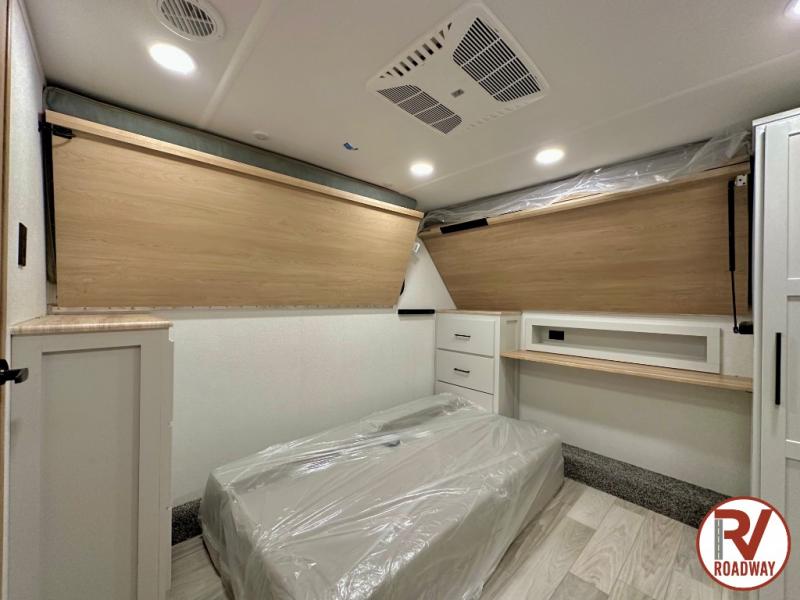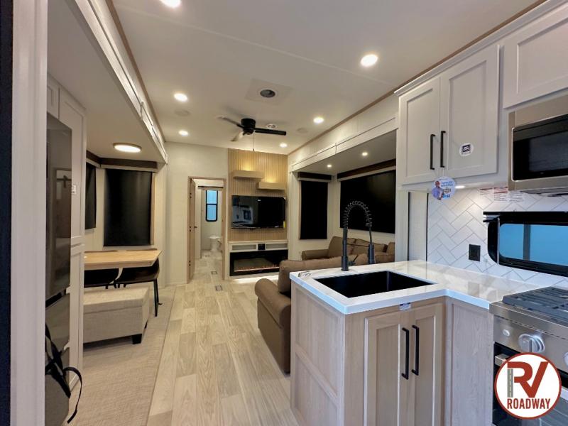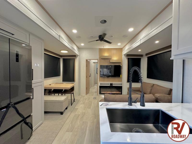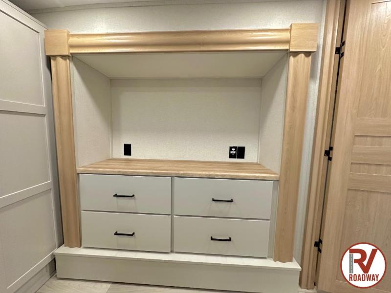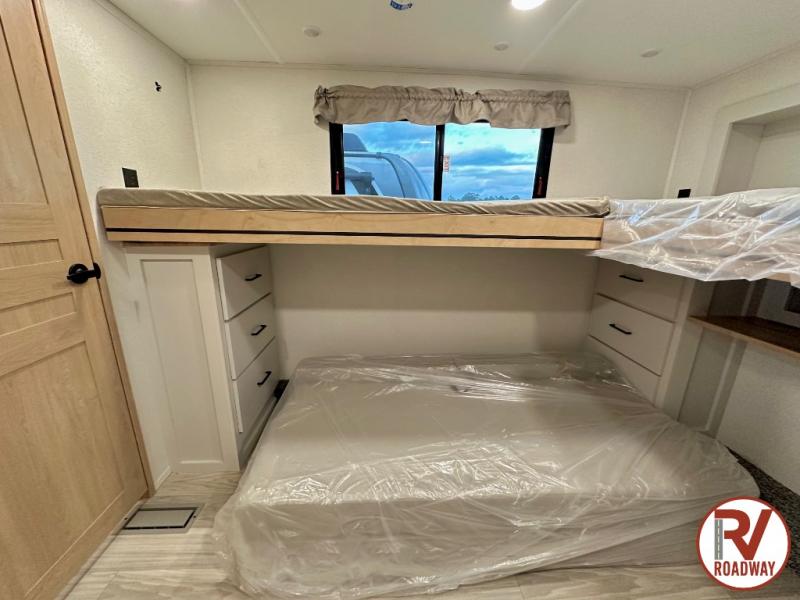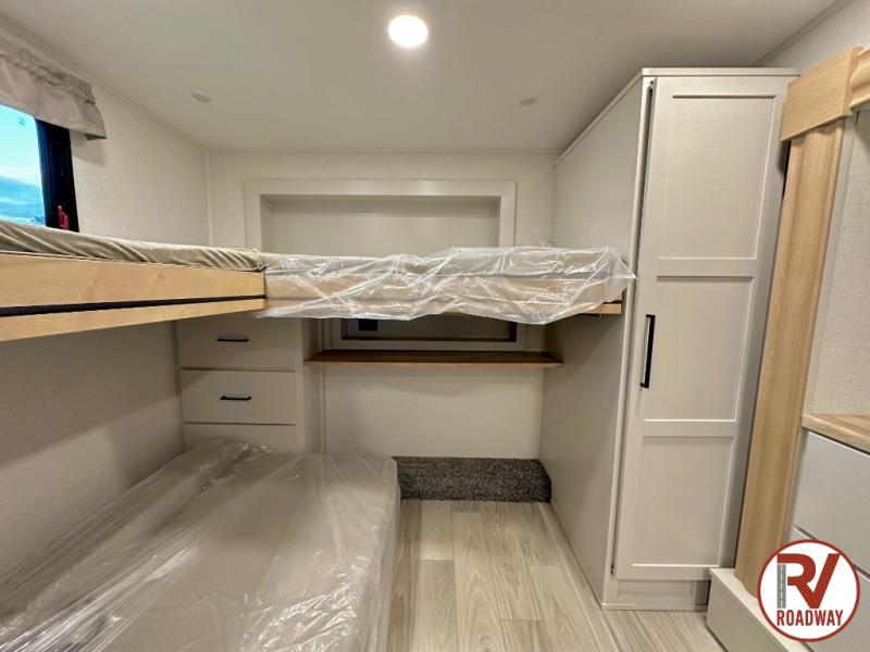 This fifth wheel is thoughtfully designed for comfort and convenience, starting with a spacious front bunkhouse perfect for accommodating guests. It features two flip-up bunks, 28" x 74" and 32" x 74" and a 60" x 74" fold-out lounge, along with a wardrobe, dresser, and additional storage to keep essentials organized. A nearby half bath adds easy access and extra convenience. At the center of the unit, the kitchen offers everything you need to prepare meals, including a stainless-steel sink, three-burner cooktop, and a generous 16 cu. ft. refrigerator. Meals can be enjoyed at the free-standing dinette, or you can unwind on the sectional sofa while enjoying the fireplace or entertainment center. At the rear, you'll find the private main bedroom with a roomy 66" x 80" RV king bed, plus its own wardrobe and dresser. Just steps away is the full bathroom featuring a one-piece fiberglass shower, sink with medicine cabinet, linen storage, and even washer/dryer prep for extended stays.
