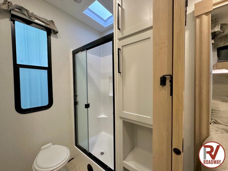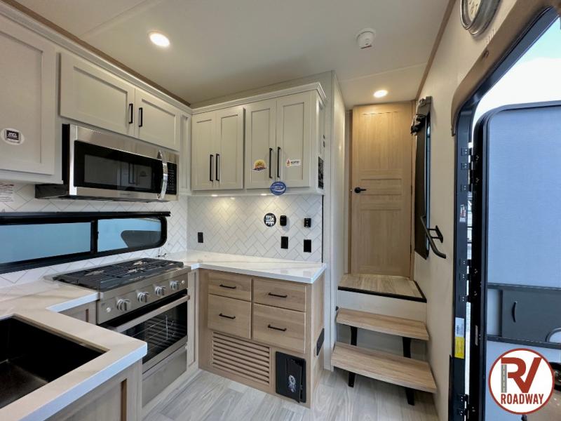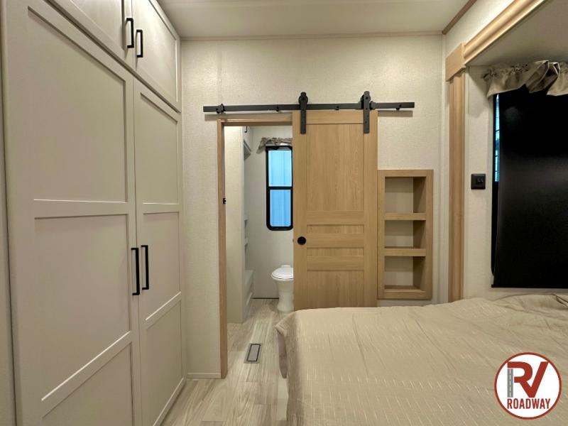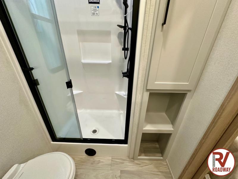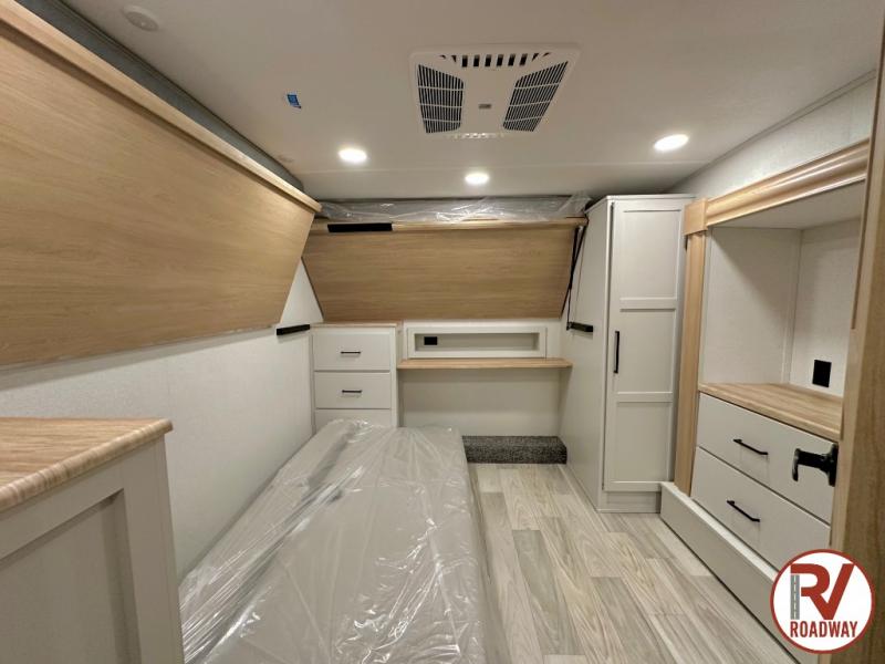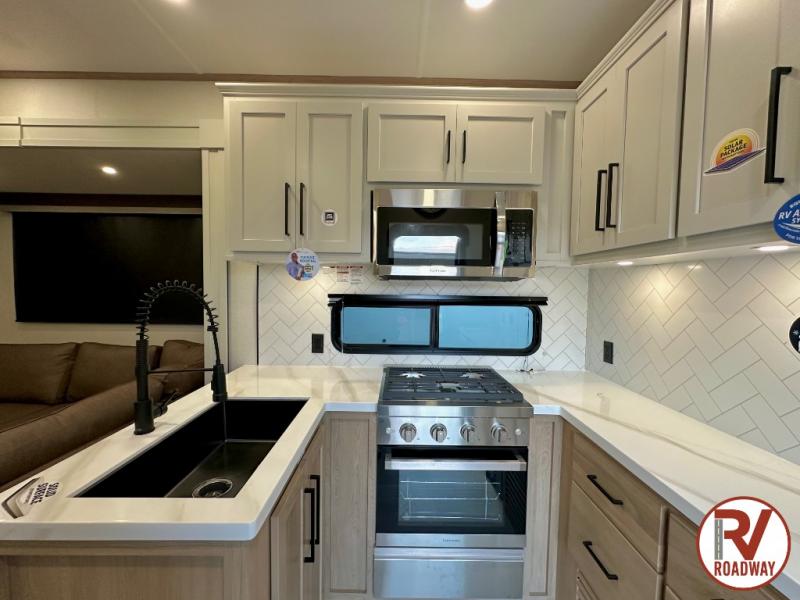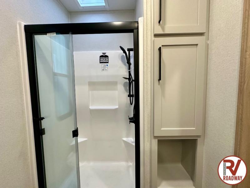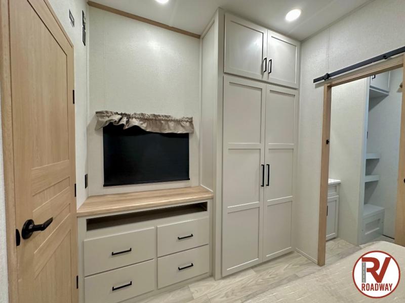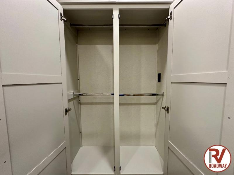 This fifth wheel is thoughtfully designed for comfort and convenience, starting with a spacious front bunkhouse perfect for accommodating guests. It features two flip-up bunks, 28" x 74" and 32" x 74" and a 60" x 74" fold-out lounge, along with a wardrobe, dresser, and additional storage to keep essentials organized. A nearby half bath adds easy access and extra convenience. At the center of the unit, the kitchen offers everything you need to prepare meals, including a stainless-steel sink, three-burner cooktop, and a generous 16 cu. ft. refrigerator. Meals can be enjoyed at the free-standing dinette, or you can unwind on the sectional sofa while enjoying the fireplace or entertainment center. At the rear, you'll find the private main bedroom with a roomy 66" x 80" RV king bed, plus its own wardrobe and dresser. Just steps away is the full bathroom featuring a one-piece fiberglass shower, sink with medicine cabinet, linen storage, and even washer/dryer prep for extended stays.
