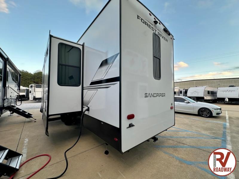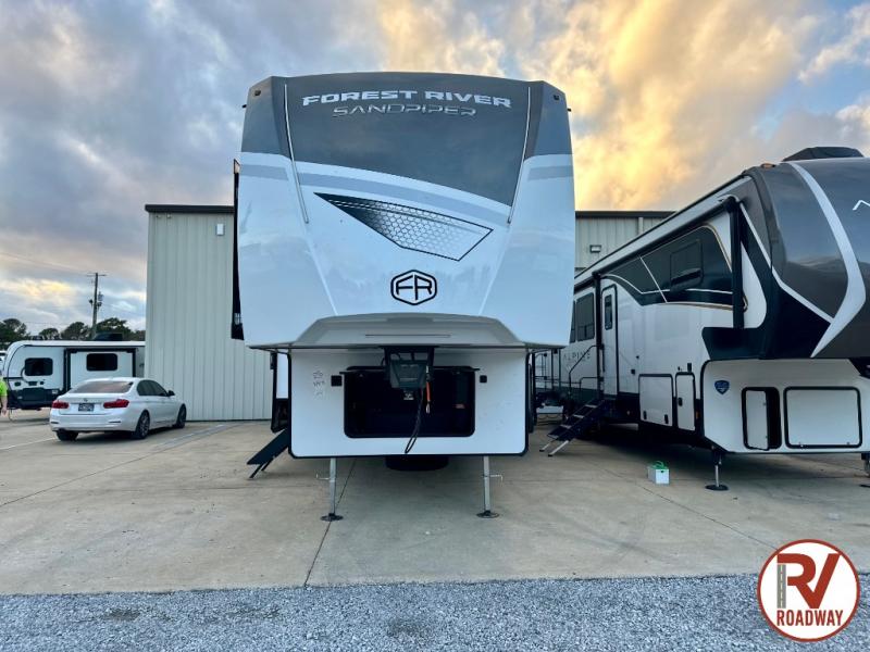 You will find the perfect balance of size, space, features, and luxury with any one of these Forest River Sandpiper fifth wheels! They have a cambered powder coated frame with rust prohibitor, and a fully enclosed underbelly for added protection against the elements. Also, the power front jacks with spring-loaded pins enhance the convenience, speed, and safety. The large, tinted windows come with a 80/20 UV prohibitors. Some hassle-free amenities include a 60k BTU on-demand water heater, porcelain foot flush toilet(s), tire pressure monitor system, and an electric leveling system! Inside, you'll enjoy stainless steel kitchen package, solid surface kitchen countertops, Beachside Sundance Congoleum linoleum, recessed residential lighting, and many more comforts!