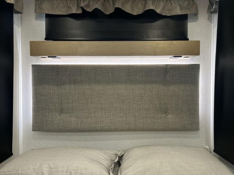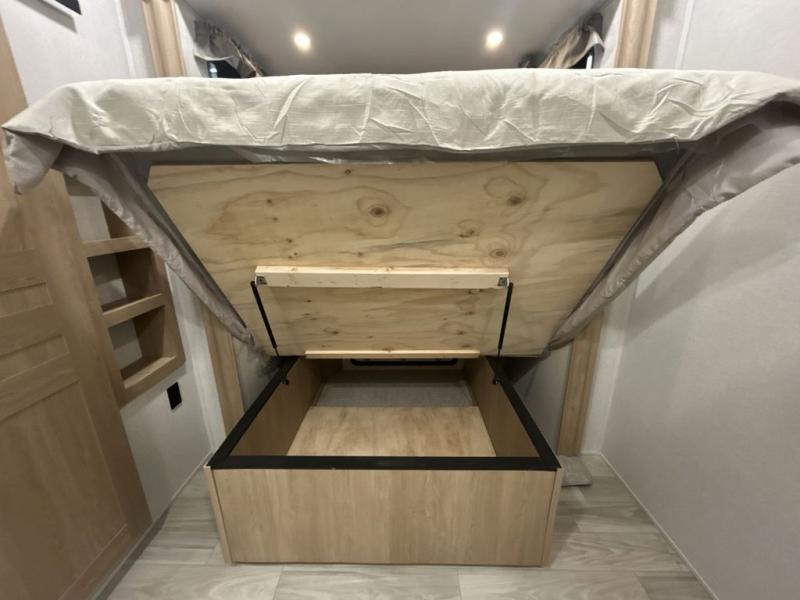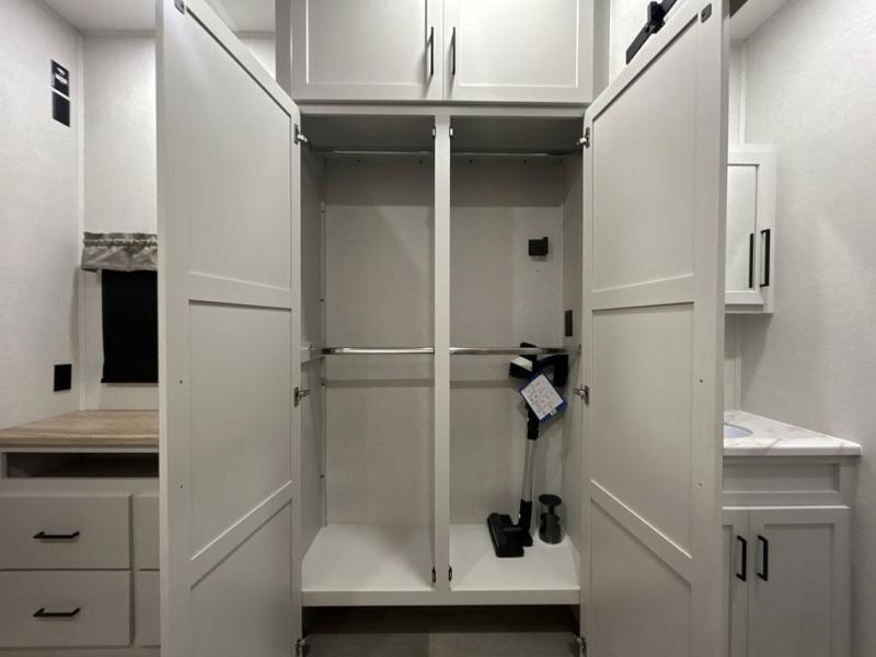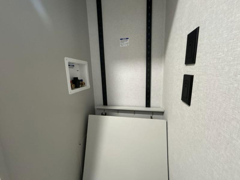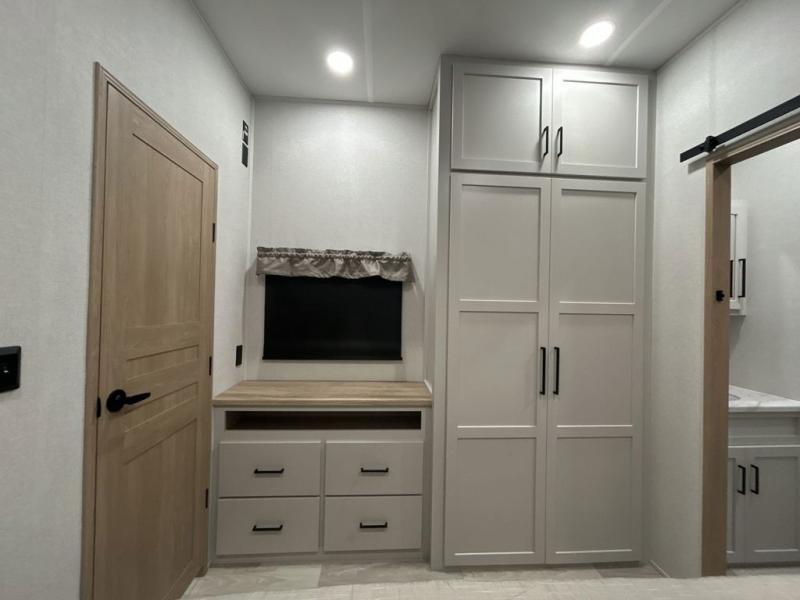 This fifth wheel is thoughtfully designed for comfort and convenience, starting with a spacious front bunkhouse perfect for accommodating guests. It features two flip-up bunks, 28" x 74" and 32" x 74" and a 60" x 74" fold-out lounge, along with a wardrobe, dresser, and additional storage to keep essentials organized. A nearby half bath adds easy access and extra convenience. At the center of the unit, the kitchen offers everything you need to prepare meals, including a stainless-steel sink, three-burner cooktop, and a generous 16 cu. ft. refrigerator. Meals can be enjoyed at the free-standing dinette, or you can unwind on the sectional sofa while enjoying the fireplace or entertainment center. At the rear, you'll find the private main bedroom with a roomy 66" x 80" RV king bed, plus its own wardrobe and dresser. Just steps away is the full bathroom featuring a one-piece fiberglass shower, sink with medicine cabinet, linen storage, and even washer/dryer prep for extended stays.