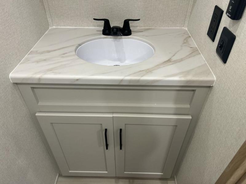 You will find the perfect balance of size, space, features, and luxury with any one of these Forest River Sandpiper fifth wheels! They have a cambered powder coated frame with rust prohibitor, and a fully enclosed underbelly for added protection against the elements. Also, the power front jacks with spring-loaded pins enhance the convenience, speed, and safety. The large, tinted windows come with a 80/20 UV prohibitors. Some hassle-free amenities include a 60k BTU on-demand water heater, porcelain foot flush toilet(s), tire pressure monitor system, and an electric leveling system! Inside, you'll enjoy stainless steel kitchen package, solid surface kitchen countertops, Beachside Sundance Congoleum linoleum, recessed residential lighting, and many more comforts!