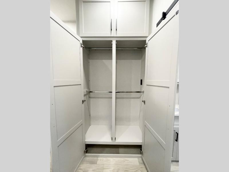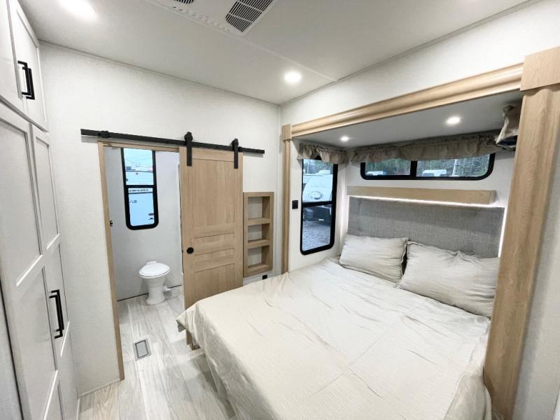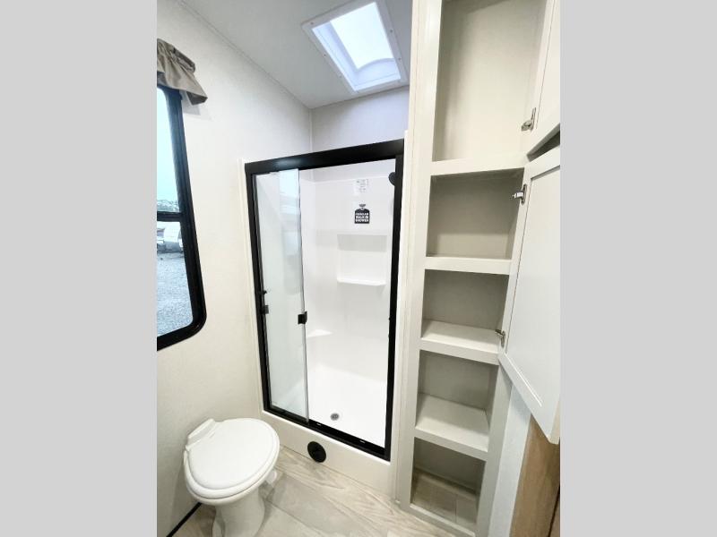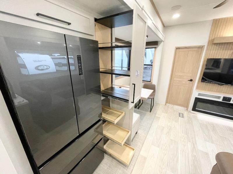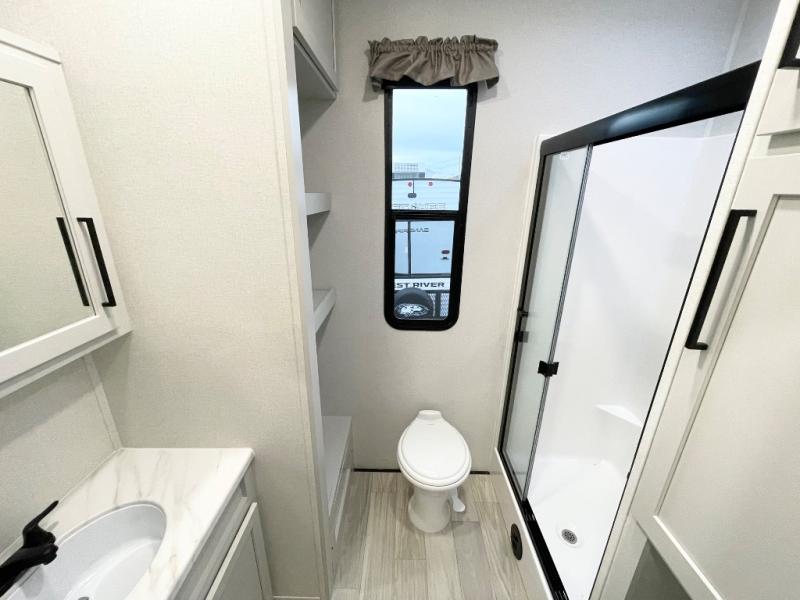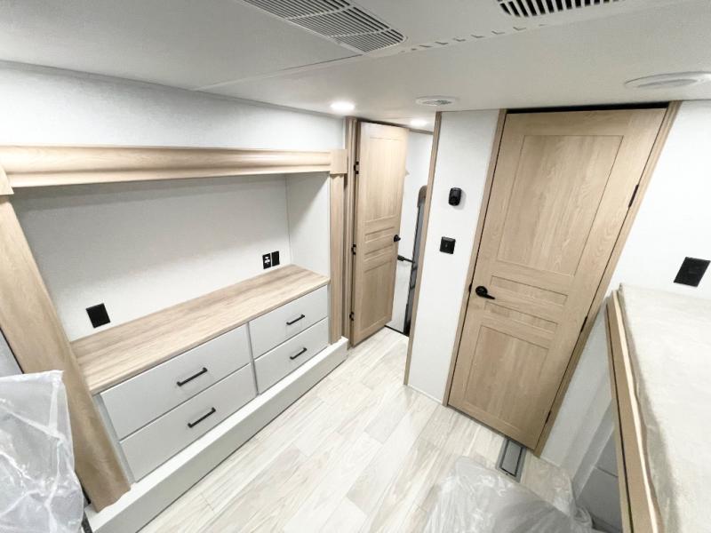 This fifth wheel is thoughtfully designed for comfort and convenience, starting with a spacious front bunkhouse perfect for accommodating guests. It features two flip-up bunks, 28" x 74" and 32" x 74" and a 60" x 74" fold-out lounge, along with a wardrobe, dresser, and additional storage to keep essentials organized. A nearby half bath adds easy access and extra convenience. At the center of the unit, the kitchen offers everything you need to prepare meals, including a stainless-steel sink, three-burner cooktop, and a generous 16 cu. ft. refrigerator. Meals can be enjoyed at the free-standing dinette, or you can unwind on the sectional sofa while enjoying the fireplace or entertainment center. At the rear, you'll find the private main bedroom with a roomy 66" x 80" RV king bed, plus its own wardrobe and dresser. Just steps away is the full bathroom featuring a one-piece fiberglass shower, sink with medicine cabinet, linen storage, and even washer/dryer prep for extended stays.