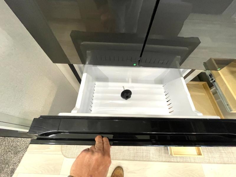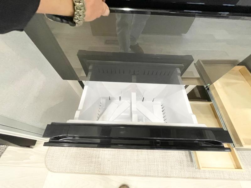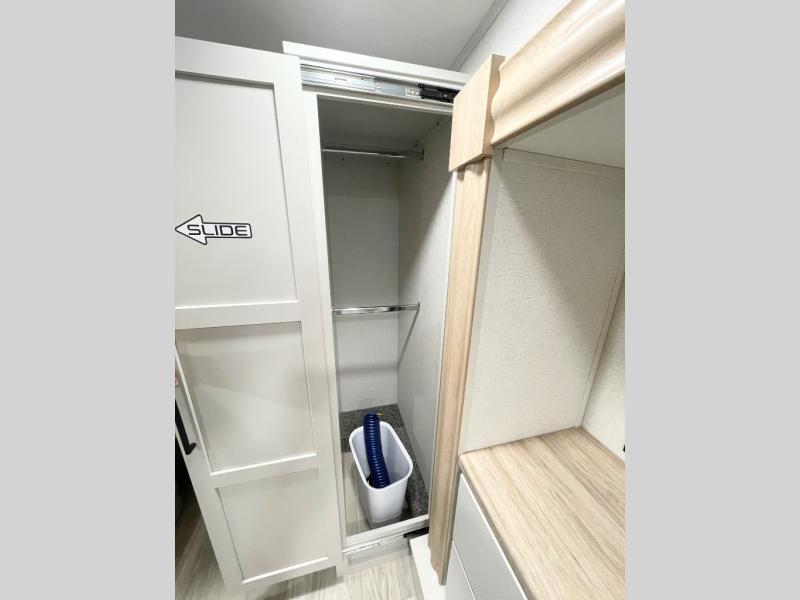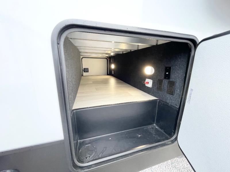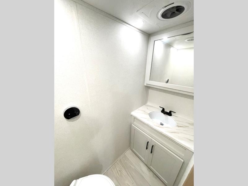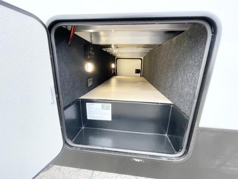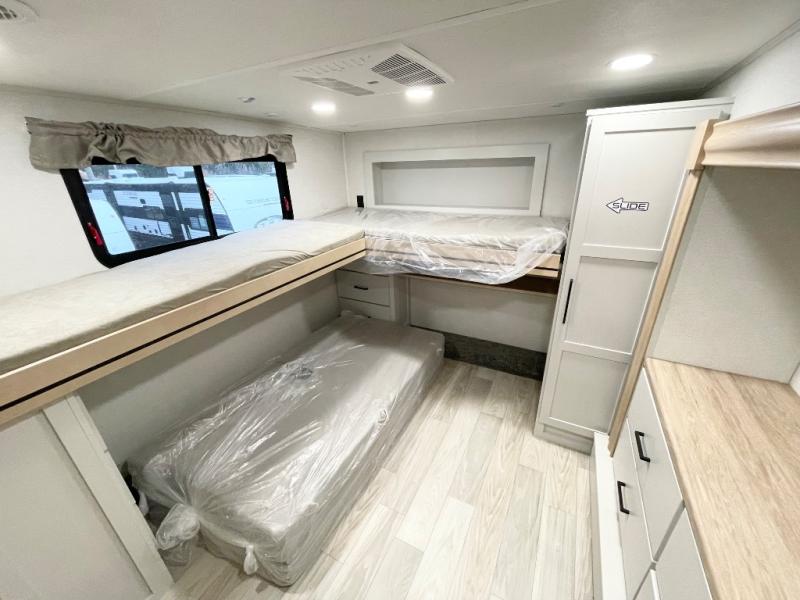 This fifth wheel is thoughtfully designed for comfort and convenience, starting with a spacious front bunkhouse perfect for accommodating guests. It features two flip-up bunks, 28" x 74" and 32" x 74" and a 60" x 74" fold-out lounge, along with a wardrobe, dresser, and additional storage to keep essentials organized. A nearby half bath adds easy access and extra convenience. At the center of the unit, the kitchen offers everything you need to prepare meals, including a stainless-steel sink, three-burner cooktop, and a generous 16 cu. ft. refrigerator. Meals can be enjoyed at the free-standing dinette, or you can unwind on the sectional sofa while enjoying the fireplace or entertainment center. At the rear, you'll find the private main bedroom with a roomy 66" x 80" RV king bed, plus its own wardrobe and dresser. Just steps away is the full bathroom featuring a one-piece fiberglass shower, sink with medicine cabinet, linen storage, and even washer/dryer prep for extended stays.