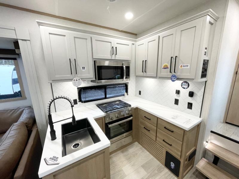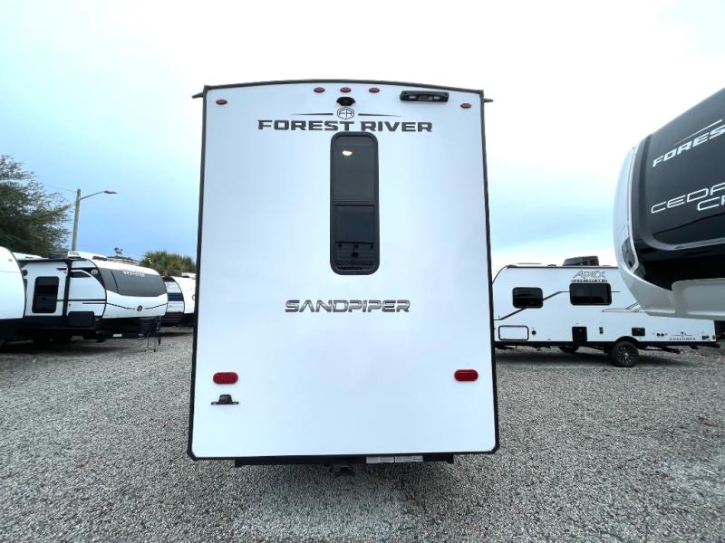 You will find the perfect balance of size, space, features, and luxury with any one of these Forest River Sandpiper fifth wheels! They have a cambered powder coated frame with rust prohibitor, and a fully enclosed underbelly for added protection against the elements. Also, the power front jacks with spring-loaded pins enhance the convenience, speed, and safety. The large, tinted windows come with a 80/20 UV prohibitors. Some hassle-free amenities include a 60k BTU on-demand water heater, porcelain foot flush toilet(s), tire pressure monitor system, and an electric leveling system! Inside, you'll enjoy stainless steel kitchen package, solid surface kitchen countertops, Beachside Sundance Congoleum linoleum, recessed residential lighting, and many more comforts!