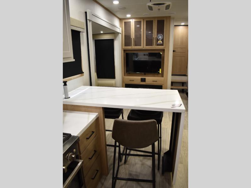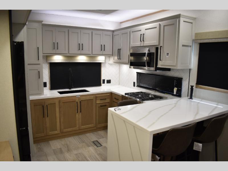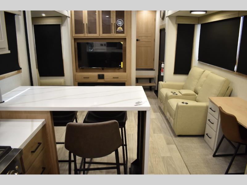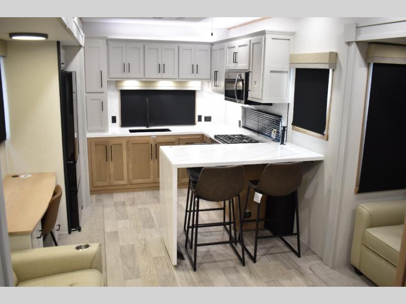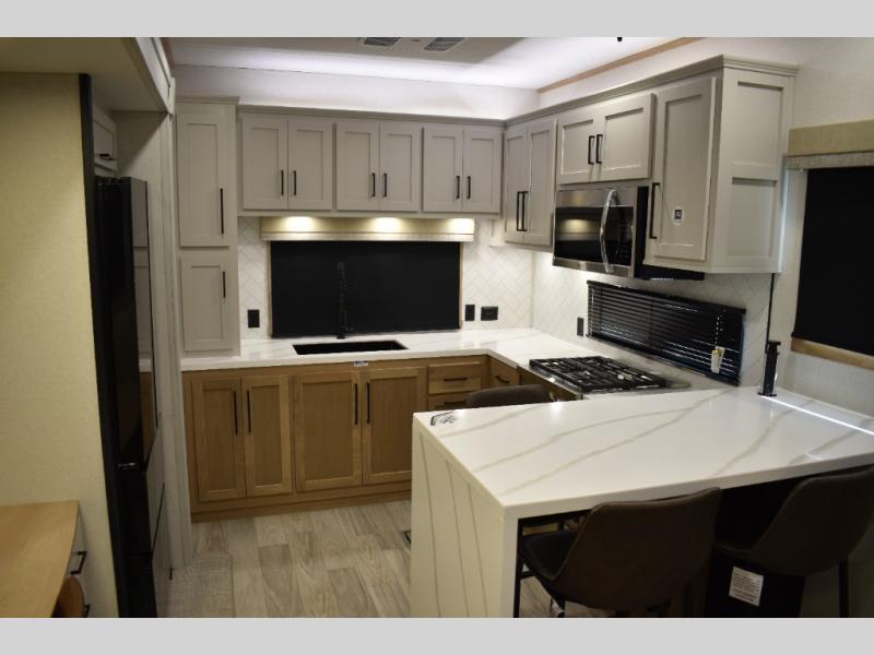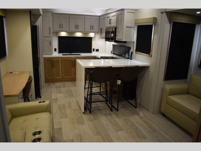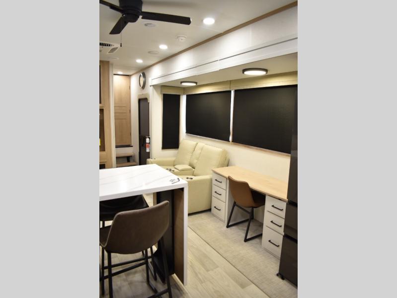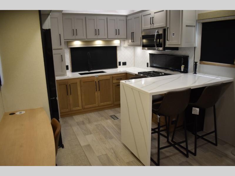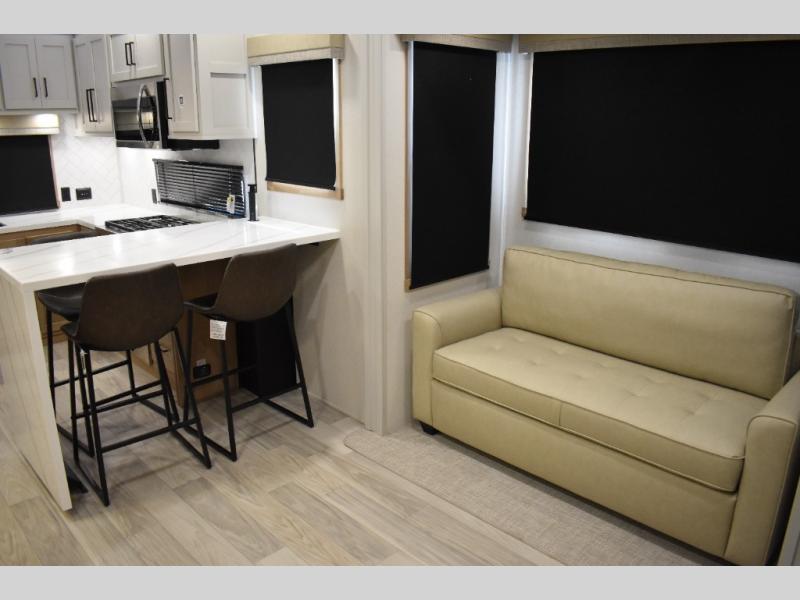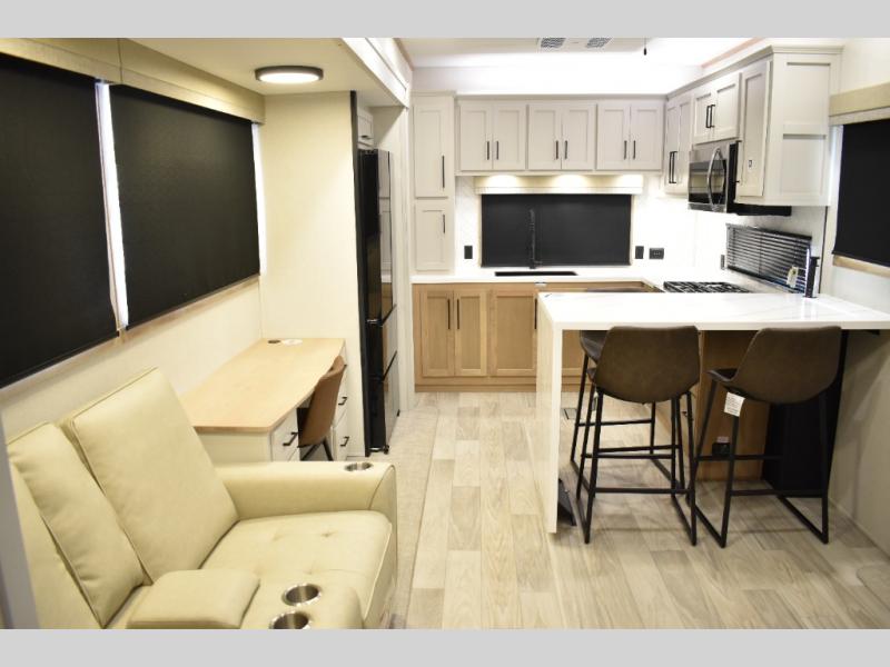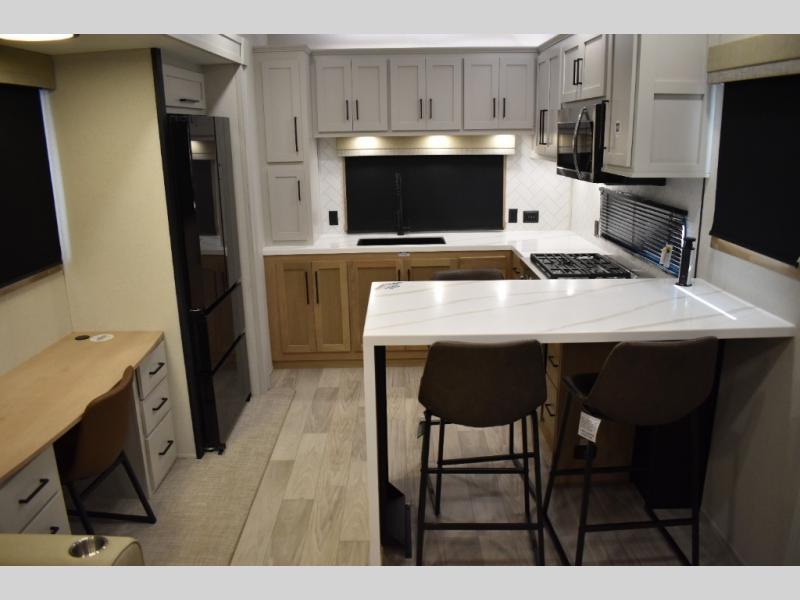 If you're looking to go full-time RVing, this fifth wheel is packed with convenient features! The master bedroom includes a king bed slide out with USB ports on either side of the bed so you both can charge your phones, and there is a dresser for your folded clothes. You will love the front bathroom with dual bath sinks, a shower with a seat, plus a walk-in closet with shelves! There is a unique middle utility room with washer and dryer prep and a counter that will make a perfect laundry room, or you can utilize this space for storage! Head to the main living area to relax on the theater seating or hide-a-bed sofa, and if you have guests stay over, they can sleep here. There is also an entertainment center with a 50" flat screen TV, but you might just leave that off if you're working at the desk with a chair that is provided. We've saved the best part for last; the kitchen! Here, you'll find ample counter space to prep home-cooked meals, a three burner range with a 24" oven, plus a large counter with barstools where you can enjoy breakfast at each morning. Choosing this fifth wheel is a no-brainer!