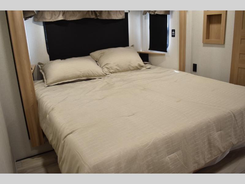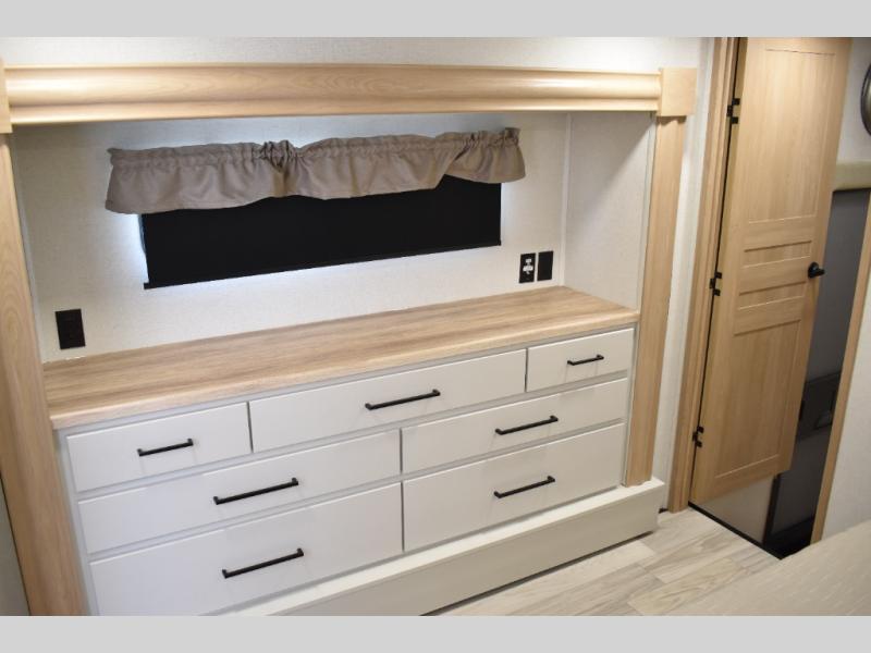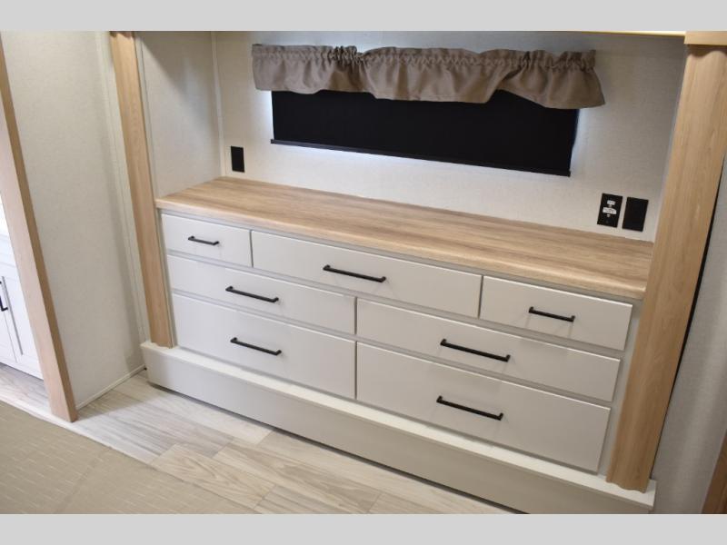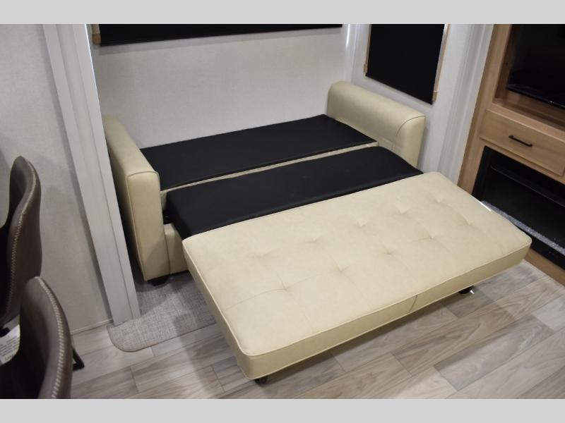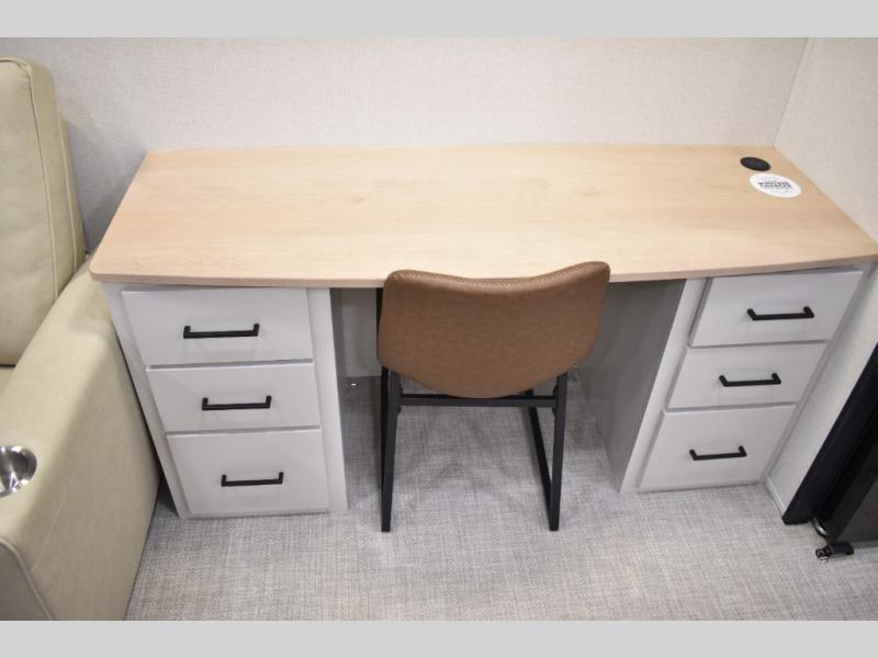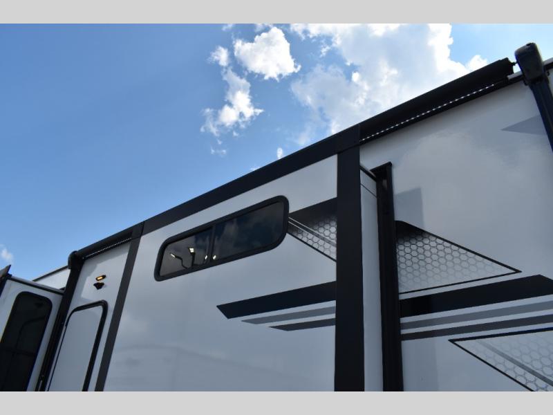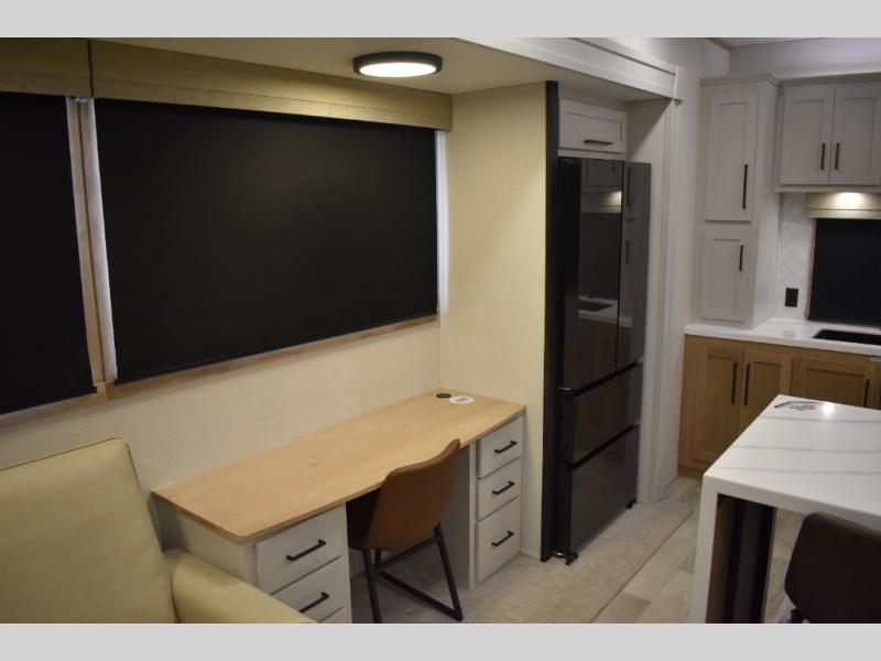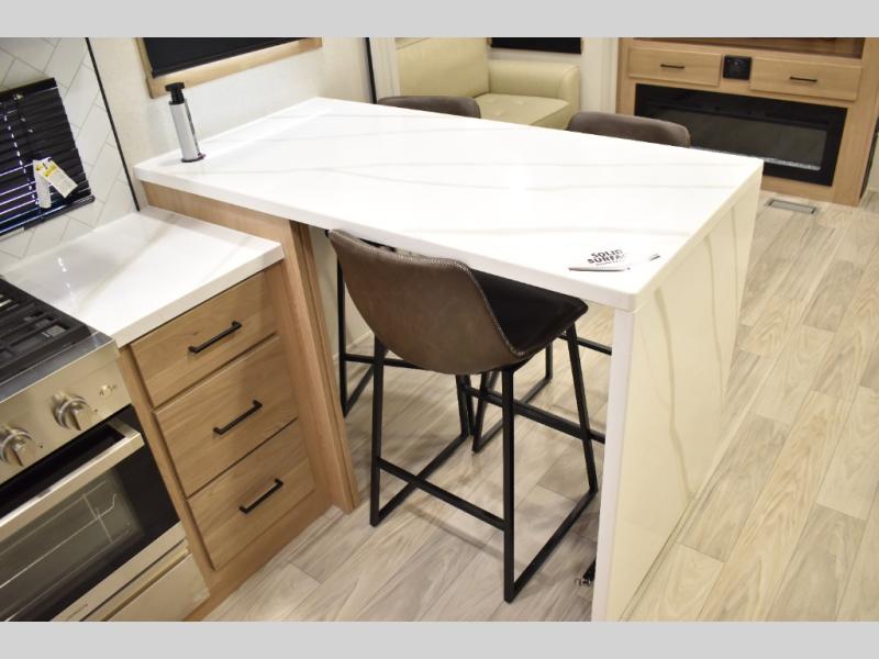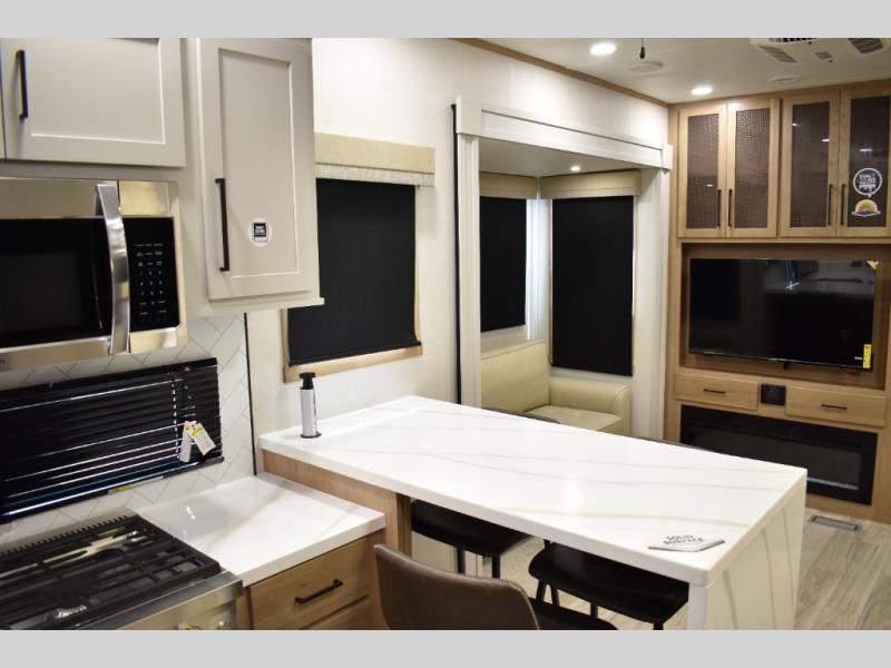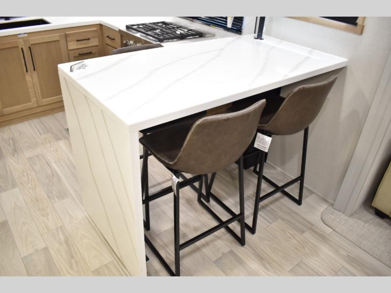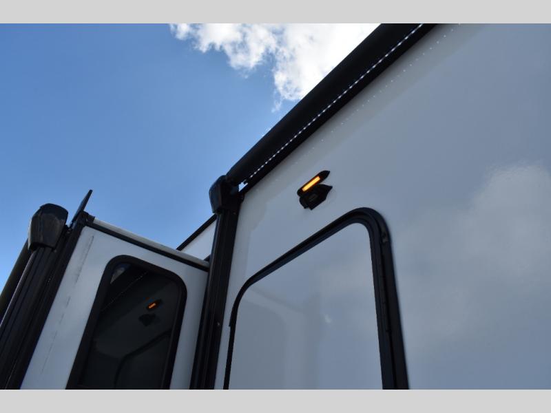 If you're looking to go full-time RVing, this fifth wheel is packed with convenient features! The master bedroom includes a king bed slide out with USB ports on either side of the bed so you both can charge your phones, and there is a dresser for your folded clothes. You will love the front bathroom with dual bath sinks, a shower with a seat, plus a walk-in closet with shelves! There is a unique middle utility room with washer and dryer prep and a counter that will make a perfect laundry room, or you can utilize this space for storage! Head to the main living area to relax on the theater seating or hide-a-bed sofa, and if you have guests stay over, they can sleep here. There is also an entertainment center with a 50" flat screen TV, but you might just leave that off if you're working at the desk with a chair that is provided. We've saved the best part for last; the kitchen! Here, you'll find ample counter space to prep home-cooked meals, a three burner range with a 24" oven, plus a large counter with barstools where you can enjoy breakfast at each morning. Choosing this fifth wheel is a no-brainer!
