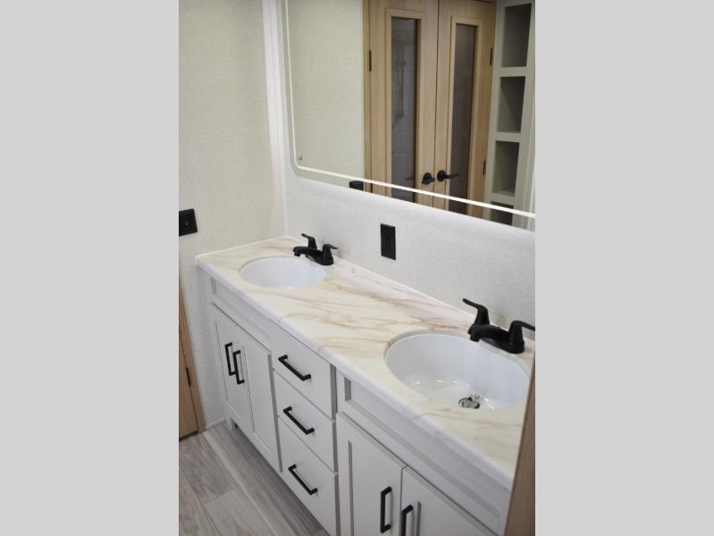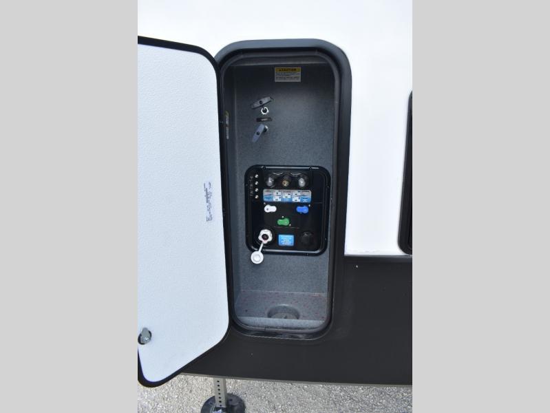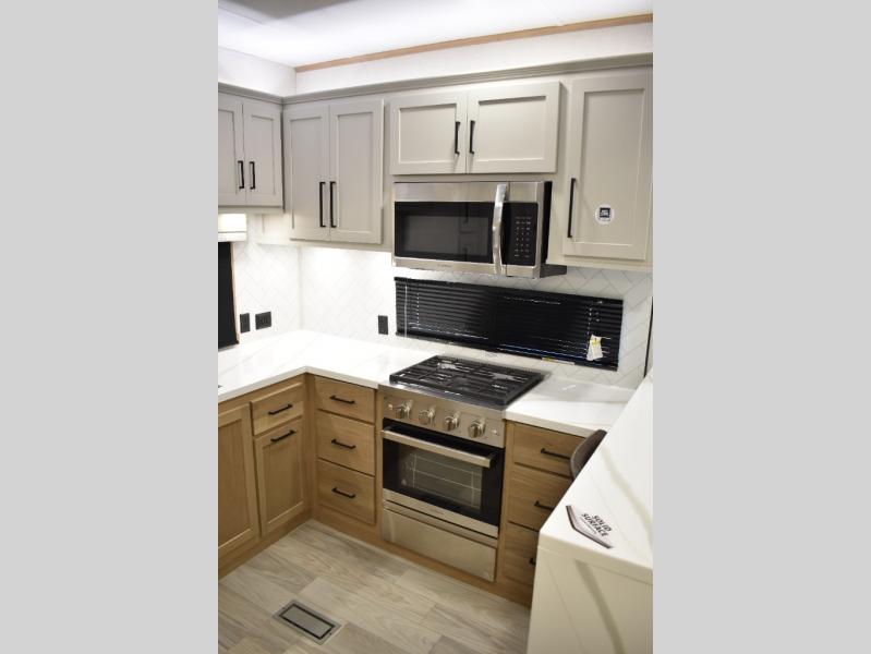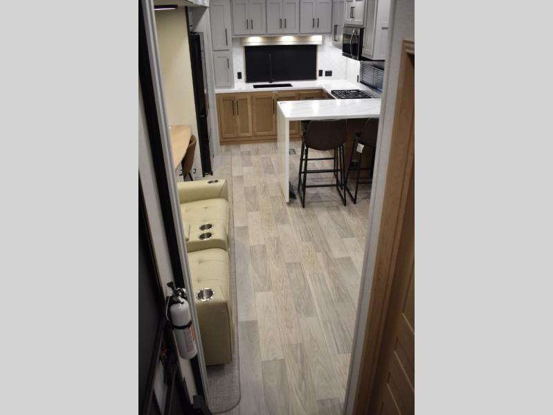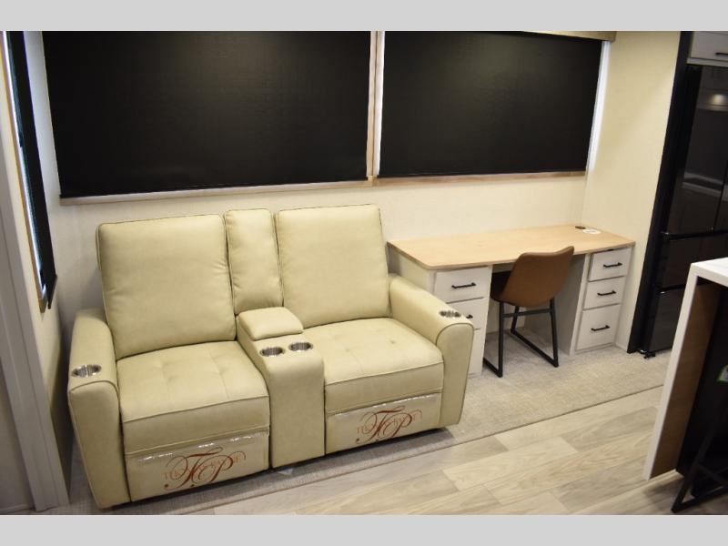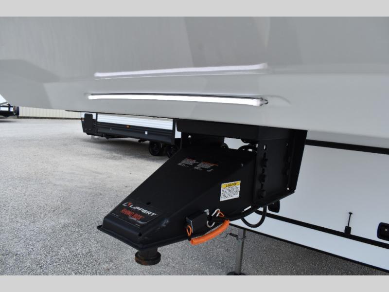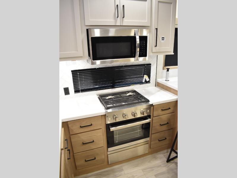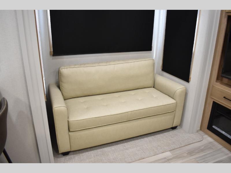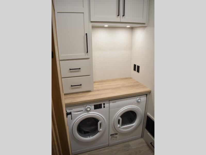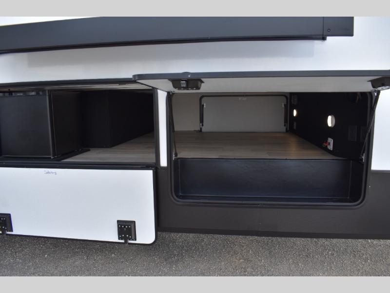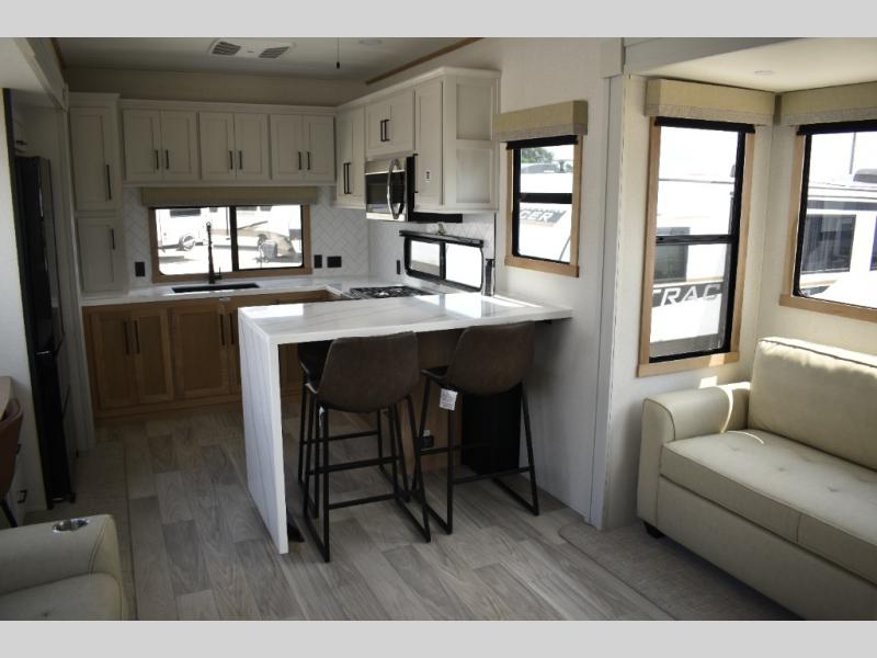 If you're looking to go full-time RVing, this fifth wheel is packed with convenient features! The master bedroom includes a king bed slide out with USB ports on either side of the bed so you both can charge your phones, and there is a dresser for your folded clothes. You will love the front bathroom with dual bath sinks, a shower with a seat, plus a walk-in closet with shelves! There is a unique middle utility room with washer and dryer prep and a counter that will make a perfect laundry room, or you can utilize this space for storage! Head to the main living area to relax on the theater seating or hide-a-bed sofa, and if you have guests stay over, they can sleep here. There is also an entertainment center with a 50" flat screen TV, but you might just leave that off if you're working at the desk with a chair that is provided. We've saved the best part for last; the kitchen! Here, you'll find ample counter space to prep home-cooked meals, a three burner range with a 24" oven, plus a large counter with barstools where you can enjoy breakfast at each morning. Choosing this fifth wheel is a no-brainer!