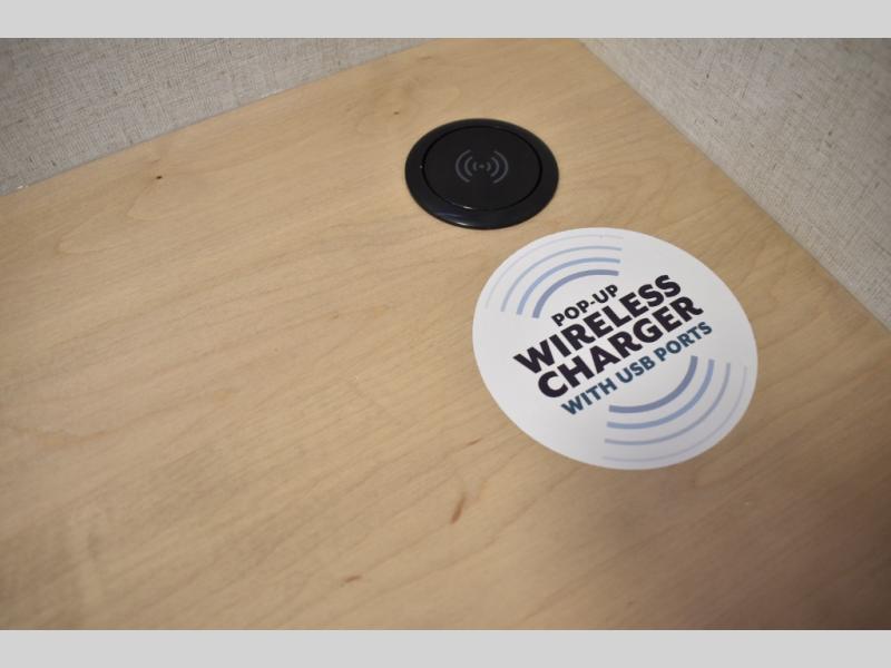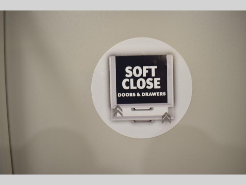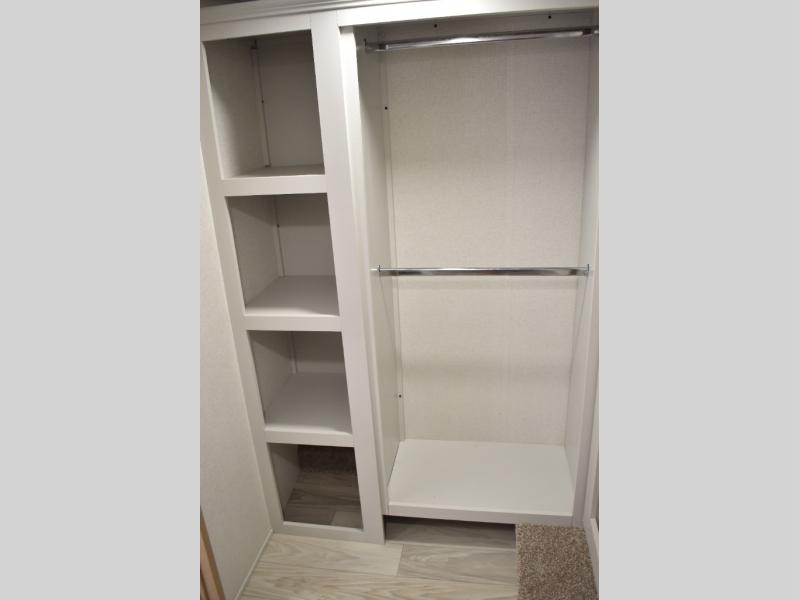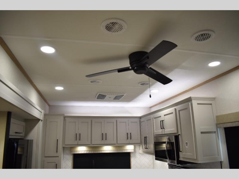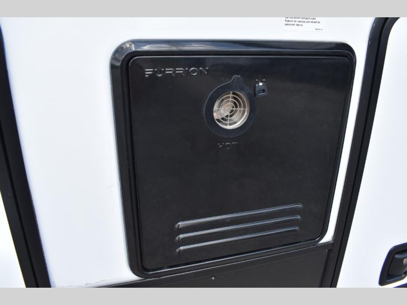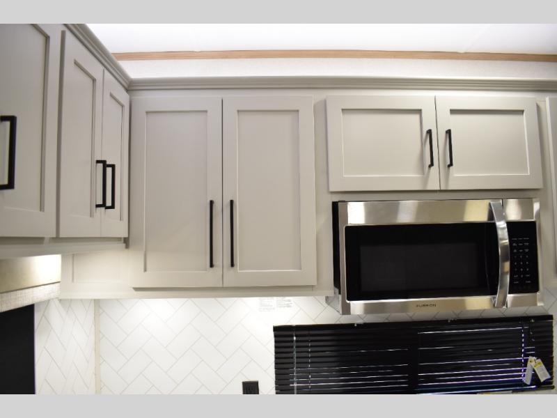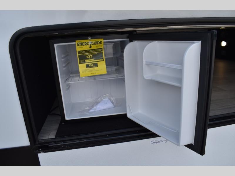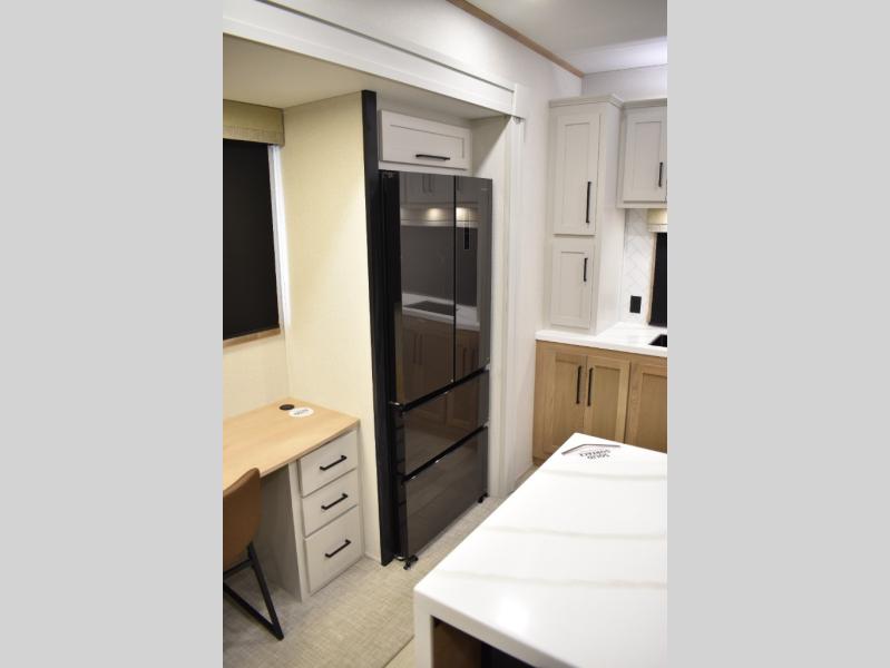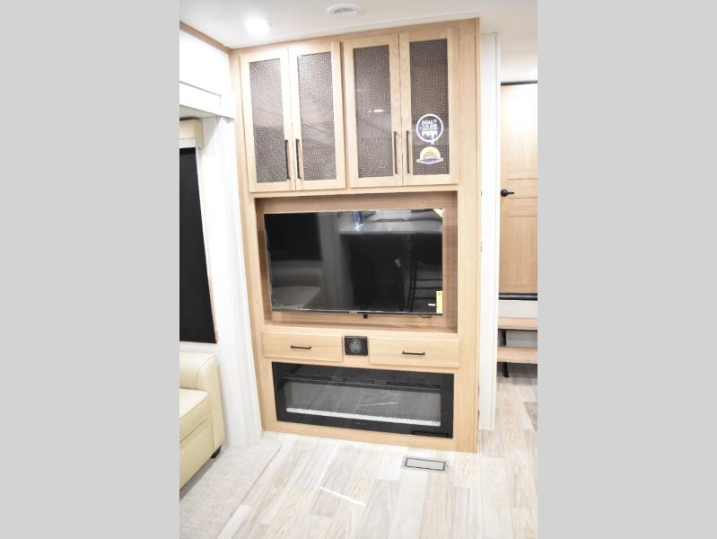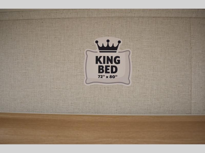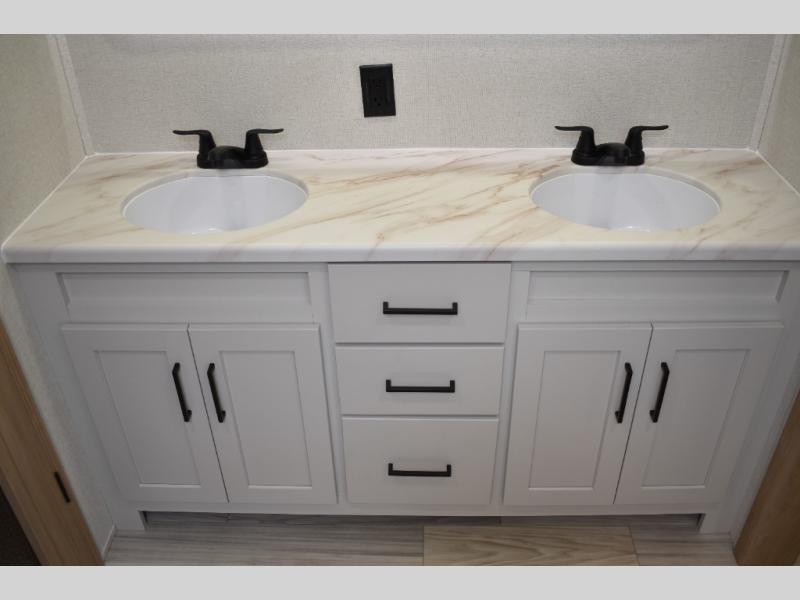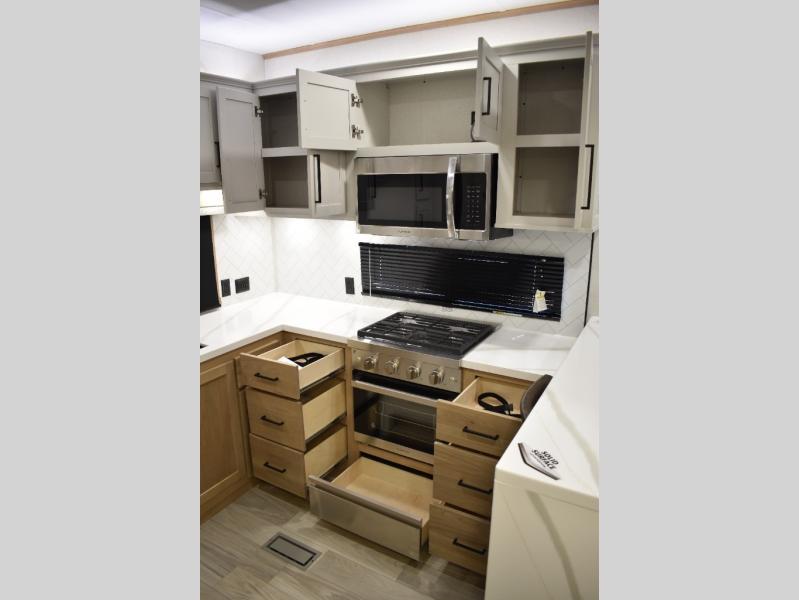 If you're looking to go full-time RVing, this fifth wheel is packed with convenient features! The master bedroom includes a king bed slide out with USB ports on either side of the bed so you both can charge your phones, and there is a dresser for your folded clothes. You will love the front bathroom with dual bath sinks, a shower with a seat, plus a walk-in closet with shelves! There is a unique middle utility room with washer and dryer prep and a counter that will make a perfect laundry room, or you can utilize this space for storage! Head to the main living area to relax on the theater seating or hide-a-bed sofa, and if you have guests stay over, they can sleep here. There is also an entertainment center with a 50" flat screen TV, but you might just leave that off if you're working at the desk with a chair that is provided. We've saved the best part for last; the kitchen! Here, you'll find ample counter space to prep home-cooked meals, a three burner range with a 24" oven, plus a large counter with barstools where you can enjoy breakfast at each morning. Choosing this fifth wheel is a no-brainer!