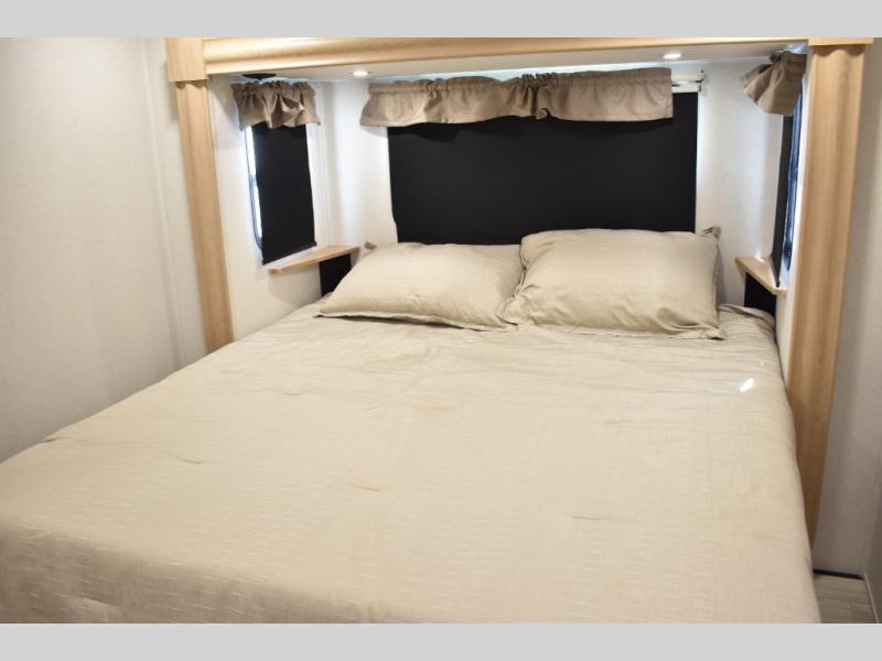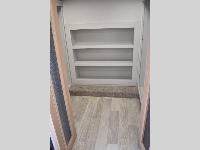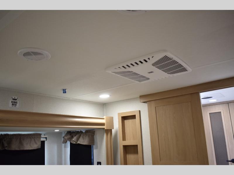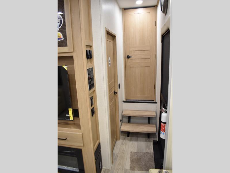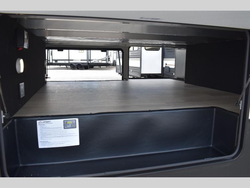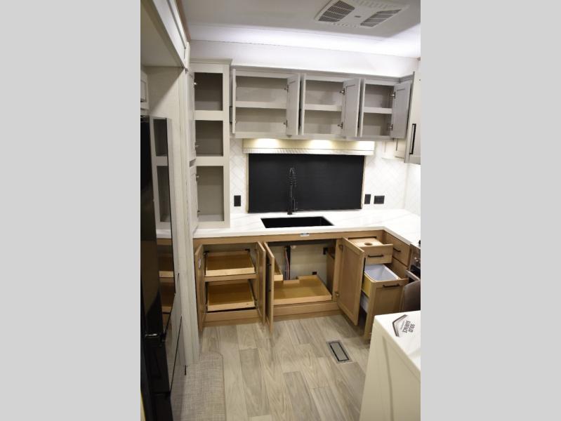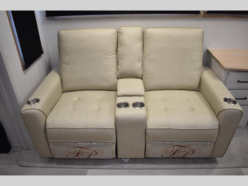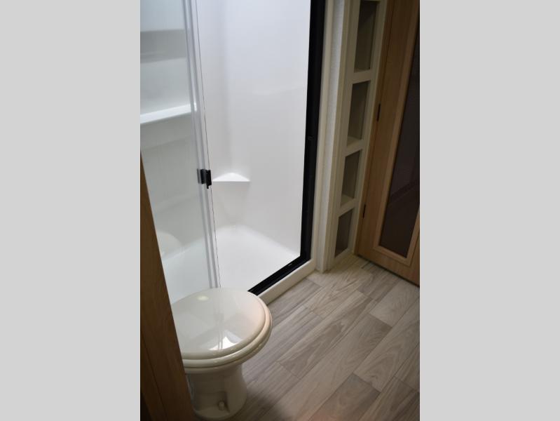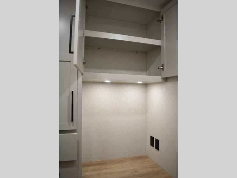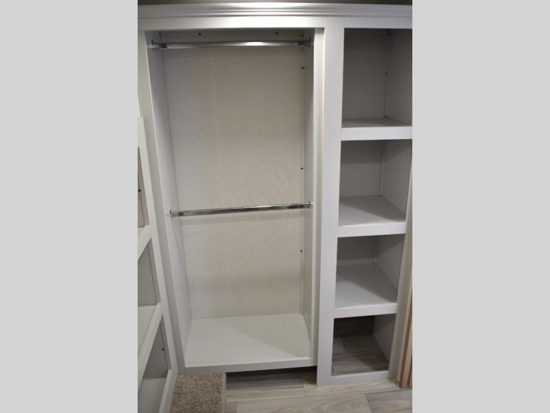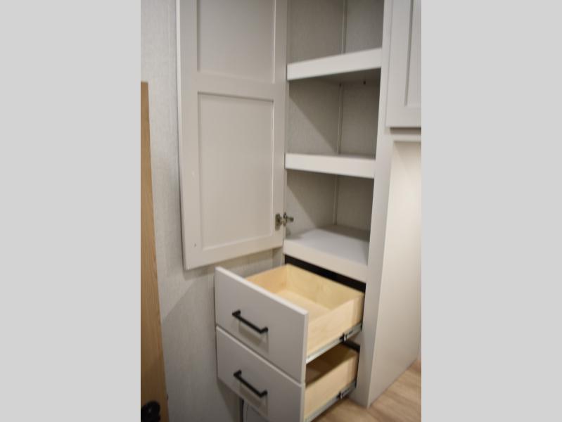 If you're looking to go full-time RVing, this fifth wheel is packed with convenient features! The master bedroom includes a king bed slide out with USB ports on either side of the bed so you both can charge your phones, and there is a dresser for your folded clothes. You will love the front bathroom with dual bath sinks, a shower with a seat, plus a walk-in closet with shelves! There is a unique middle utility room with washer and dryer prep and a counter that will make a perfect laundry room, or you can utilize this space for storage! Head to the main living area to relax on the theater seating or hide-a-bed sofa, and if you have guests stay over, they can sleep here. There is also an entertainment center with a 50" flat screen TV, but you might just leave that off if you're working at the desk with a chair that is provided. We've saved the best part for last; the kitchen! Here, you'll find ample counter space to prep home-cooked meals, a three burner range with a 24" oven, plus a large counter with barstools where you can enjoy breakfast at each morning. Choosing this fifth wheel is a no-brainer!