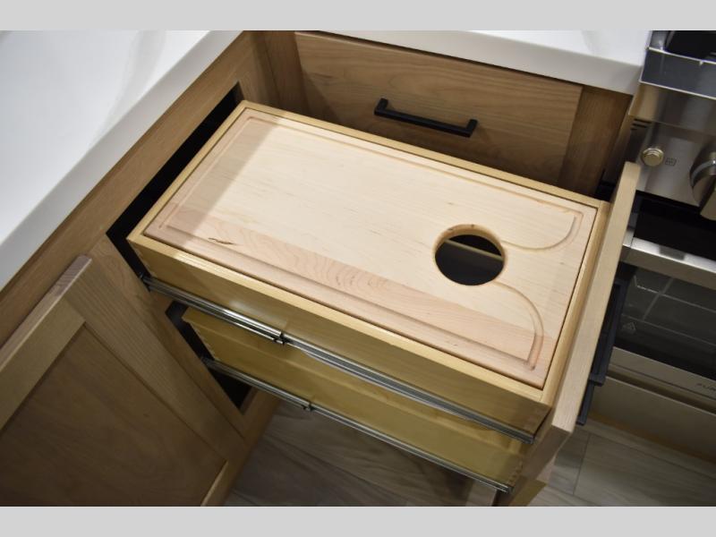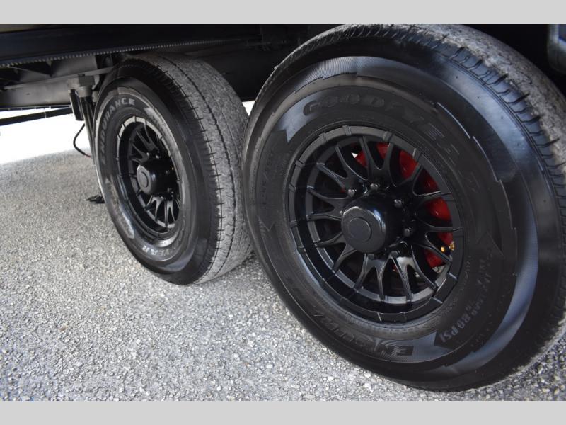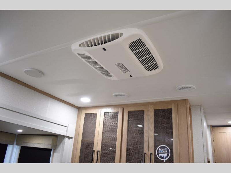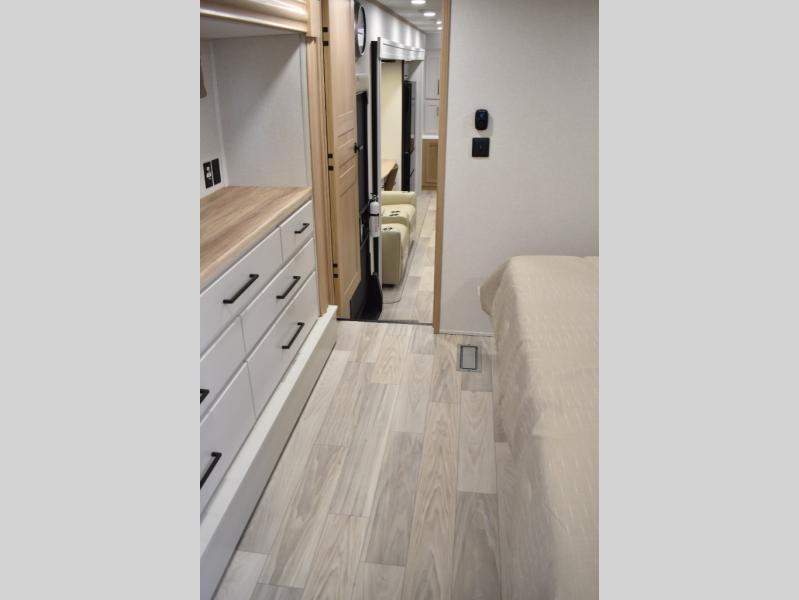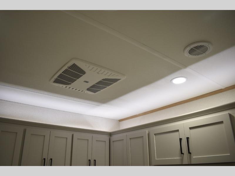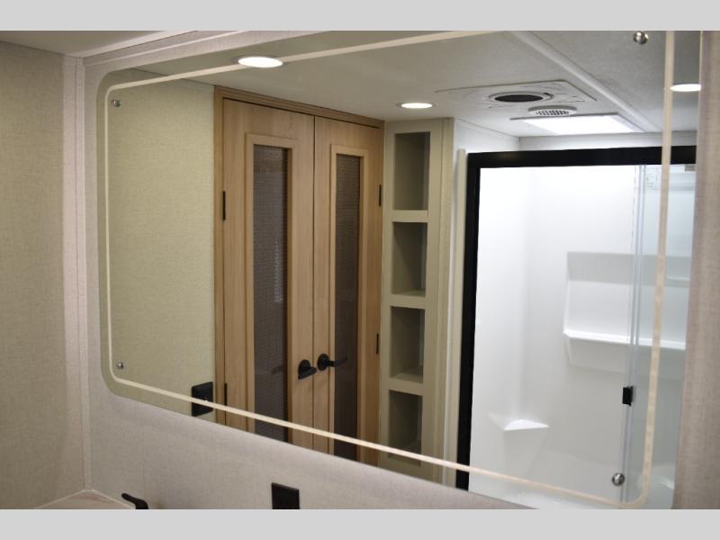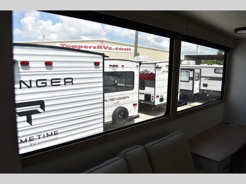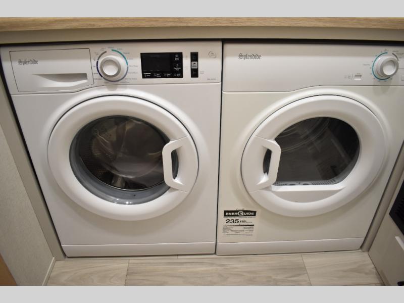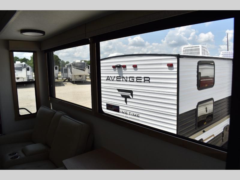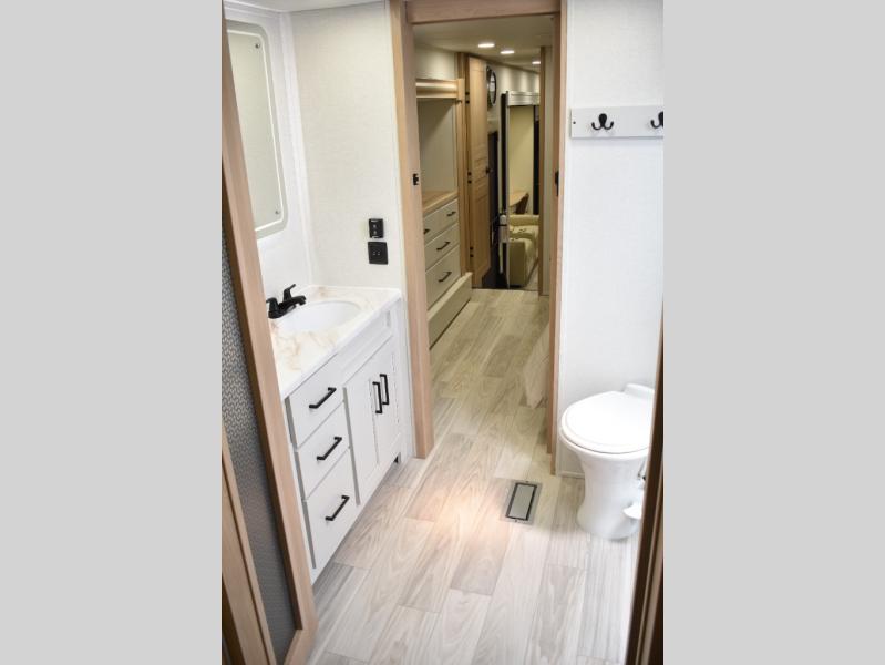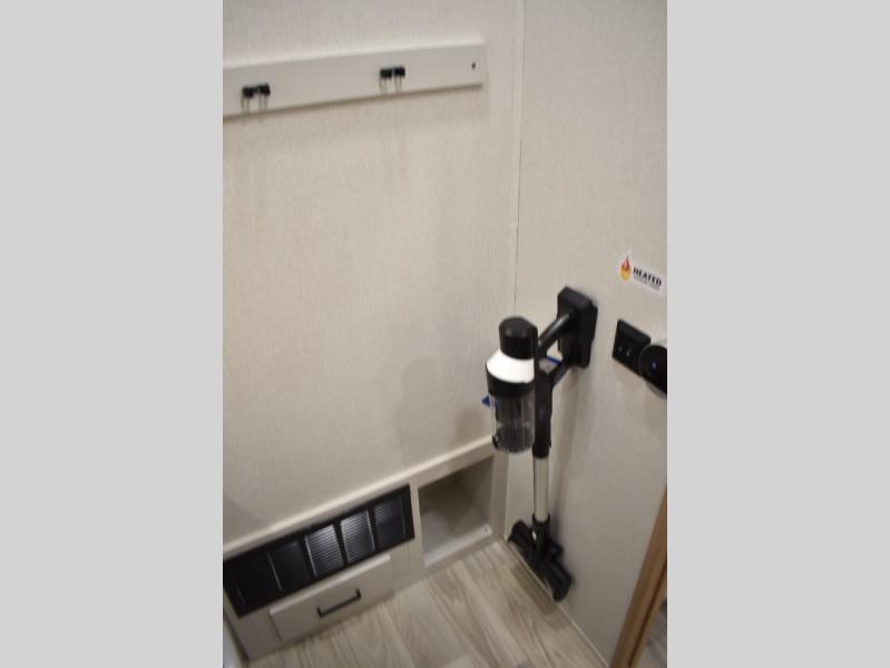 If you're looking to go full-time RVing, this fifth wheel is packed with convenient features! The master bedroom includes a king bed slide out with USB ports on either side of the bed so you both can charge your phones, and there is a dresser for your folded clothes. You will love the front bathroom with dual bath sinks, a shower with a seat, plus a walk-in closet with shelves! There is a unique middle utility room with washer and dryer prep and a counter that will make a perfect laundry room, or you can utilize this space for storage! Head to the main living area to relax on the theater seating or hide-a-bed sofa, and if you have guests stay over, they can sleep here. There is also an entertainment center with a 50" flat screen TV, but you might just leave that off if you're working at the desk with a chair that is provided. We've saved the best part for last; the kitchen! Here, you'll find ample counter space to prep home-cooked meals, a three burner range with a 24" oven, plus a large counter with barstools where you can enjoy breakfast at each morning. Choosing this fifth wheel is a no-brainer!