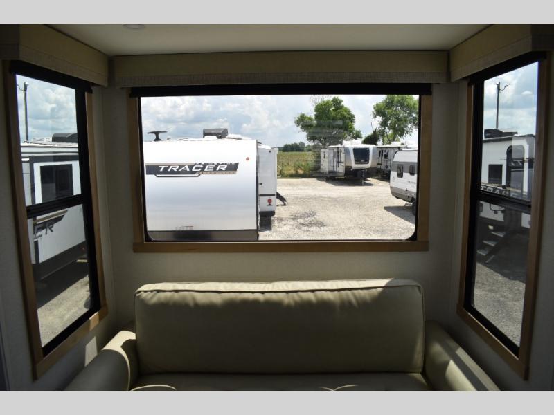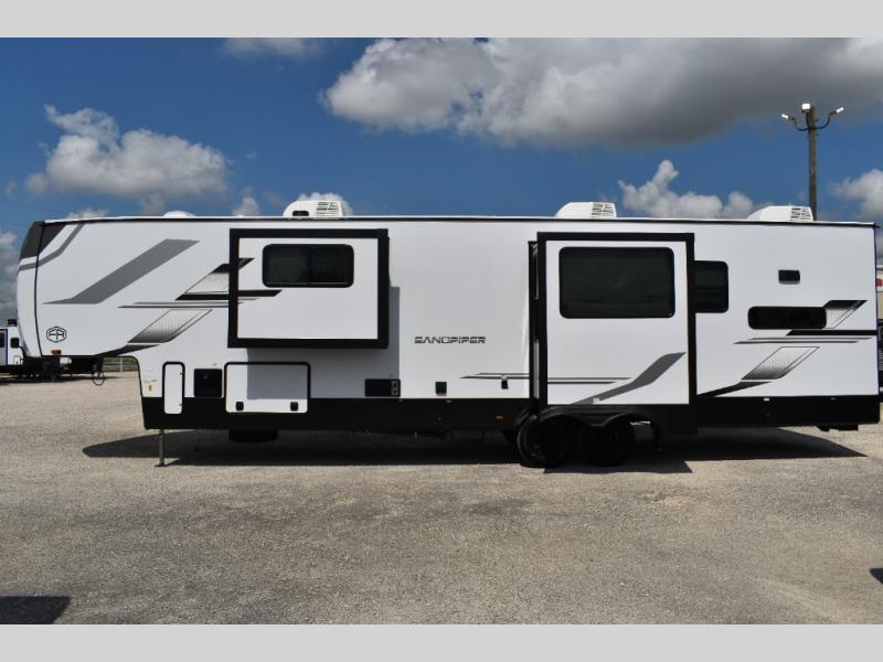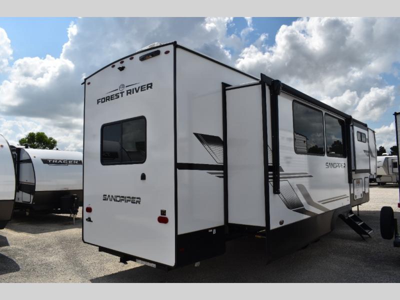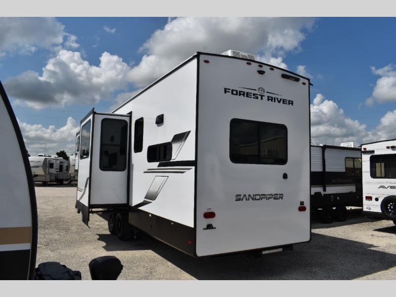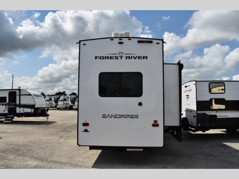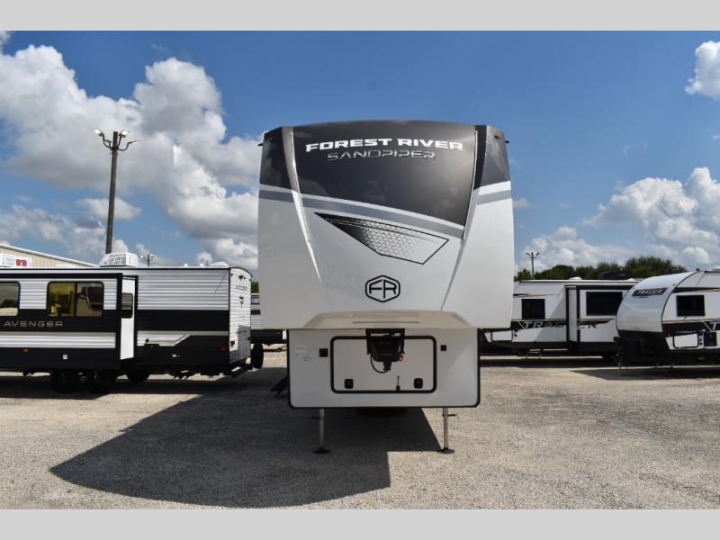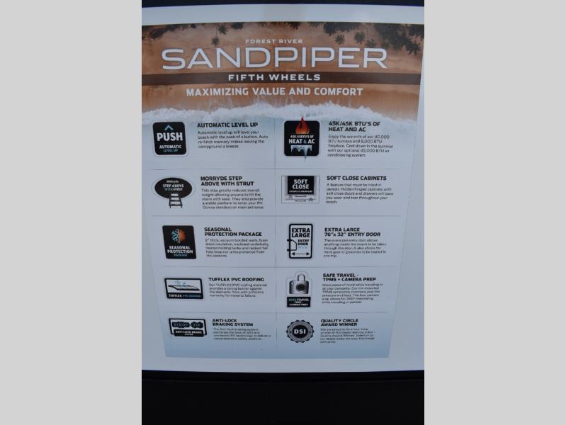 You will find the perfect balance of size, space, features, and luxury with any one of these Forest River Sandpiper fifth wheels! They are constructed with a welded aluminum framed vacuum bonded laminated superstructure, a cambered powder coated frame with rust prohibitor, and a fully enclosed underbelly for added protection against the elements. The large tinted windows come with a 80/20 UV prohibitor or you can choose the optional dual pane windows. Some hassle-free amenities include a 60k BTU on-demand water heater, full coach water filter system, tire pressure monitor system, and an electric leveling system! Inside, you'll enjoy stainless steel appliances, solid surface countertops, Beachside Sundance linoleum, recessed residential lighting, and many more comforts!