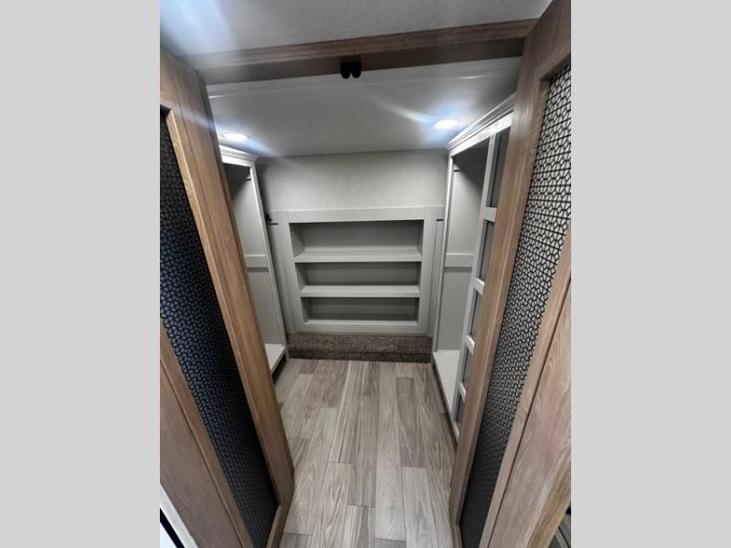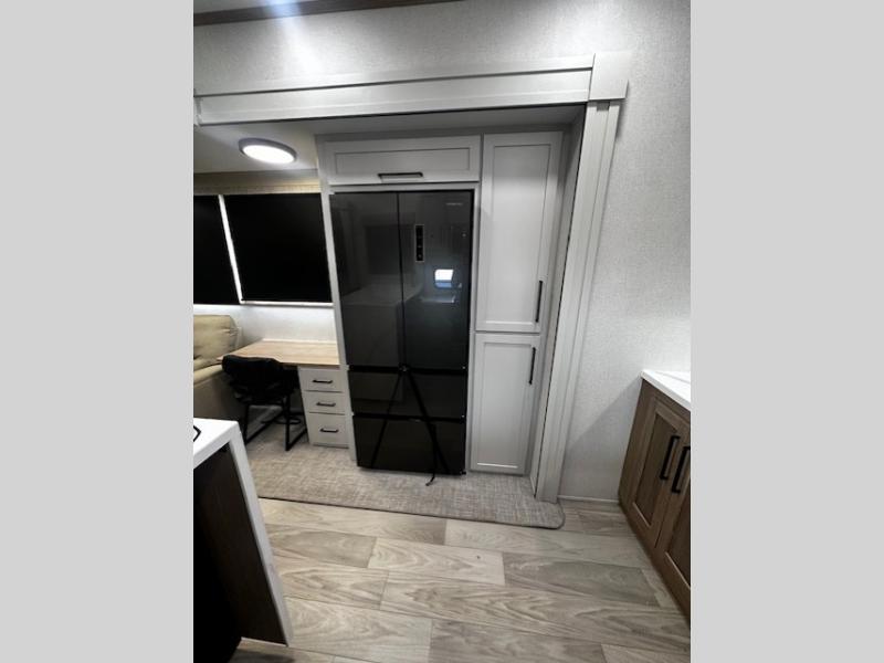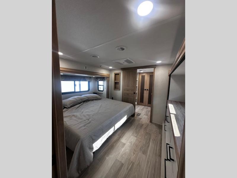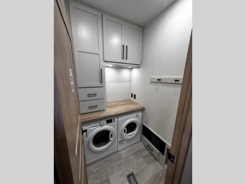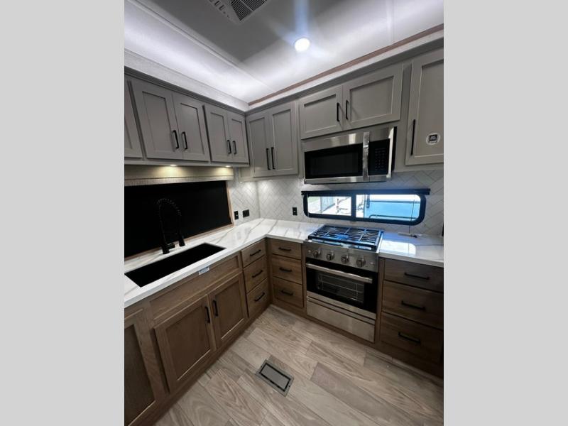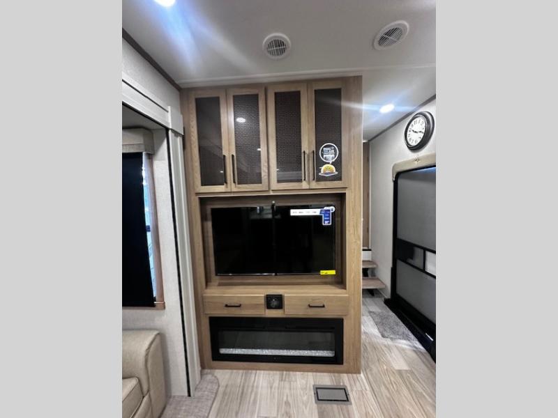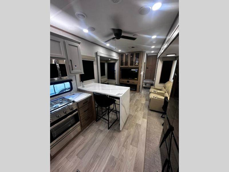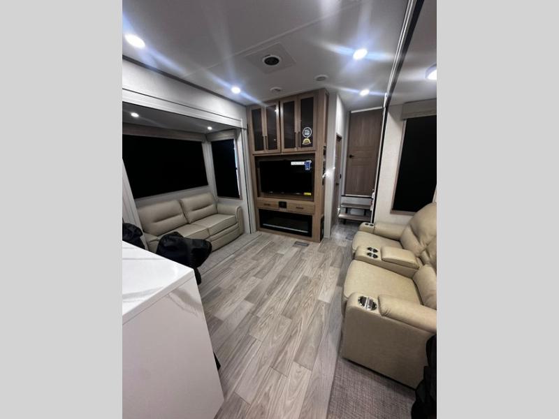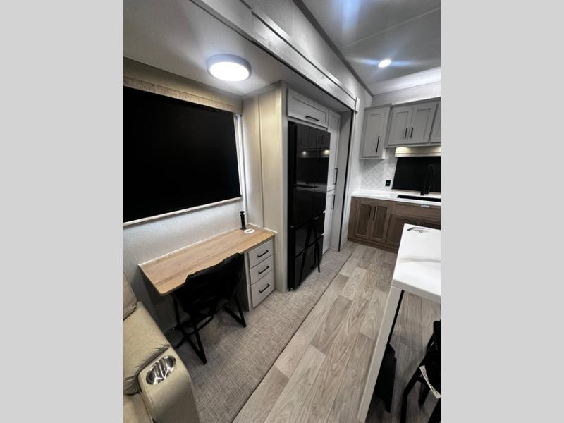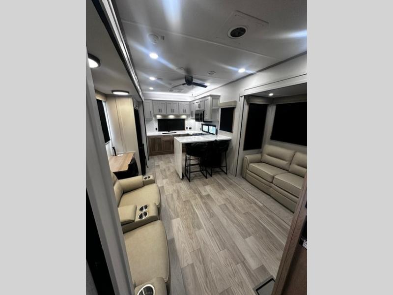 If you're looking to go full-time RVing, this fifth wheel is packed with convenient features! The master bedroom includes a king bed slide out with USB ports on either side of the bed so you both can charge your phones, and there is a dresser for your folded clothes. You will love the front bathroom with dual bath sinks, a shower with a seat, plus a walk-in closet with shelves! There is a unique middle utility room with washer and dryer prep and a counter that will make a perfect laundry room, or you can utilize this space for storage! Head to the main living area to relax on the theater seating or hide-a-bed sofa, and if you have guests stay over, they can sleep here. There is also an entertainment center with a 50" flat screen TV, but you might just leave that off if you're working at the desk with a chair that is provided. We've saved the best part for last; the kitchen! Here, you'll find ample counter space to prep home-cooked meals, a three burner range with a 24" oven, plus a large counter with barstools where you can enjoy breakfast at each morning. Choosing this fifth wheel is a no-brainer!