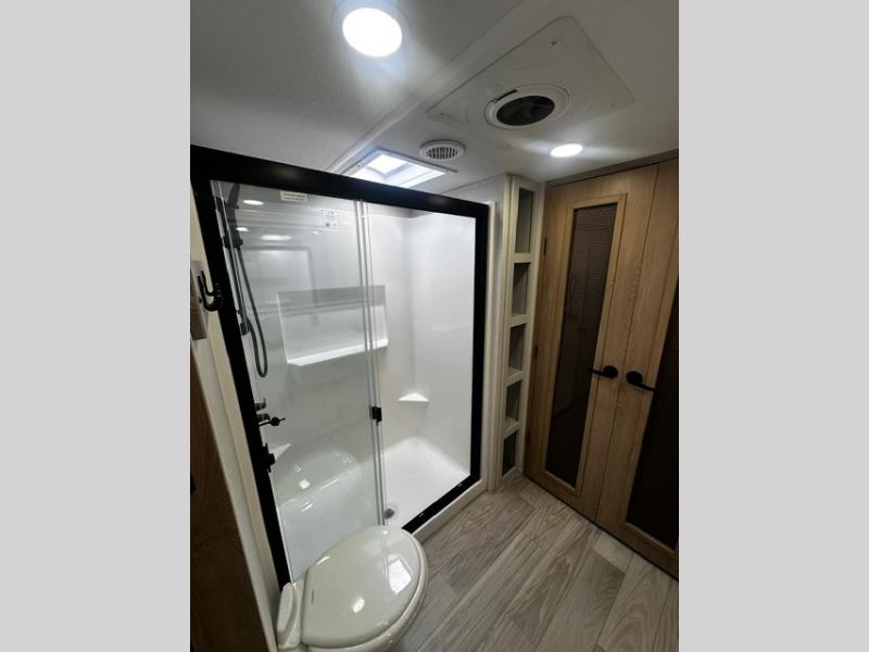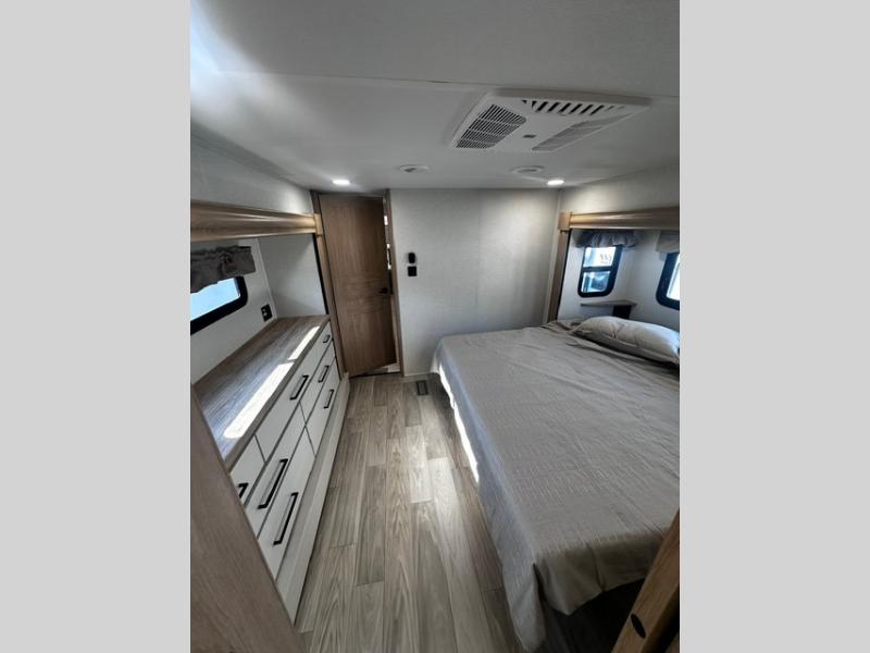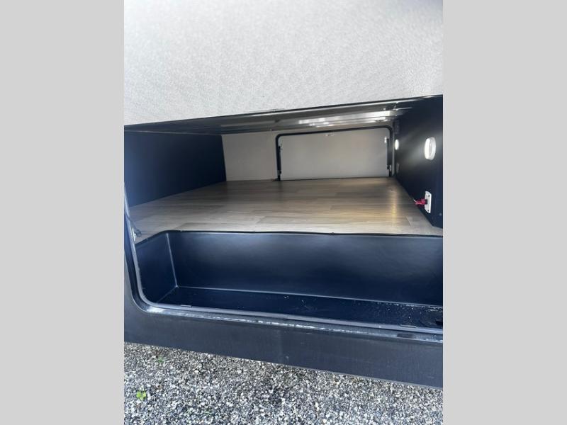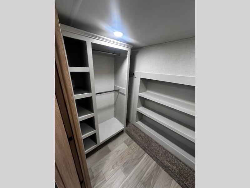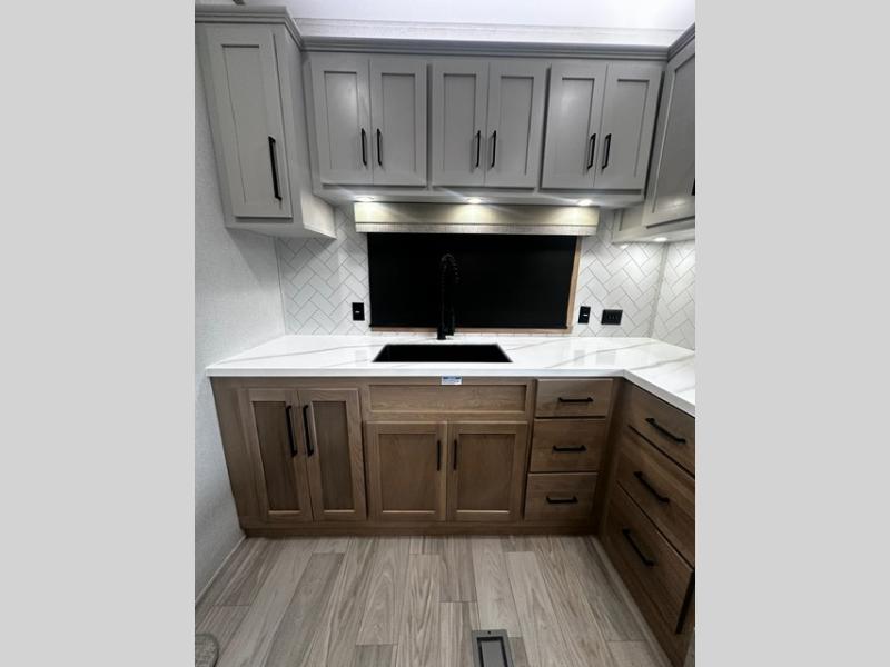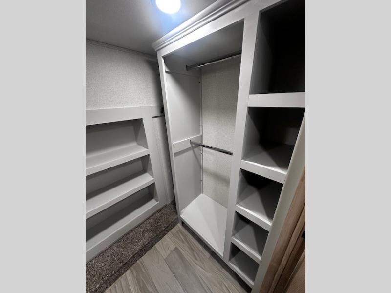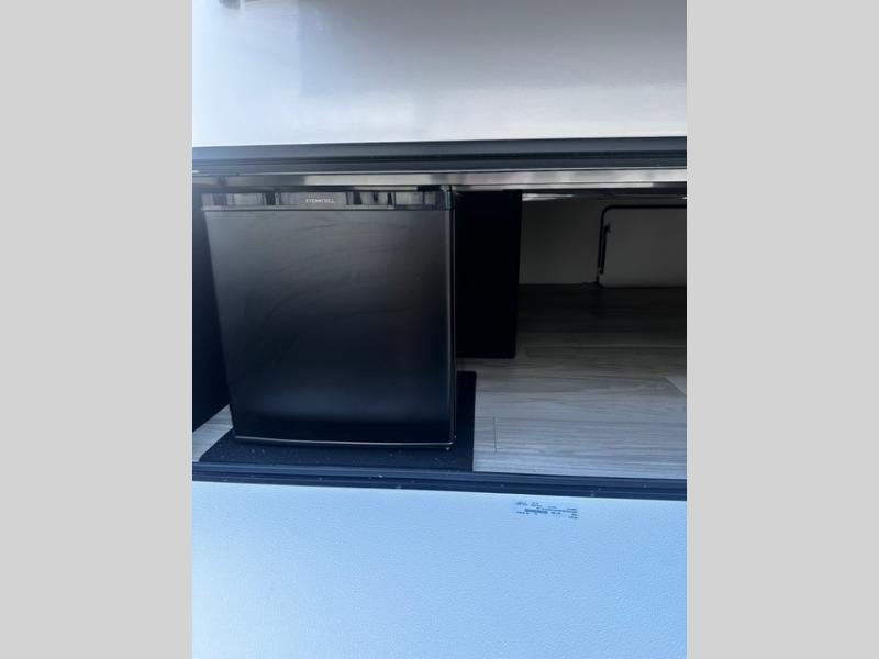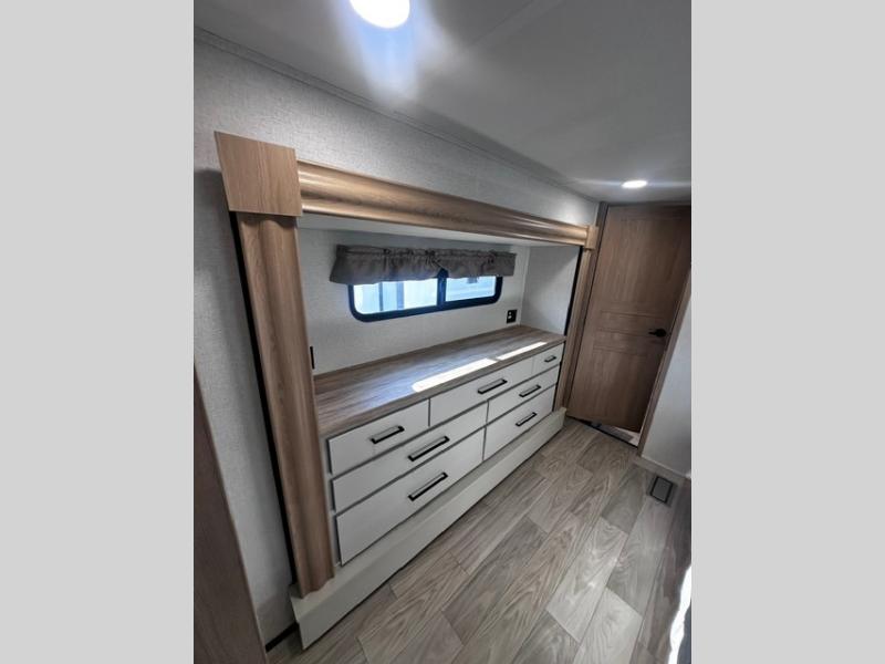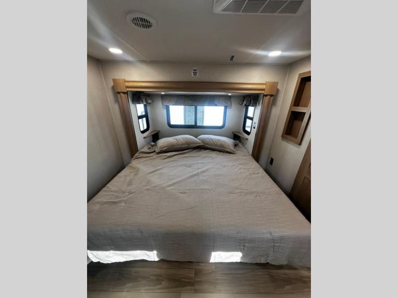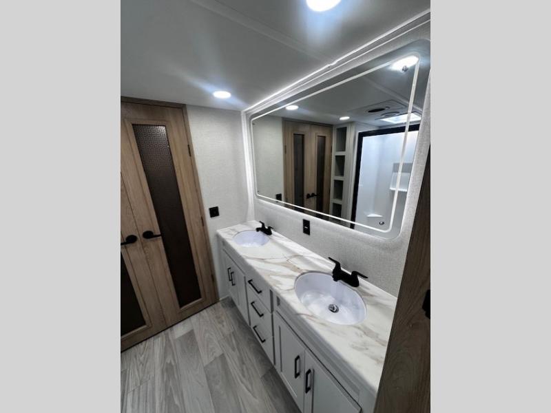 If you're looking to go full-time RVing, this fifth wheel is packed with convenient features! The master bedroom includes a king bed slide out with USB ports on either side of the bed so you both can charge your phones, and there is a dresser for your folded clothes. You will love the front bathroom with dual bath sinks, a shower with a seat, plus a walk-in closet with shelves! There is a unique middle utility room with washer and dryer prep and a counter that will make a perfect laundry room, or you can utilize this space for storage! Head to the main living area to relax on the theater seating or hide-a-bed sofa, and if you have guests stay over, they can sleep here. There is also an entertainment center with a 50" flat screen TV, but you might just leave that off if you're working at the desk with a chair that is provided. We've saved the best part for last; the kitchen! Here, you'll find ample counter space to prep home-cooked meals, a three burner range with a 24" oven, plus a large counter with barstools where you can enjoy breakfast at each morning. Choosing this fifth wheel is a no-brainer!
