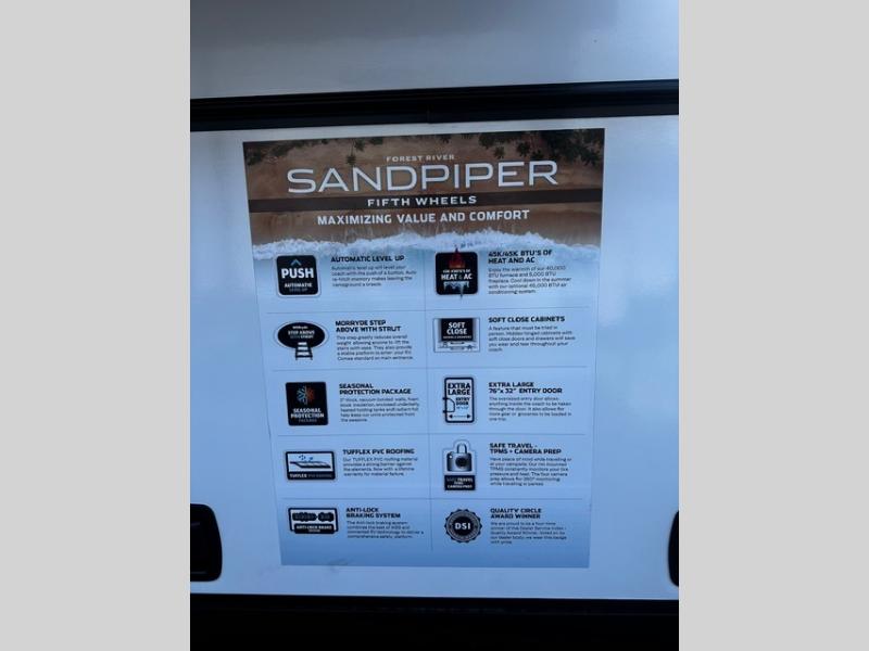 You will find the perfect balance of size, space, features, and luxury with any one of these Forest River Sandpiper fifth wheels! They are constructed with a welded aluminum framed vacuum bonded laminated superstructure, a cambered powder coated frame with rust prohibitor, and a fully enclosed underbelly for added protection against the elements. The large tinted windows come with a 80/20 UV prohibitor or you can choose the optional dual pane windows. Some hassle-free amenities include a 60k BTU on-demand water heater, full coach water filter system, tire pressure monitor system, and an electric leveling system! Inside, you'll enjoy stainless steel appliances, solid surface countertops, Beachside Sundance linoleum, recessed residential lighting, and many more comforts!