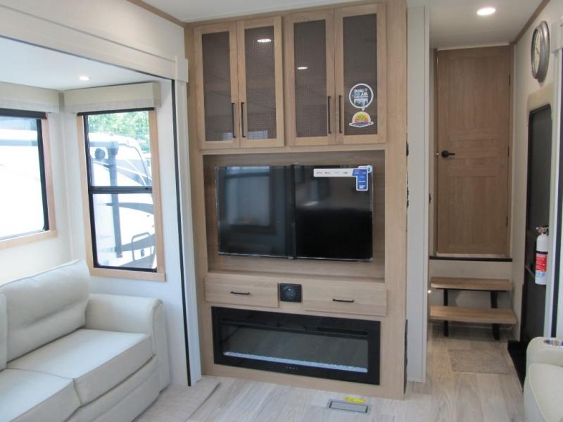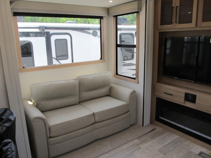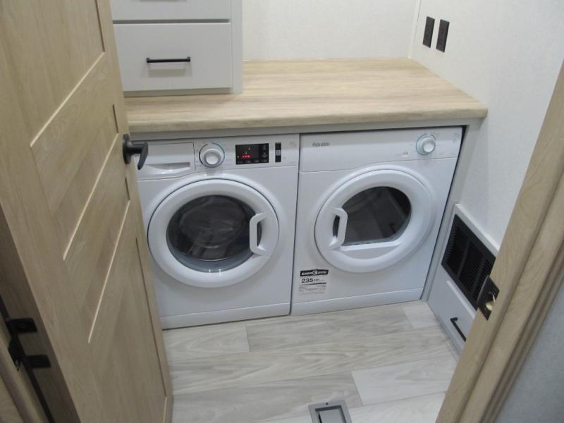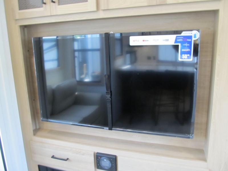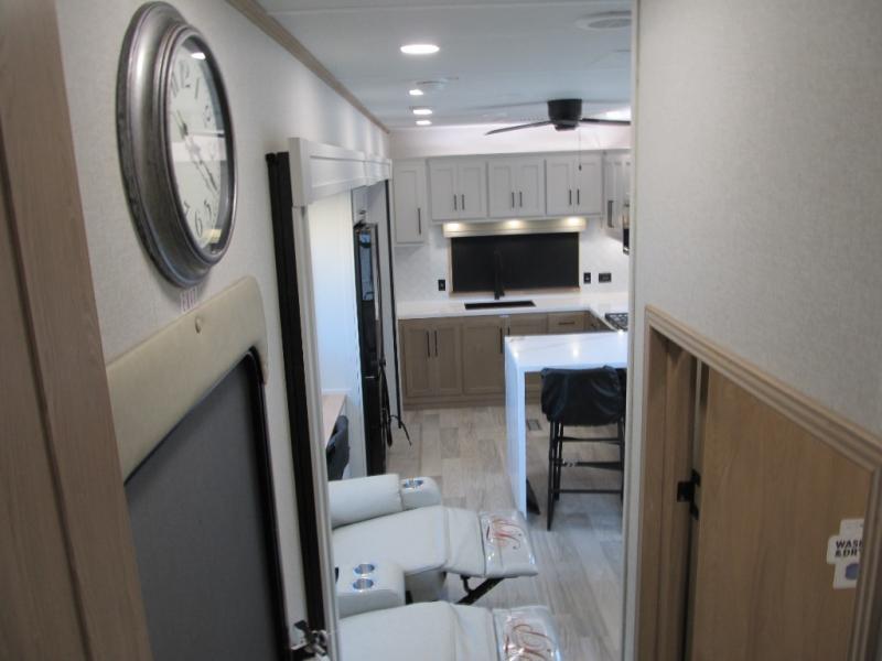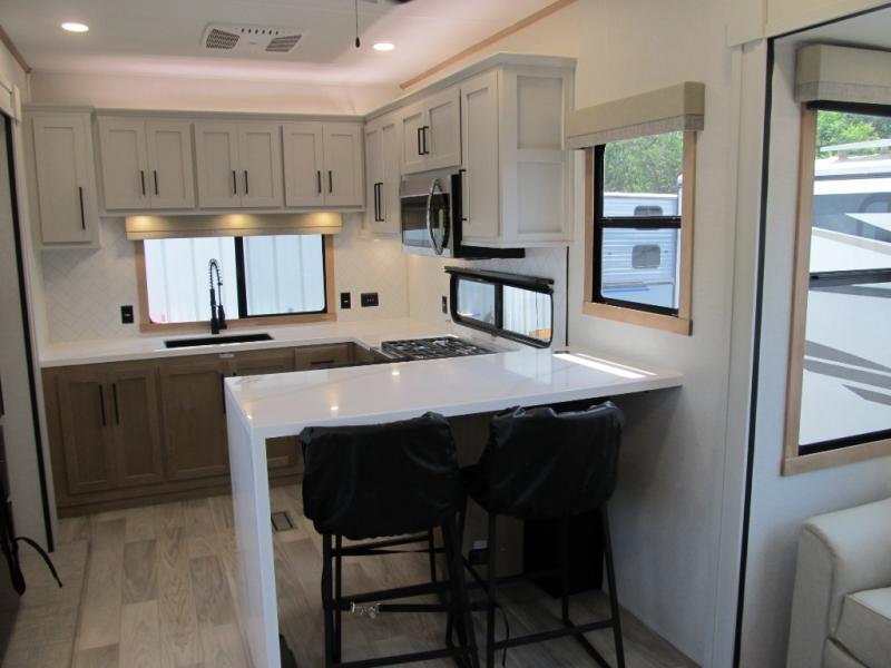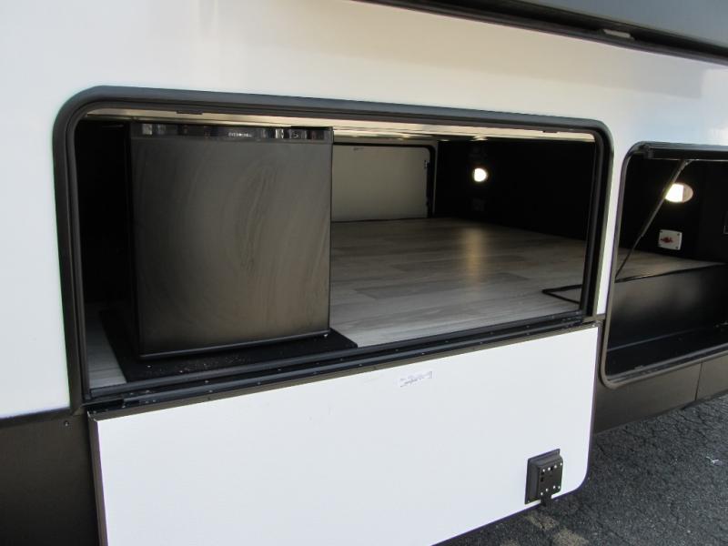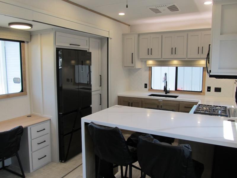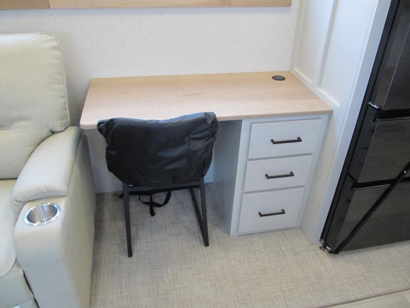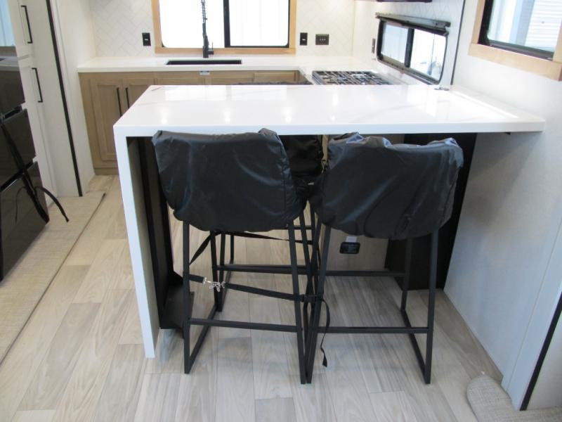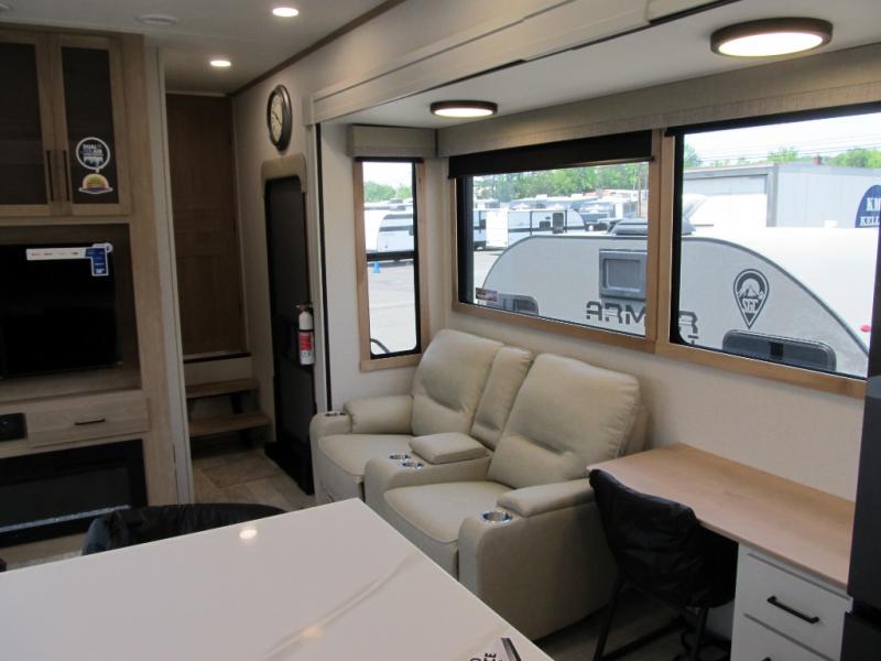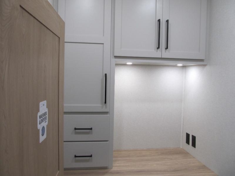 If you're looking to go full-time RVing, this fifth wheel is packed with convenient features! The master bedroom includes a king bed slide out with USB ports on either side of the bed so you both can charge your phones, and there is a dresser for your folded clothes. You will love the front bathroom with dual bath sinks, a shower with a seat, plus a walk-in closet with shelves! There is a unique middle utility room with washer and dryer prep and a counter that will make a perfect laundry room, or you can utilize this space for storage! Head to the main living area to relax on the theater seating or hide-a-bed sofa, and if you have guests stay over, they can sleep here. There is also an entertainment center with a 50" flat screen TV, but you might just leave that off if you're working at the desk with a chair that is provided. We've saved the best part for last; the kitchen! Here, you'll find ample counter space to prep home-cooked meals, a three burner range with a 24" oven, plus a large counter with barstools where you can enjoy breakfast at each morning. Choosing this fifth wheel is a no-brainer!