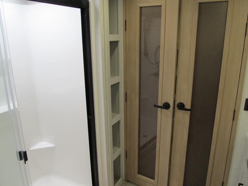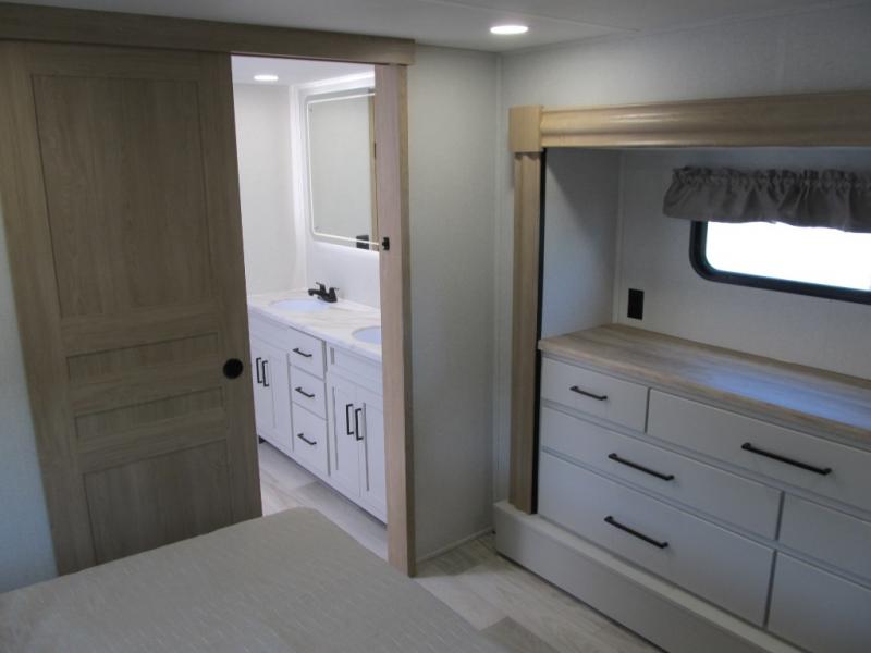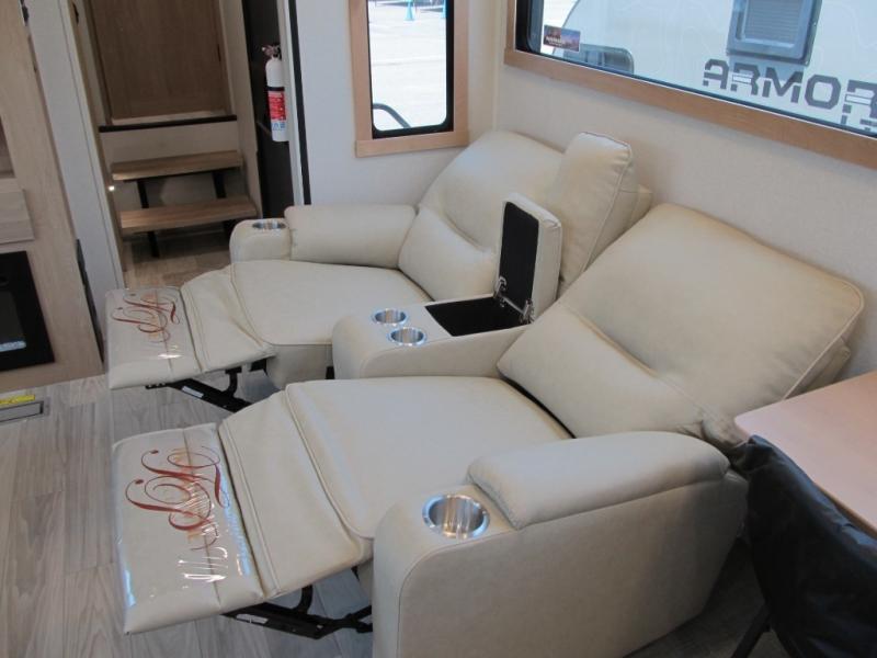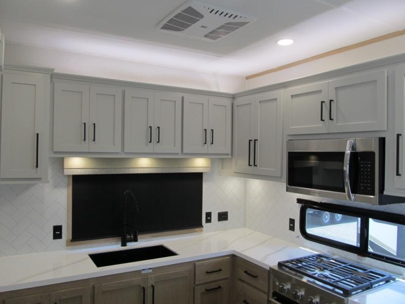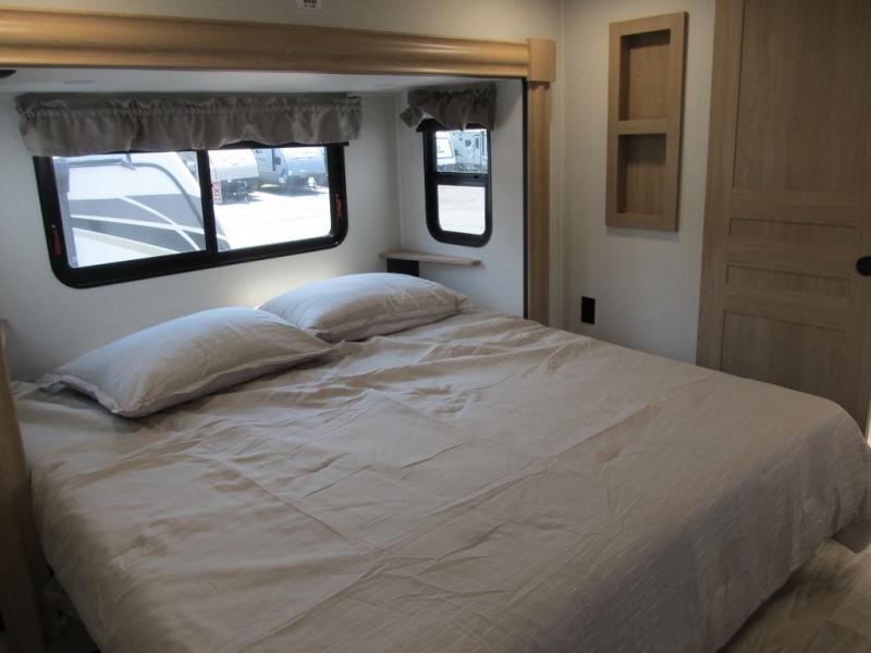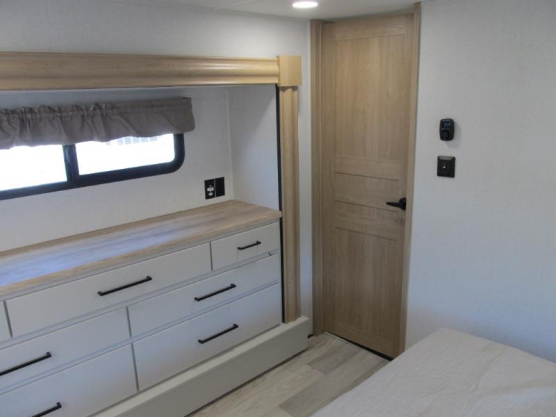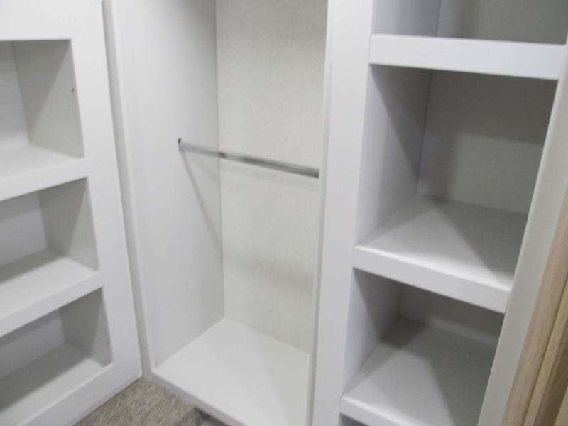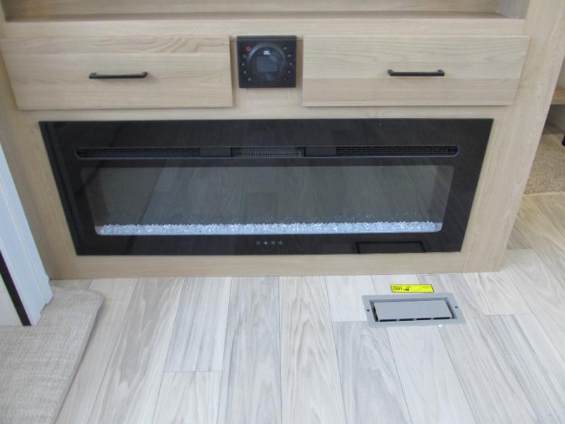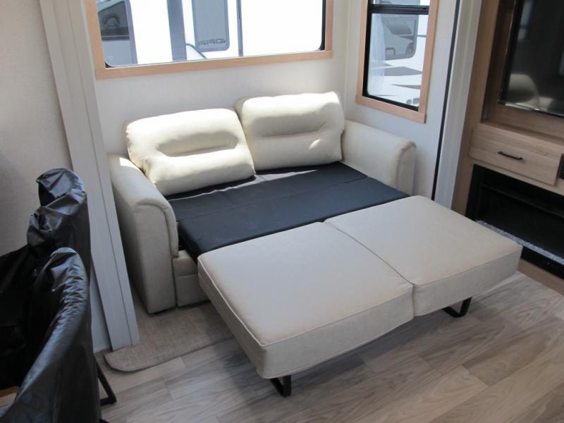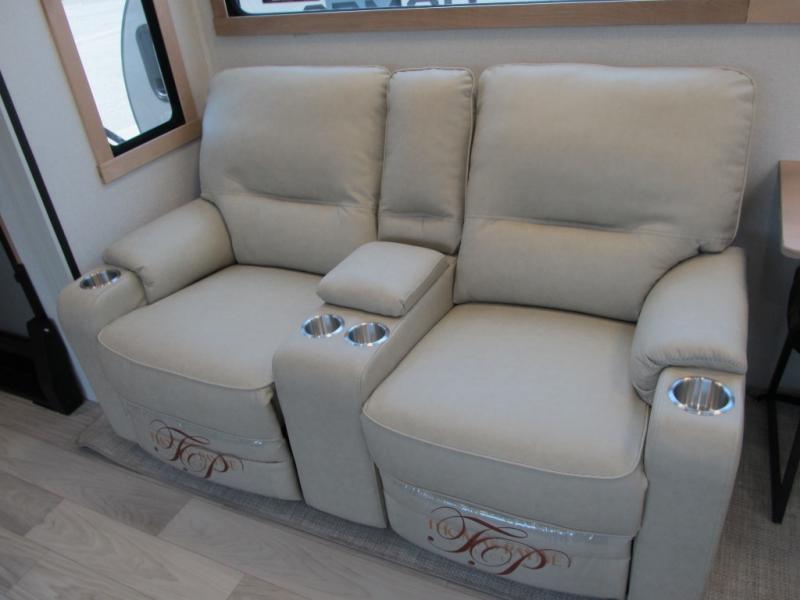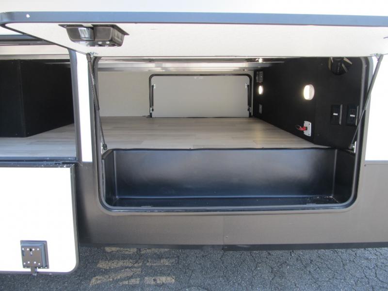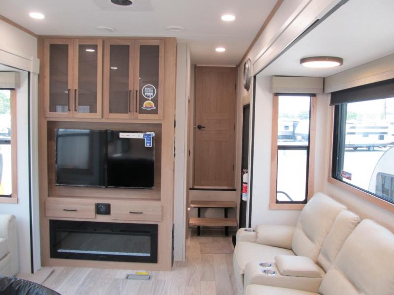 If you're looking to go full-time RVing, this fifth wheel is packed with convenient features! The master bedroom includes a king bed slide out with USB ports on either side of the bed so you both can charge your phones, and there is a dresser for your folded clothes. You will love the front bathroom with dual bath sinks, a shower with a seat, plus a walk-in closet with shelves! There is a unique middle utility room with washer and dryer prep and a counter that will make a perfect laundry room, or you can utilize this space for storage! Head to the main living area to relax on the theater seating or hide-a-bed sofa, and if you have guests stay over, they can sleep here. There is also an entertainment center with a 50" flat screen TV, but you might just leave that off if you're working at the desk with a chair that is provided. We've saved the best part for last; the kitchen! Here, you'll find ample counter space to prep home-cooked meals, a three burner range with a 24" oven, plus a large counter with barstools where you can enjoy breakfast at each morning. Choosing this fifth wheel is a no-brainer!