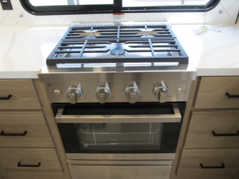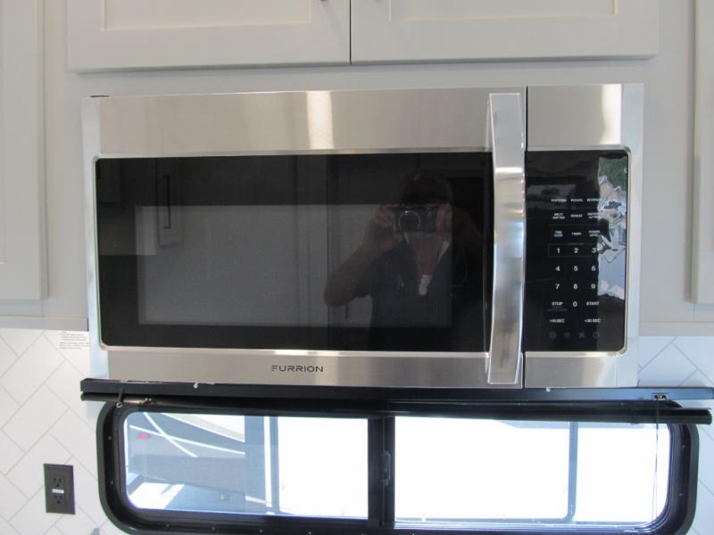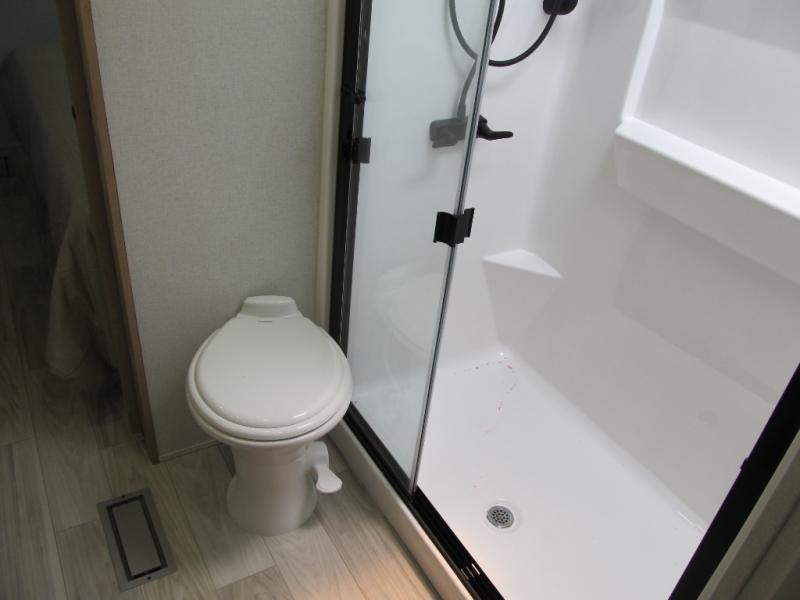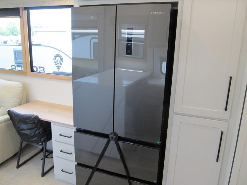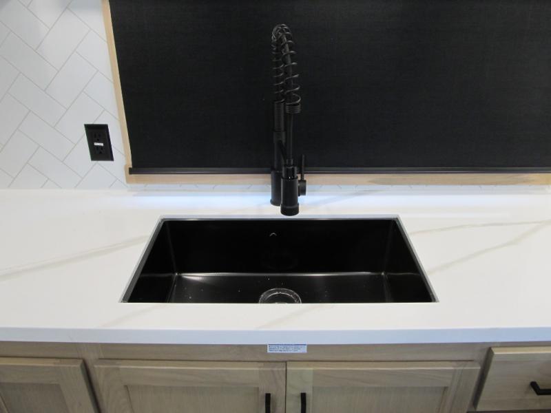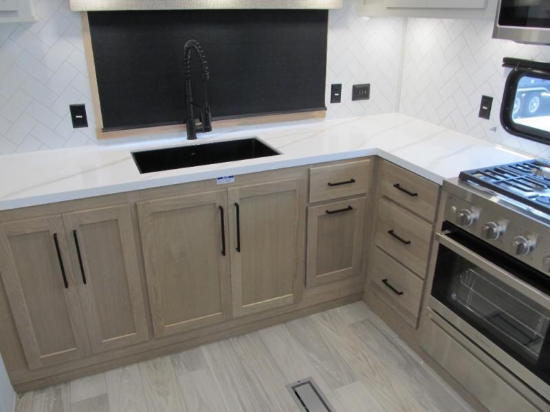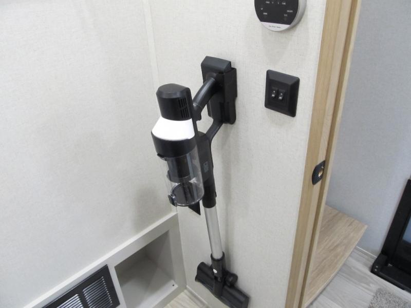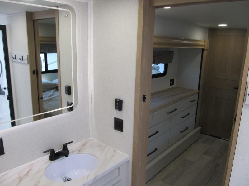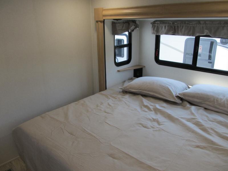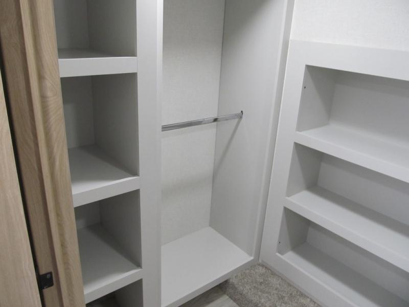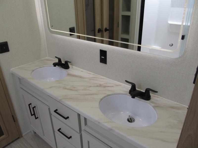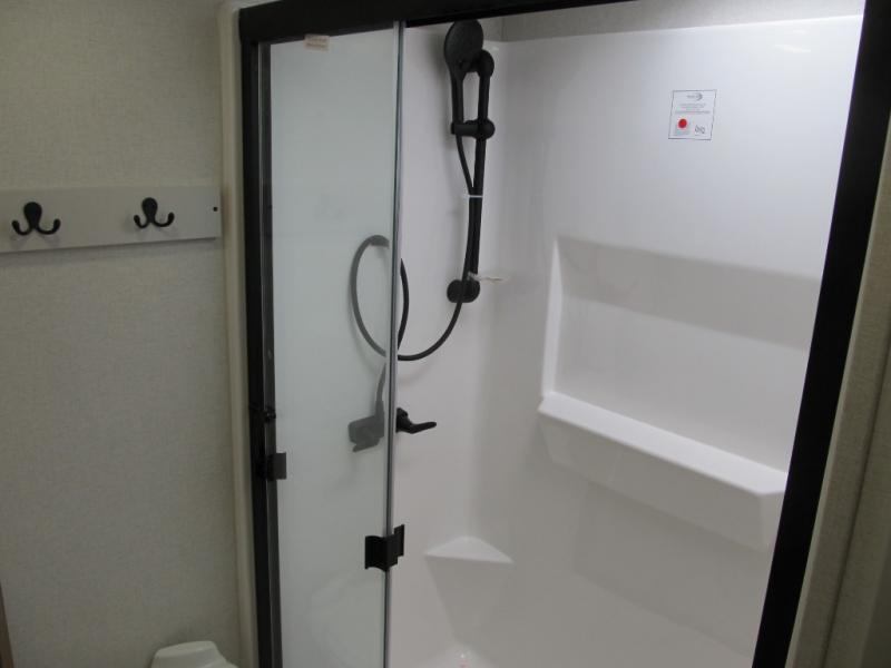If you're looking to go full-time RVing, this fifth wheel is packed with convenient features! The master bedroom includes a king bed slide out with USB ports on either side of the bed so you both can charge your phones, and there is a dresser for your folded clothes. You will love the front bathroom with dual bath sinks, a shower with a seat, plus a walk-in closet with shelves! There is a unique middle utility room with washer and dryer prep and a counter that will make a perfect laundry room, or you can utilize this space for storage! Head to the main living area to relax on the theater seating or hide-a-bed sofa, and if you have guests stay over, they can sleep here. There is also an entertainment center with a 50" flat screen TV, but you might just leave that off if you're working at the desk with a chair that is provided. We've saved the best part for last; the kitchen! Here, you'll find ample counter space to prep home-cooked meals, a three burner range with a 24" oven, plus a large counter with barstools where you can enjoy breakfast at each morning. Choosing this fifth wheel is a no-brainer!
