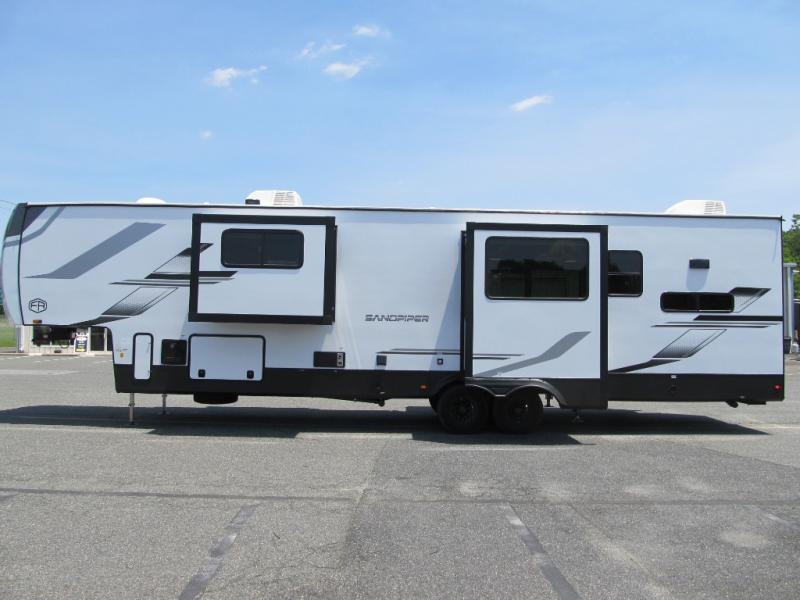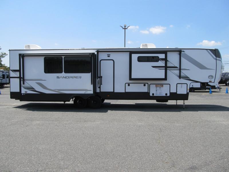 You will find the perfect balance of size, space, features, and luxury with any one of these Forest River Sandpiper fifth wheels! They are constructed with a welded aluminum framed vacuum bonded laminated superstructure, a cambered powder coated frame with rust prohibitor, and a fully enclosed underbelly for added protection against the elements. The large tinted windows come with a 80/20 UV prohibitor or you can choose the optional dual pane windows. Some hassle-free amenities include a 60k BTU on-demand water heater, full coach water filter system, tire pressure monitor system, and an electric leveling system! Inside, you'll enjoy stainless steel appliances, solid surface countertops, Beachside Sundance linoleum, recessed residential lighting, and many more comforts!