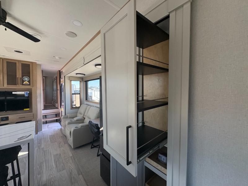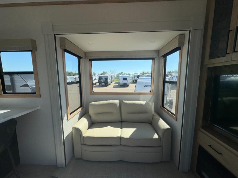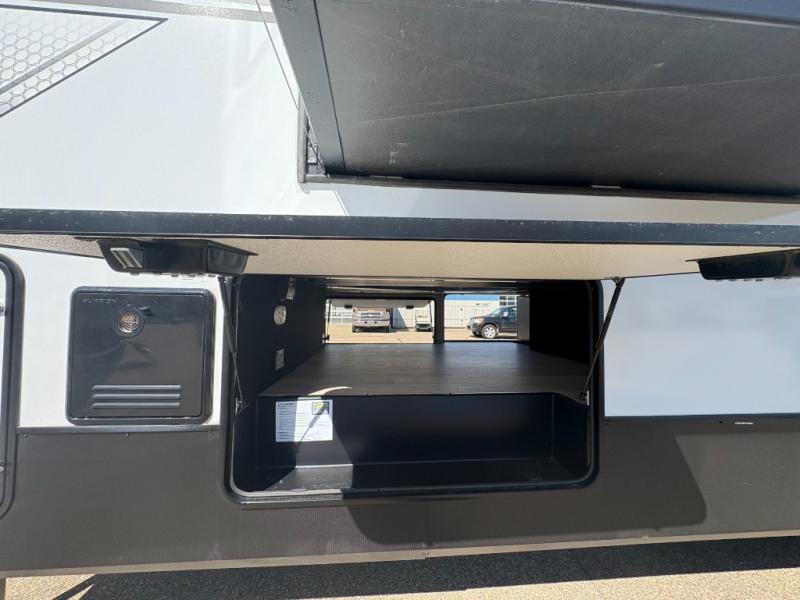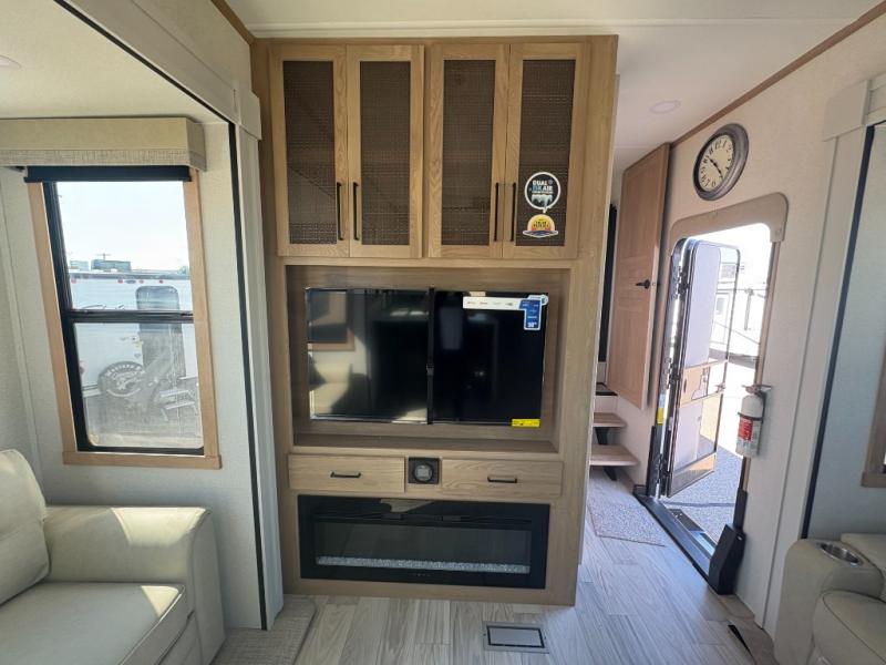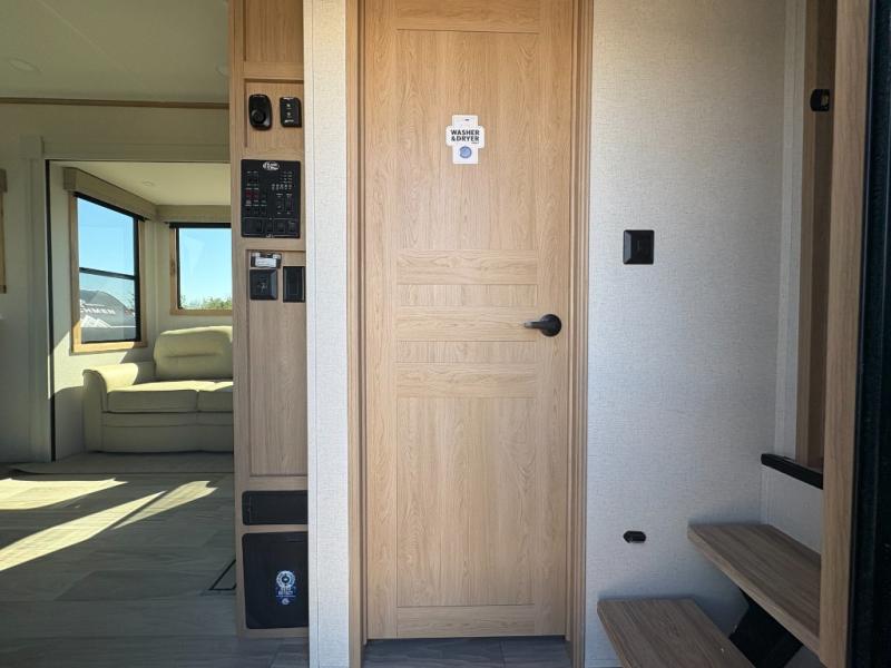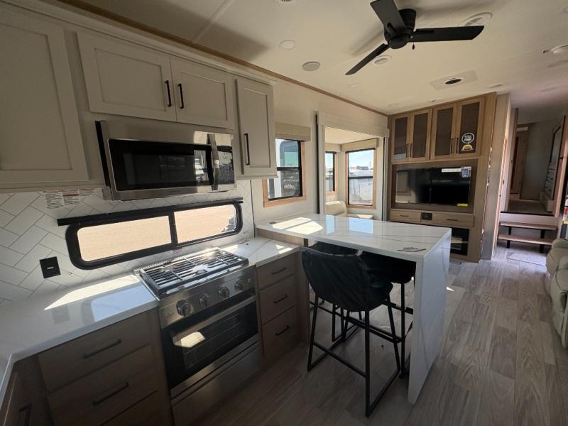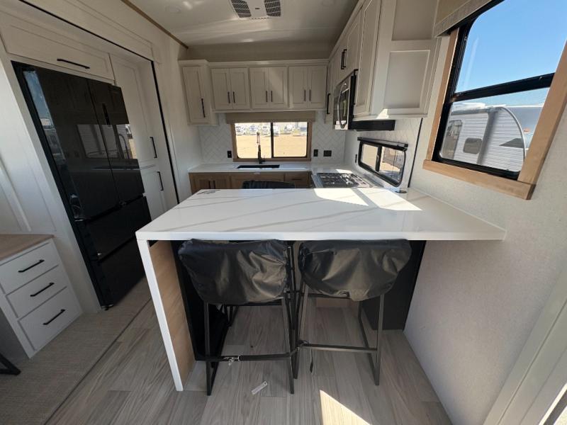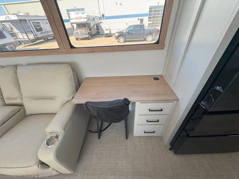If you're looking to go full-time RVing, this fifth wheel is packed with convenient features! The master bedroom includes a king bed slide out with USB ports on either side of the bed so you both can charge your phones, and there is a dresser for your folded clothes. You will love the front bathroom with dual bath sinks, a shower with a seat, plus a walk-in closet with shelves! There is a unique middle utility room with washer and dryer prep and a counter that will make a perfect laundry room, or you can utilize this space for storage! Head to the main living area to relax on the theater seating or hide-a-bed sofa, and if you have guests stay over, they can sleep here. There is also an entertainment center with a 50" flat screen TV, but you might just leave that off if you're working at the desk with a chair that is provided. We've saved the best part for last; the kitchen! Here, you'll find ample counter space to prep home-cooked meals, a three burner range with a 24" oven, plus a large counter with barstools where you can enjoy breakfast at each morning. Choosing this fifth wheel is a no-brainer!